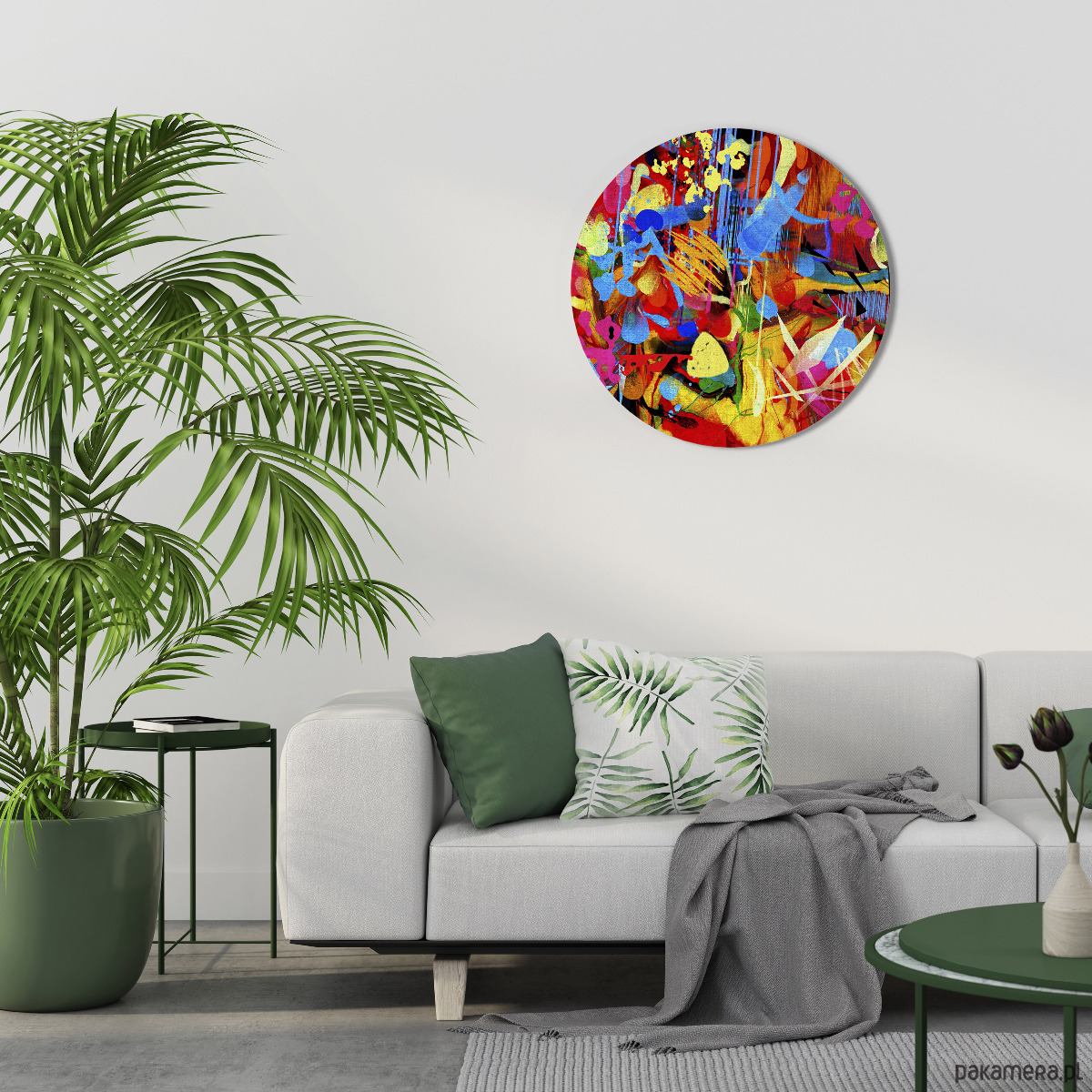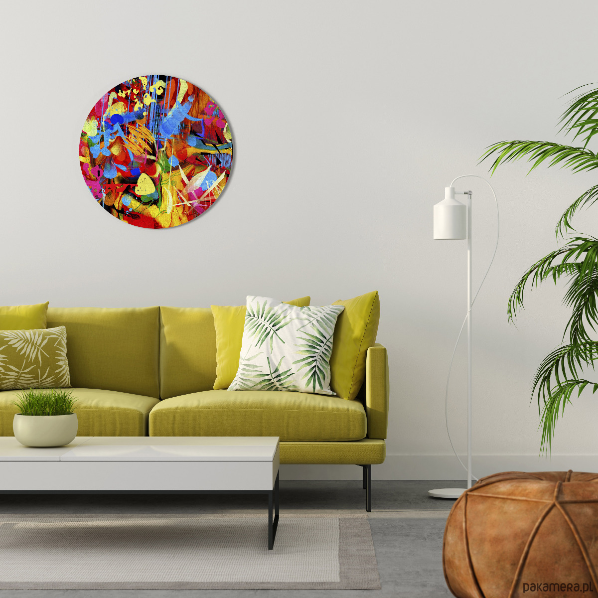 Wprowadź do swojego wnętrza wyjątkowy charakter dzięki eleganckiemu okrągłemu obrazowi. To nowoczesna dekoracja ścienna, która idealnie komponuje się z różnymi stylami aranżacji – od minimalistycznych, przez klasyczne, aż po boho.