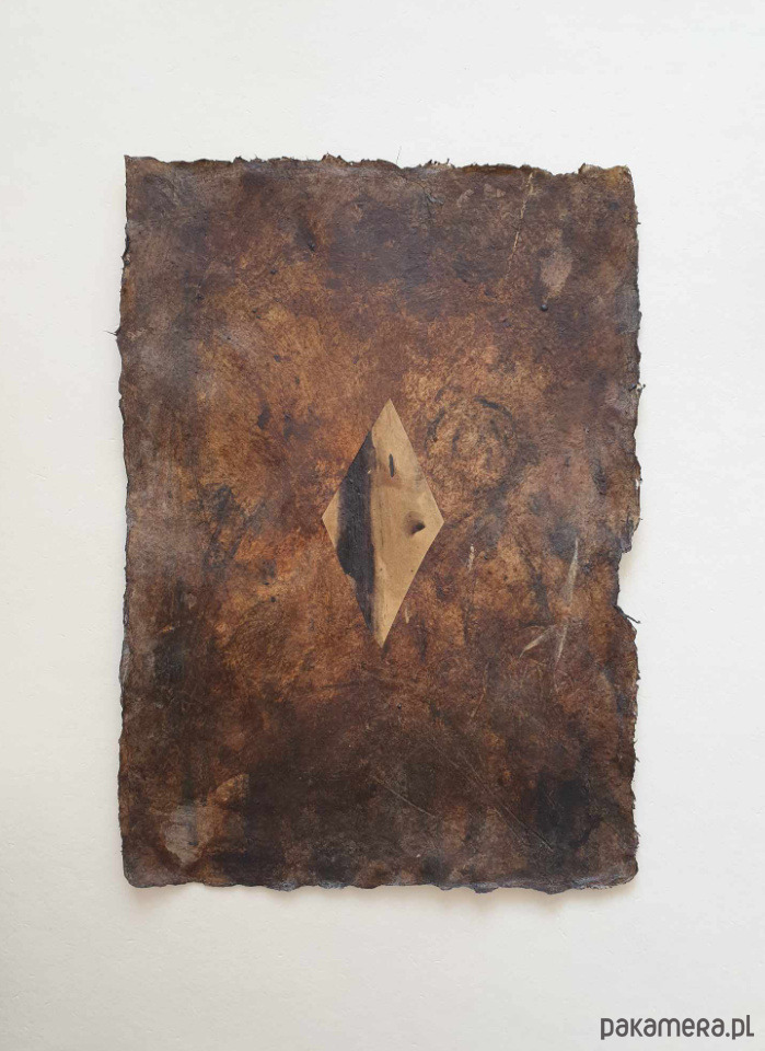 Abstrakcja, technika mieszana: pigmenty ziemne, akryl, węgiel, pastele, ołówek, na papierze ręcznie czerpanym.