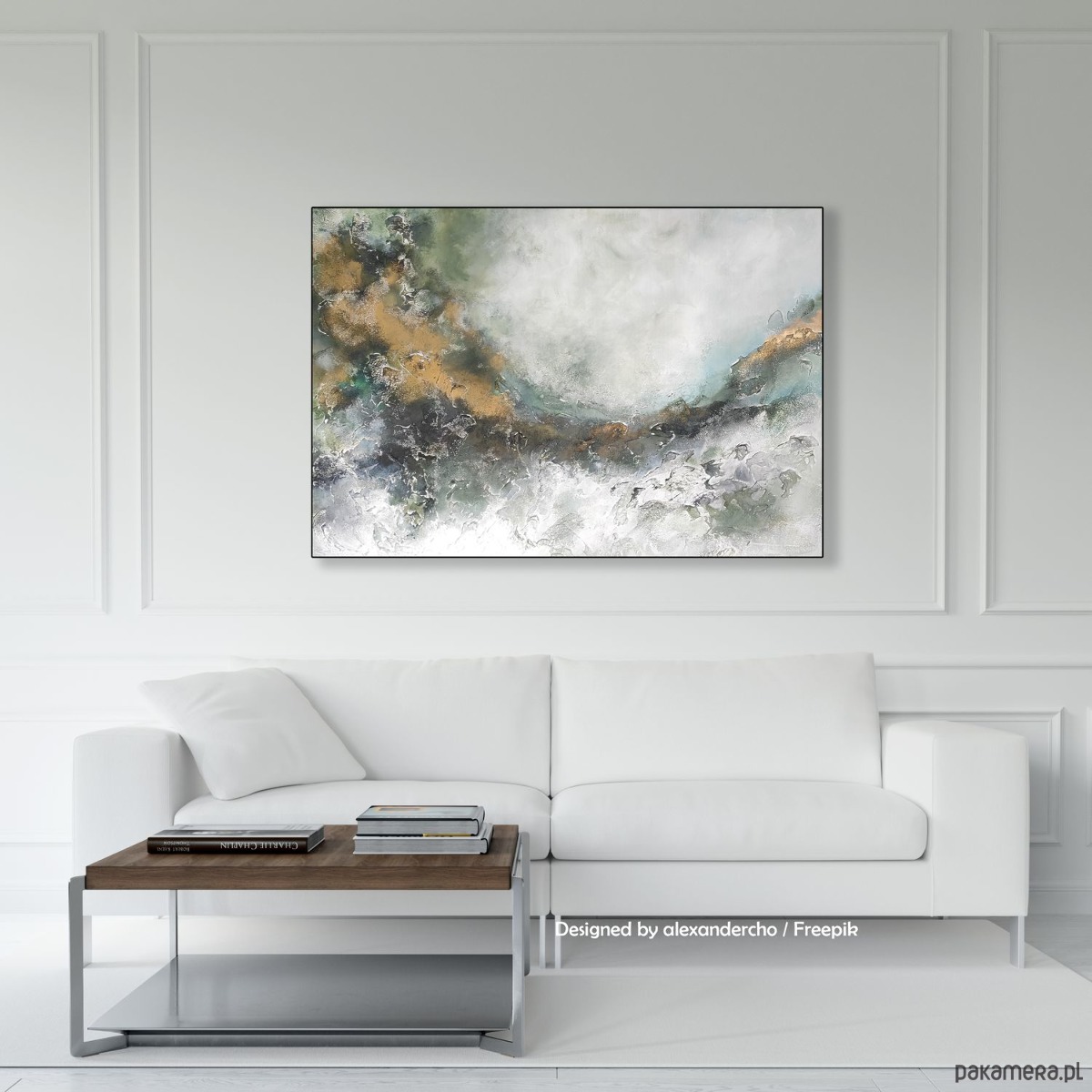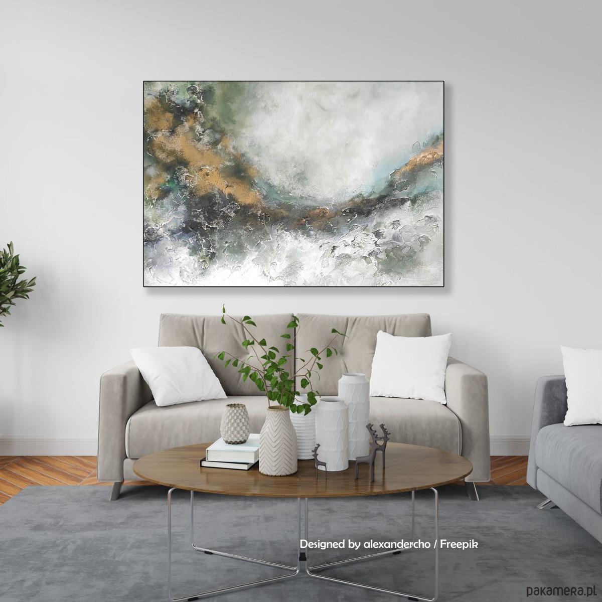 Kolorystyka: zieleń, delikatna szarość, złoto, biel.