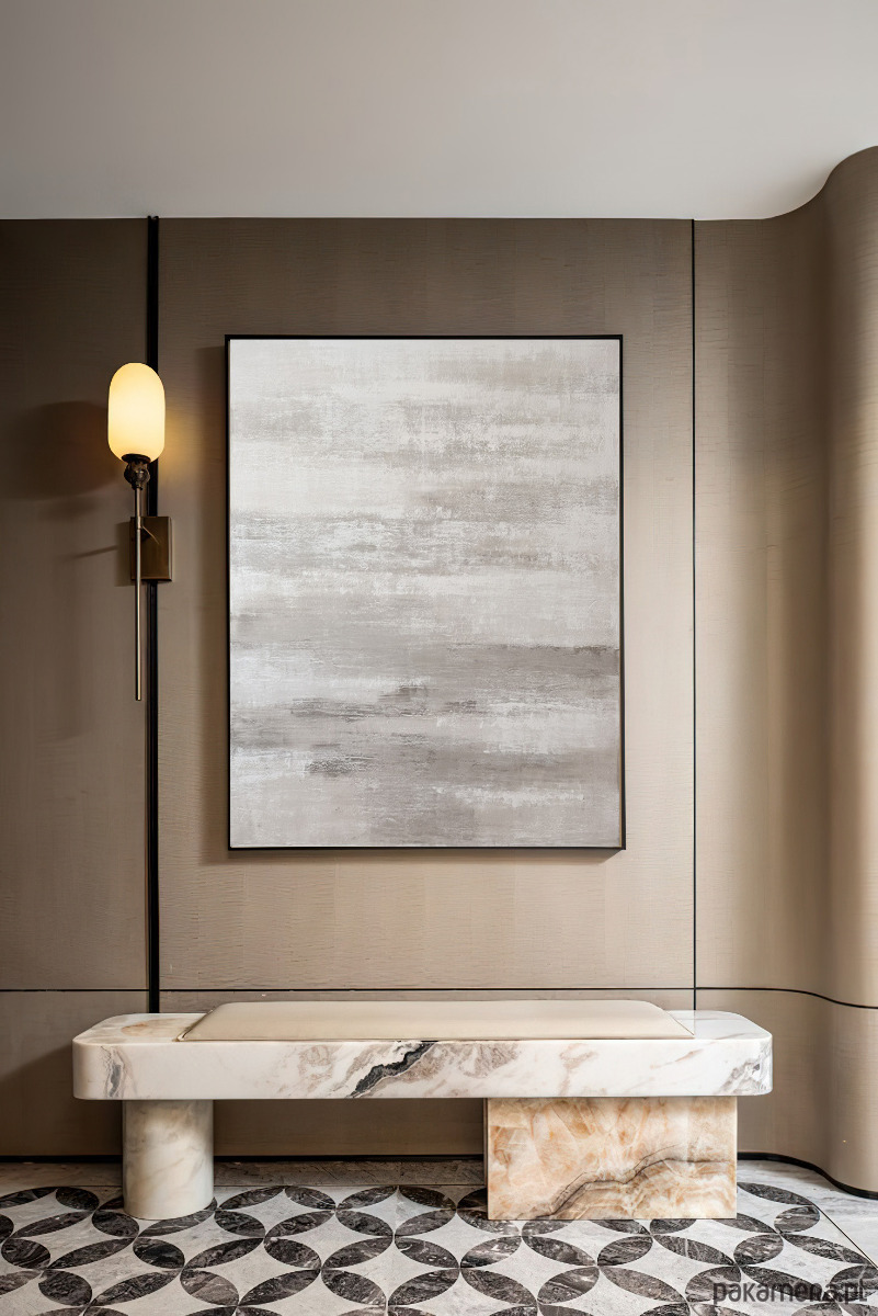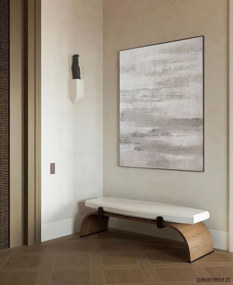 Miękkie przejścia tonalne, subtelna faktura i stonowana paleta beży oraz brązów tworzą obraz, który oddycha razem z przestrzenią. Jest tłem, ale świadomym. Obecnym, lecz nienarzucającym się.