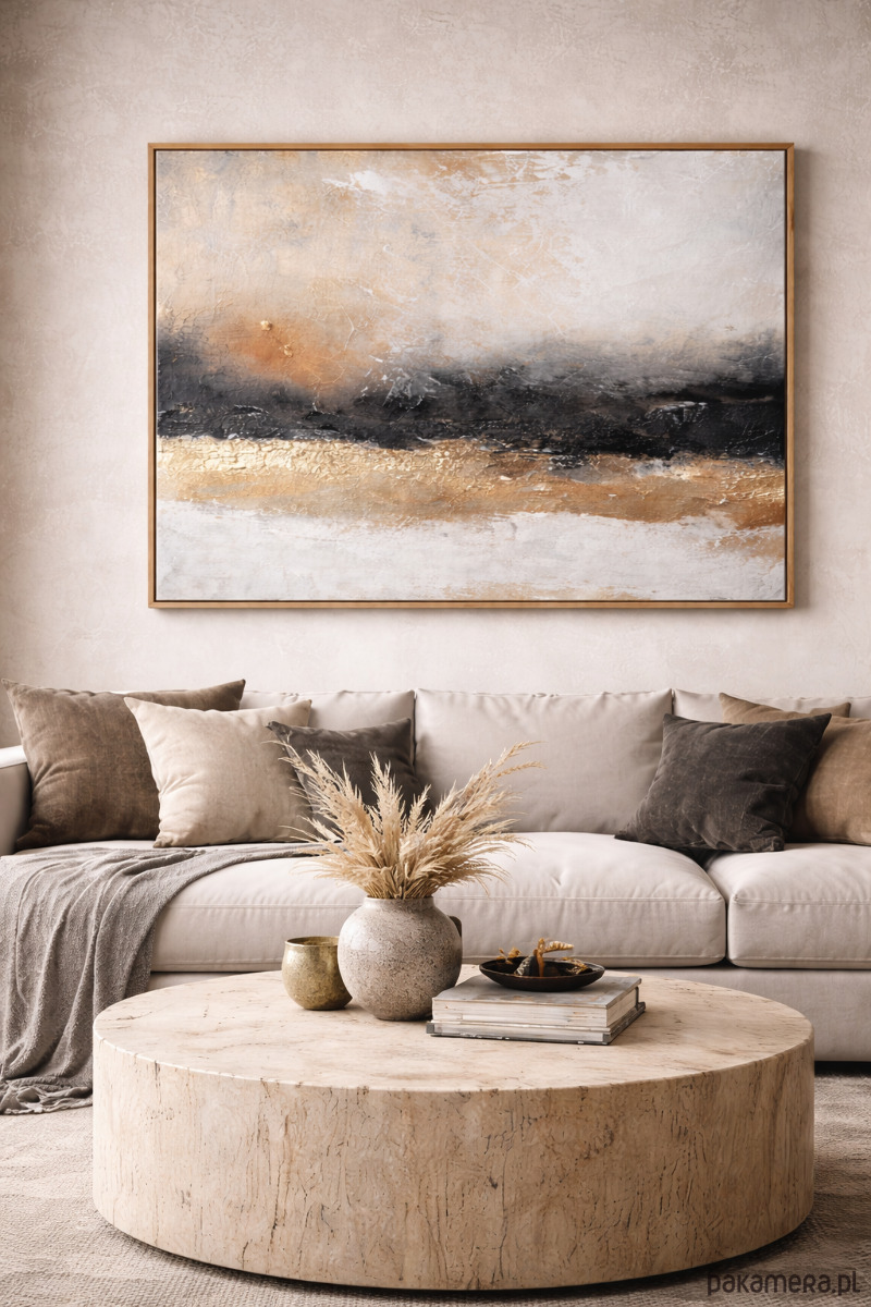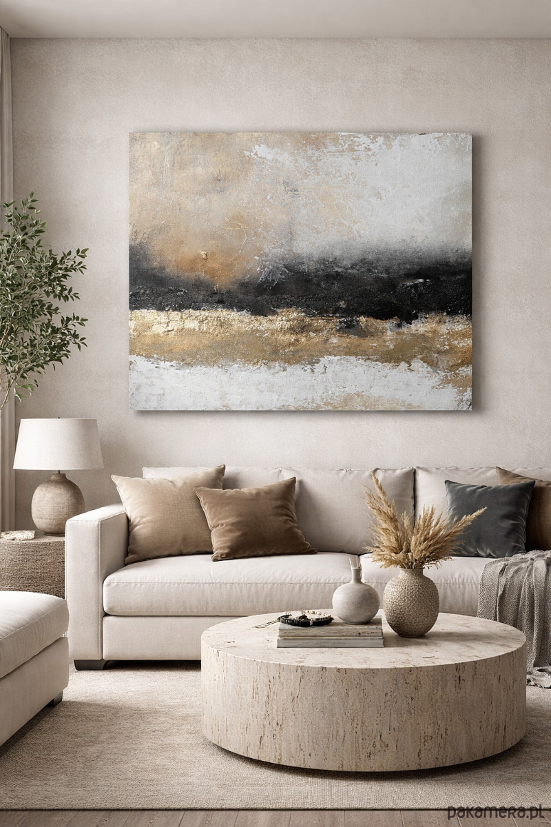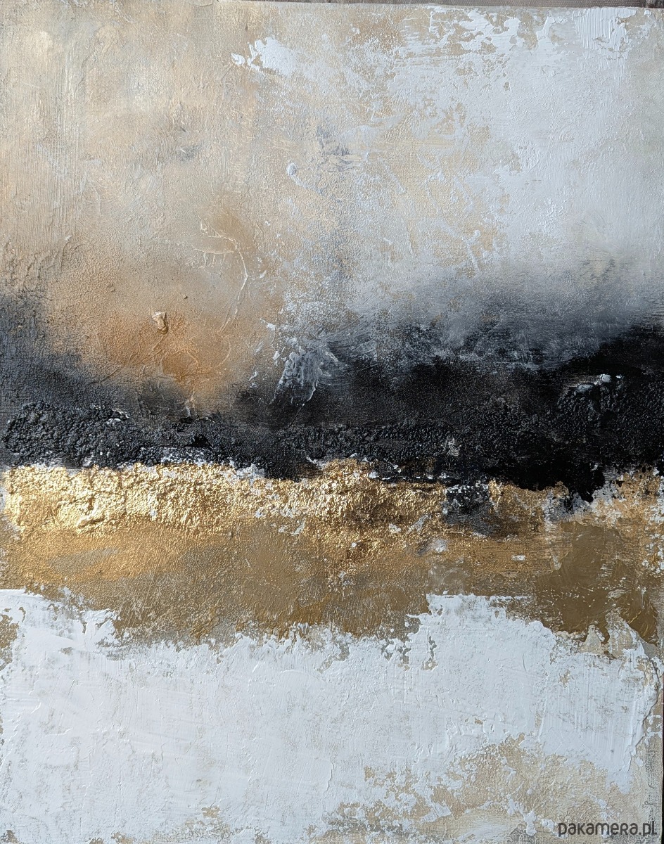 Kompozycja oparta jest na harmonii beżów, złota i głębokiej czerni, które tworzą subtelną, horyzontalną formę przywodzącą na myśl pejzaż, światło i strukturę natury. Zastosowanie złota oraz wyraźnej faktury nadaje pracy przestrzenności i szlachetnego charakteru, a zmieniające się światło podkreśla jej trójwymiarową powierzchnię.