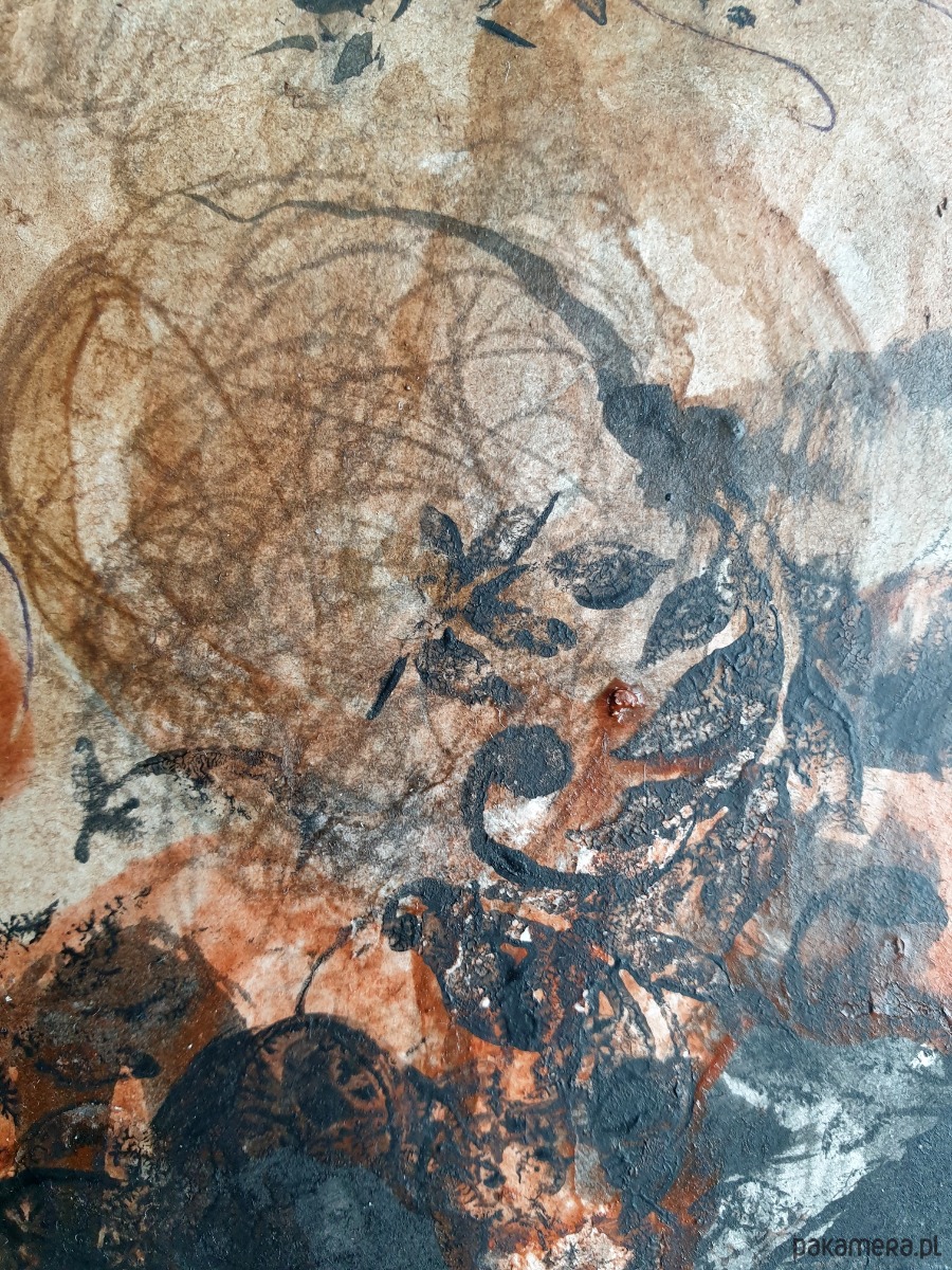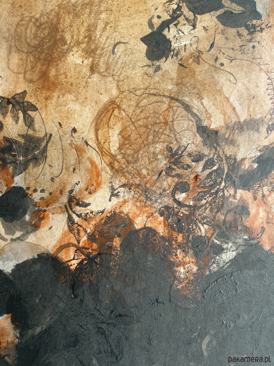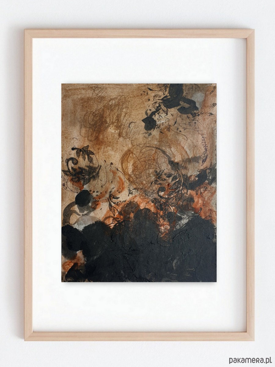 Abstrakcja, technika mieszana: akryl, węgiel, papier, ołówek, na białym kartonie, zabezpieczony.