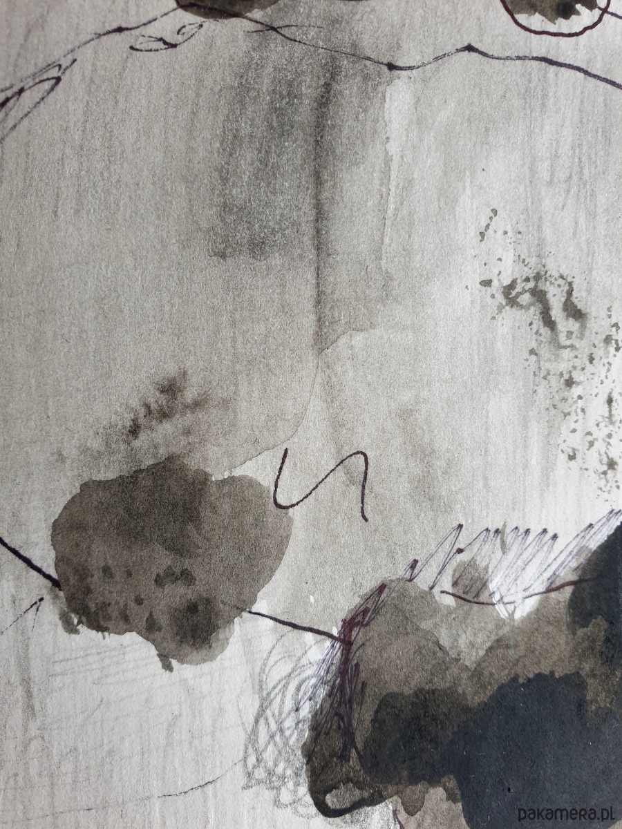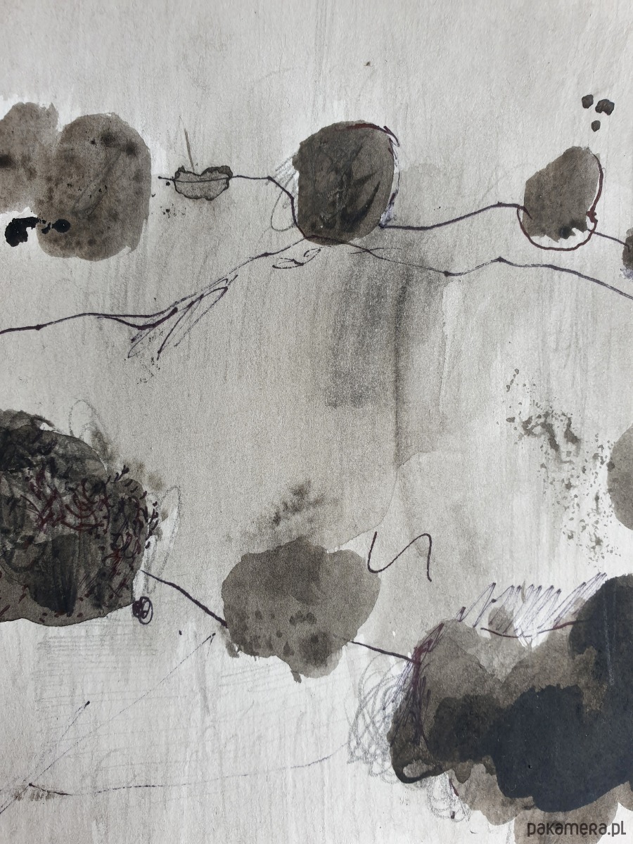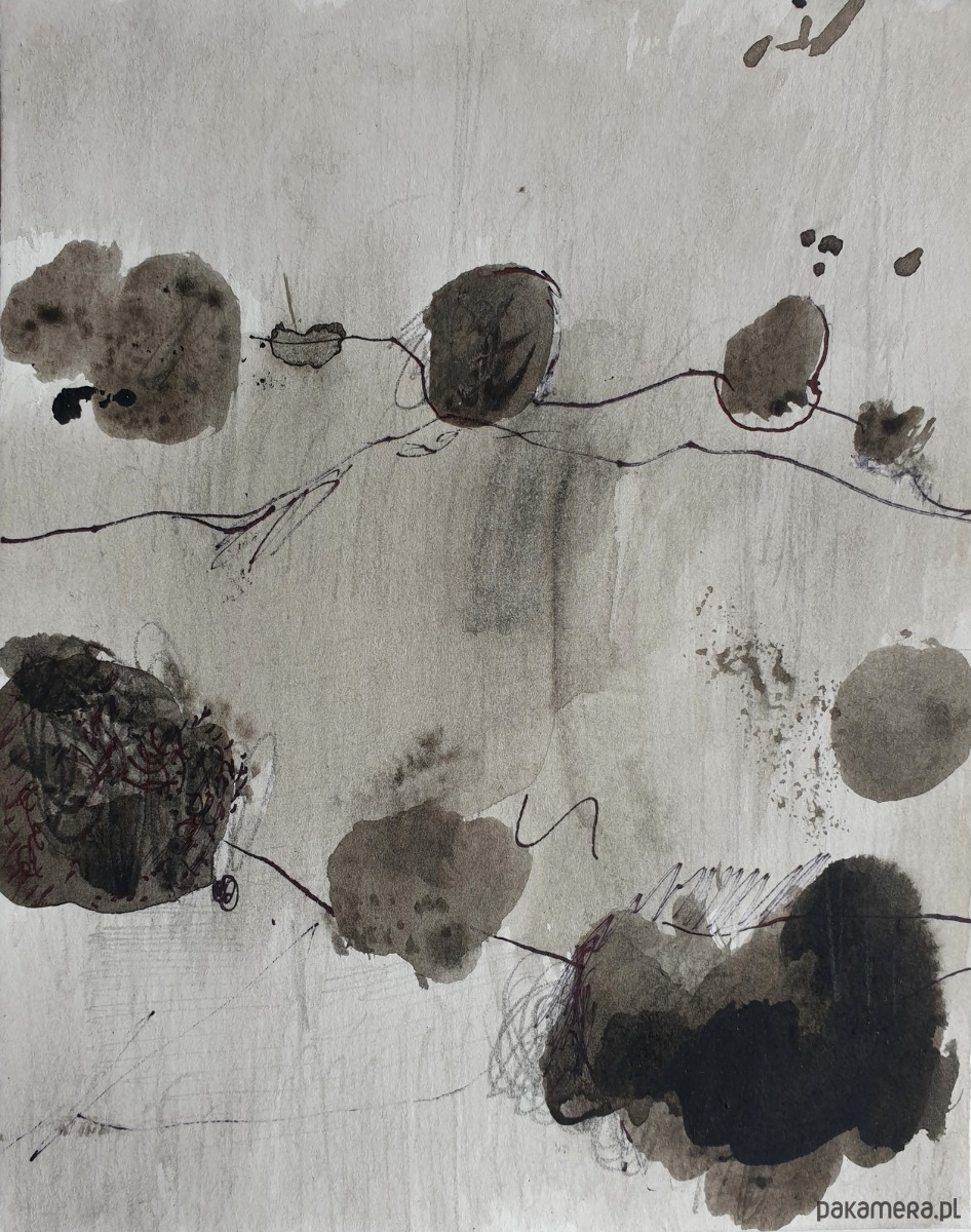 Abstrakcja, technika mieszana: akryl, węgiel, papier, ołówek, na białym kartonie, zabezpieczony.