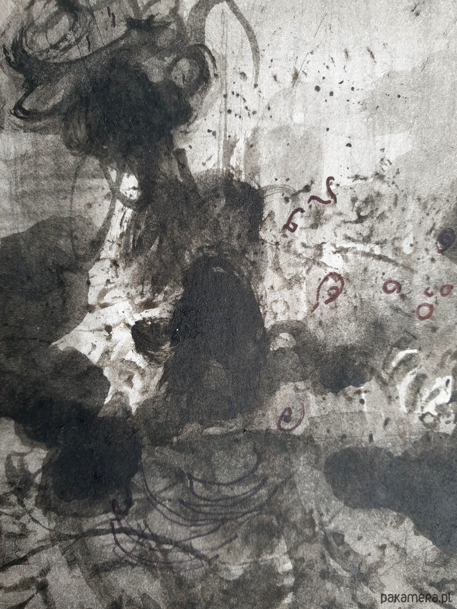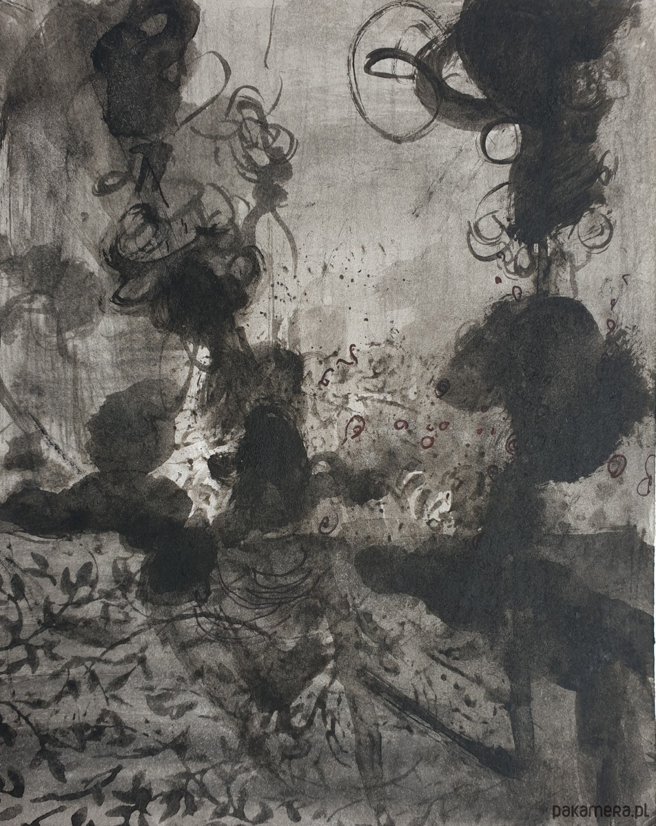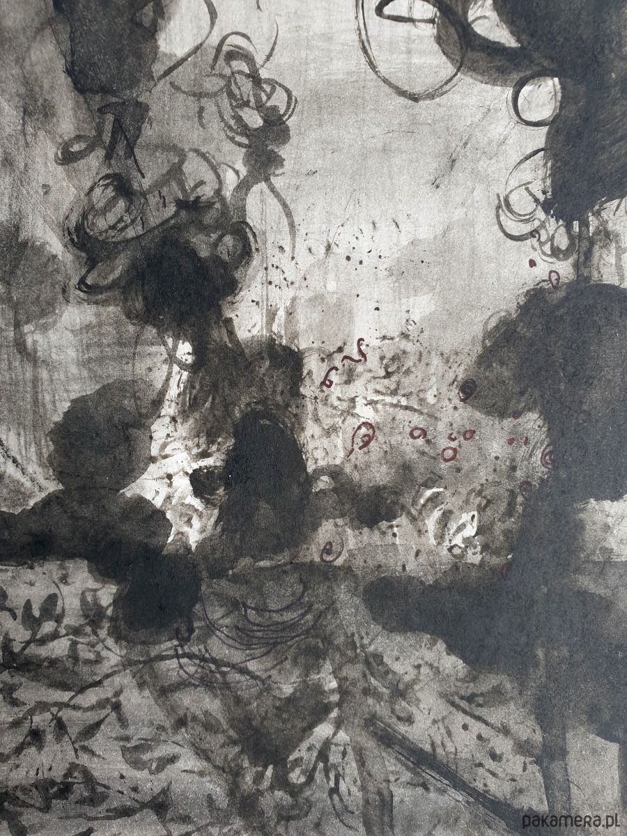Abstrakcja, technika mieszana: akryl, węgiel, papier, ołówek, na białym kartonie, zabezpieczony.