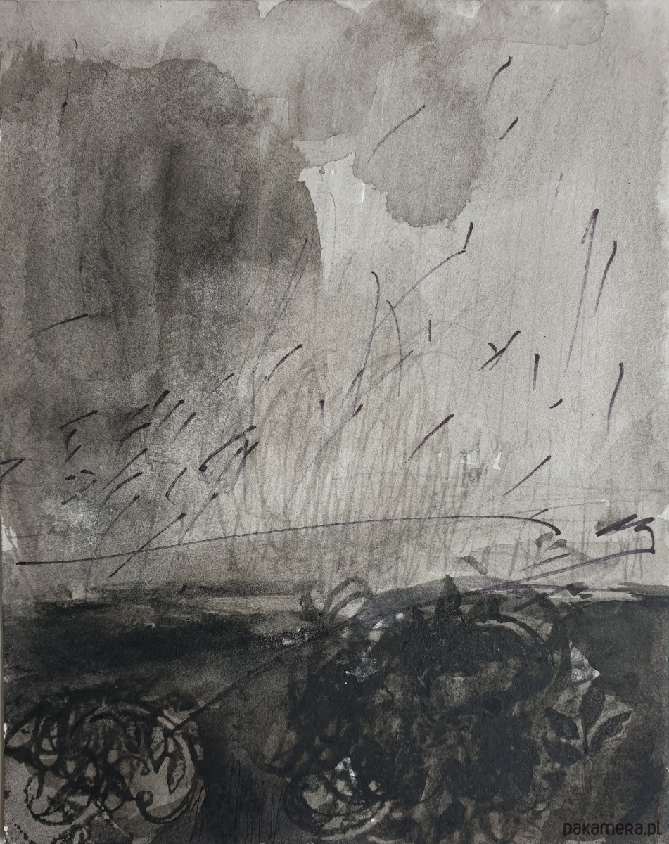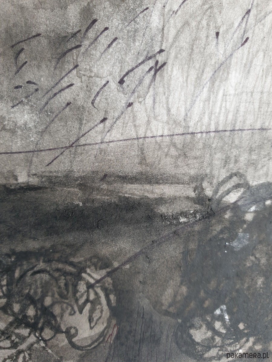 Abstrakcja, technika mieszana: akryl, węgiel, papier, ołówek, na białym kartonie, zabezpieczony.