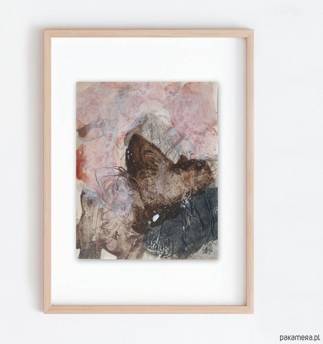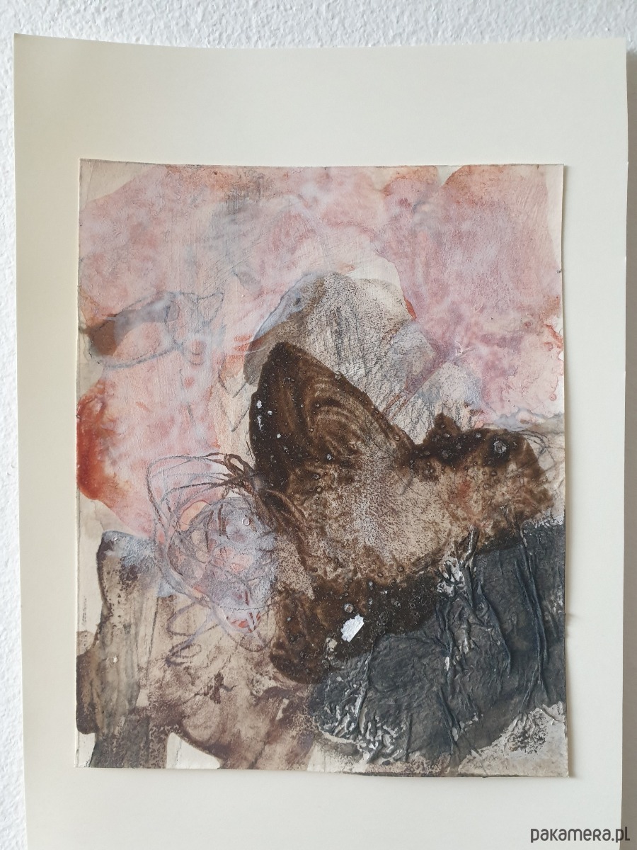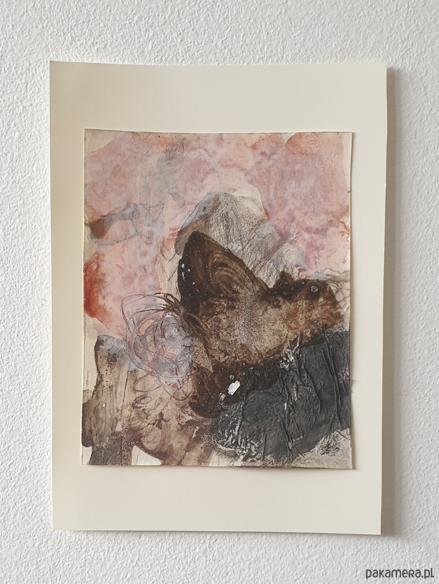 Abstrakcja, technika mieszana: pigmenty ziemne, akryl, węgiel, pastele, papier, ołówek, na białym kartonie, zabezpieczony.