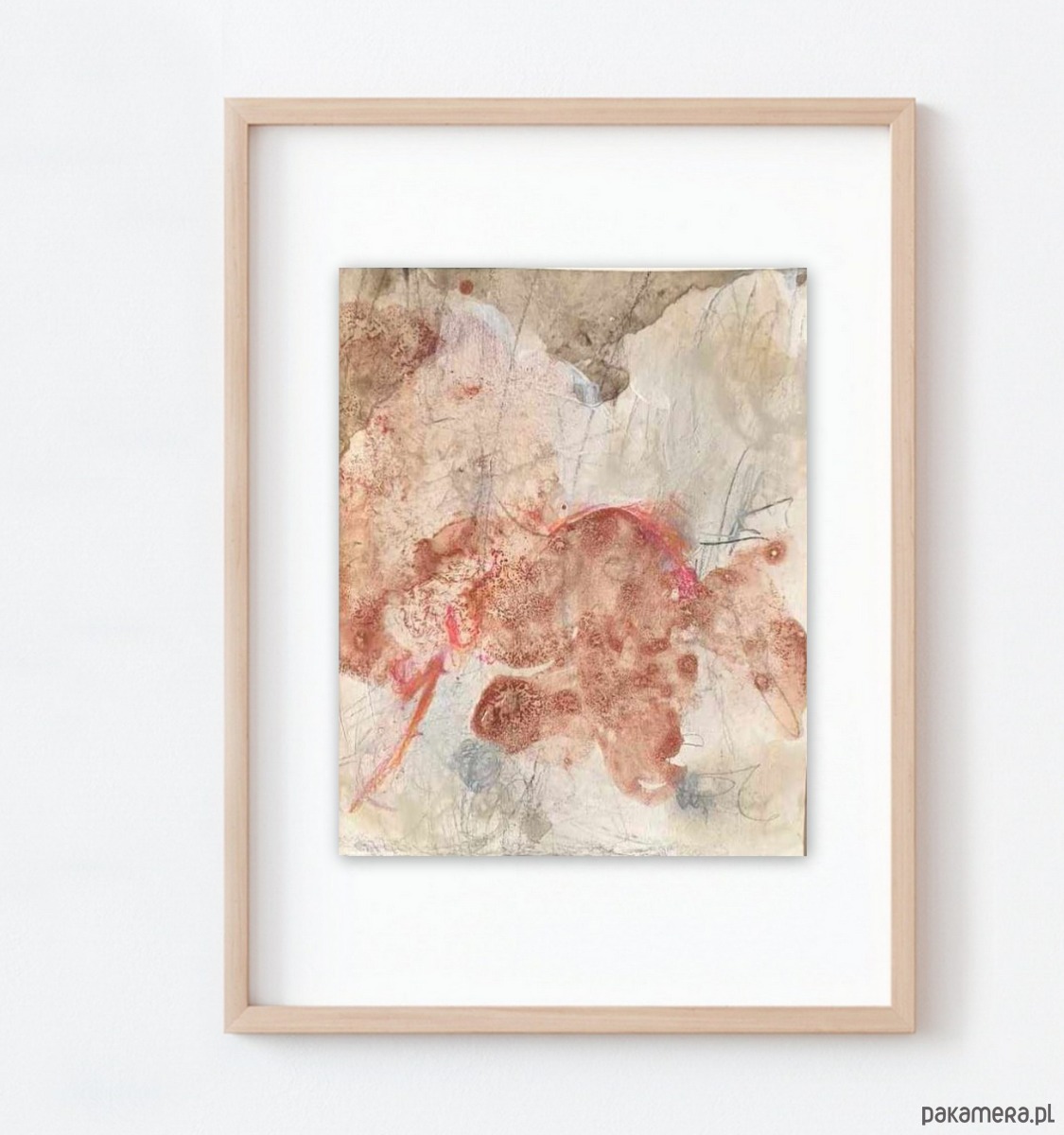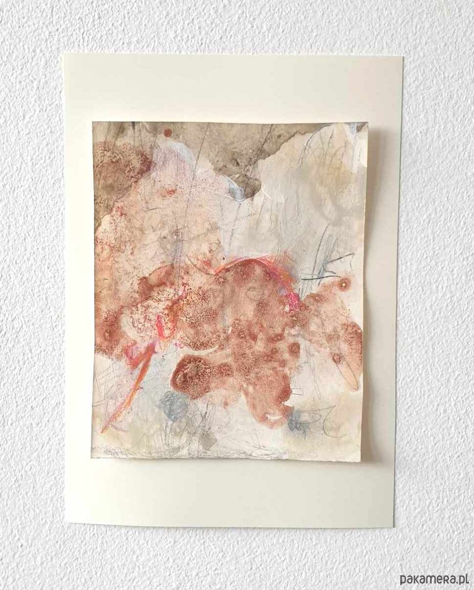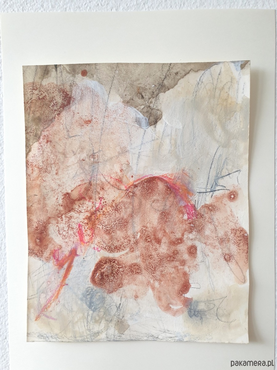 Abstrakcja, technika mieszana: pigmenty ziemne, akryl, węgiel, pastele, papier, ołówek, na białym kartonie, zabezpieczony.