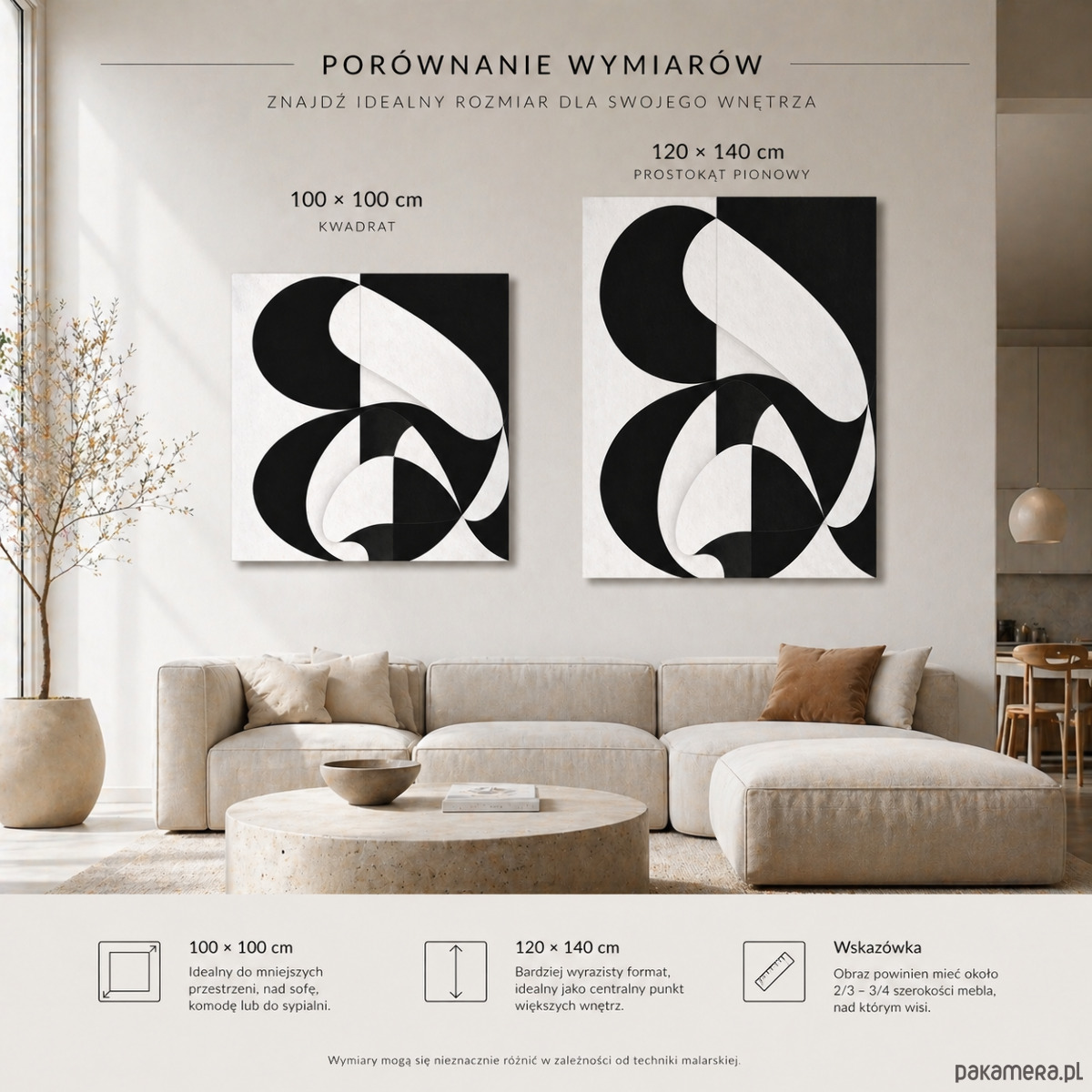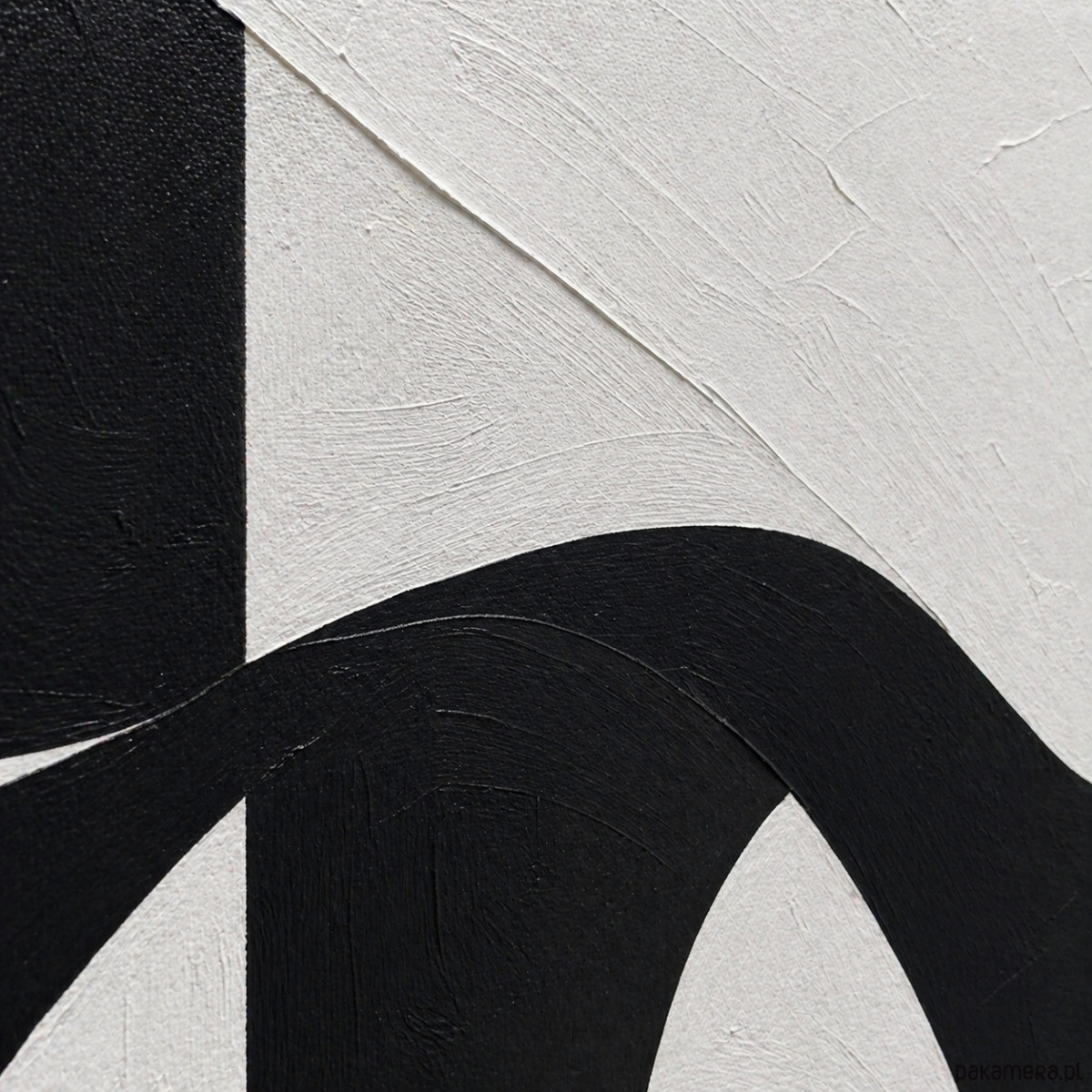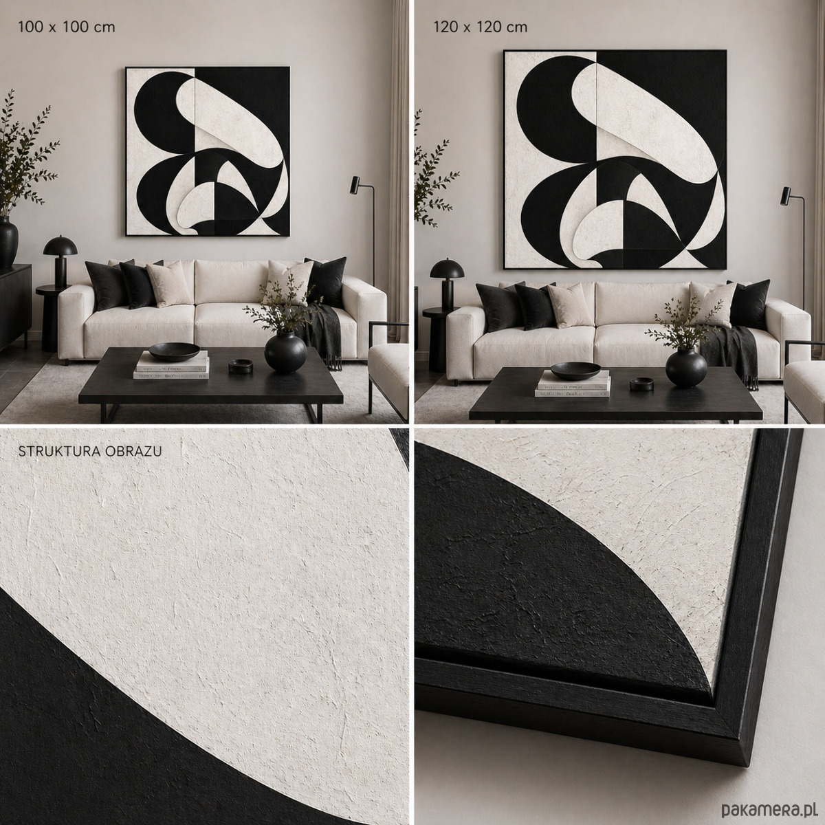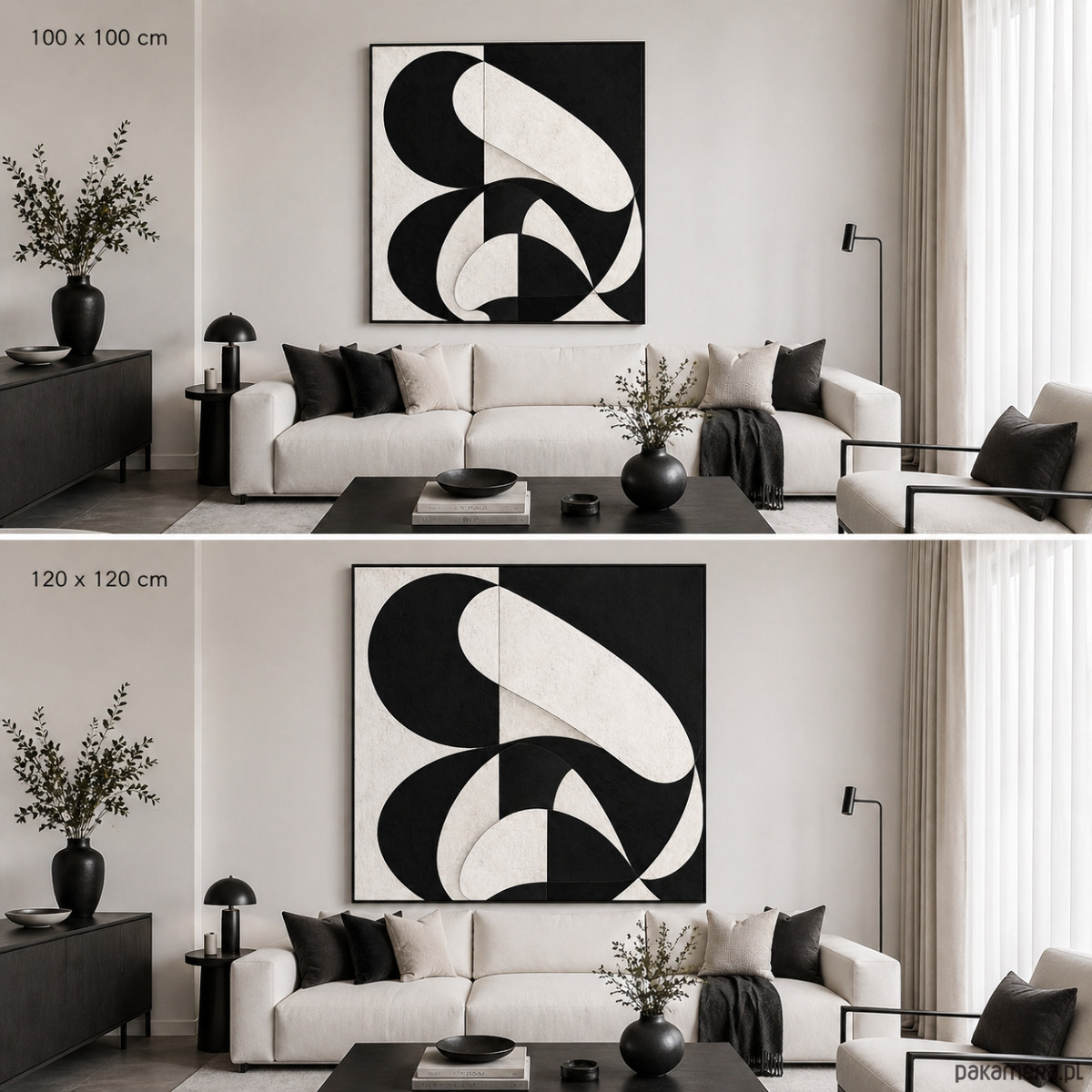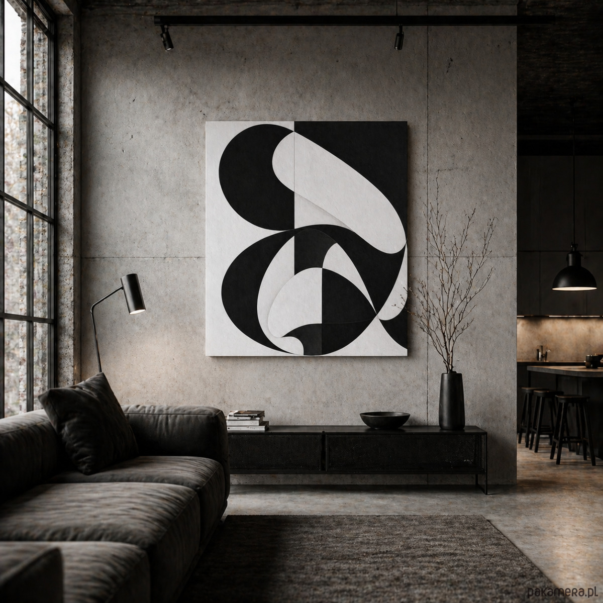 Nowoczesny obraz abstrakcyjny utrzymany w kontrastowej czerni i bieli, oparty na płynnych, organicznych formach geometrycznych. Kompozycja łączy minimalizm z wyrazistą formą, tworząc elegancki i ponadczasowy akcent do wnętrza.