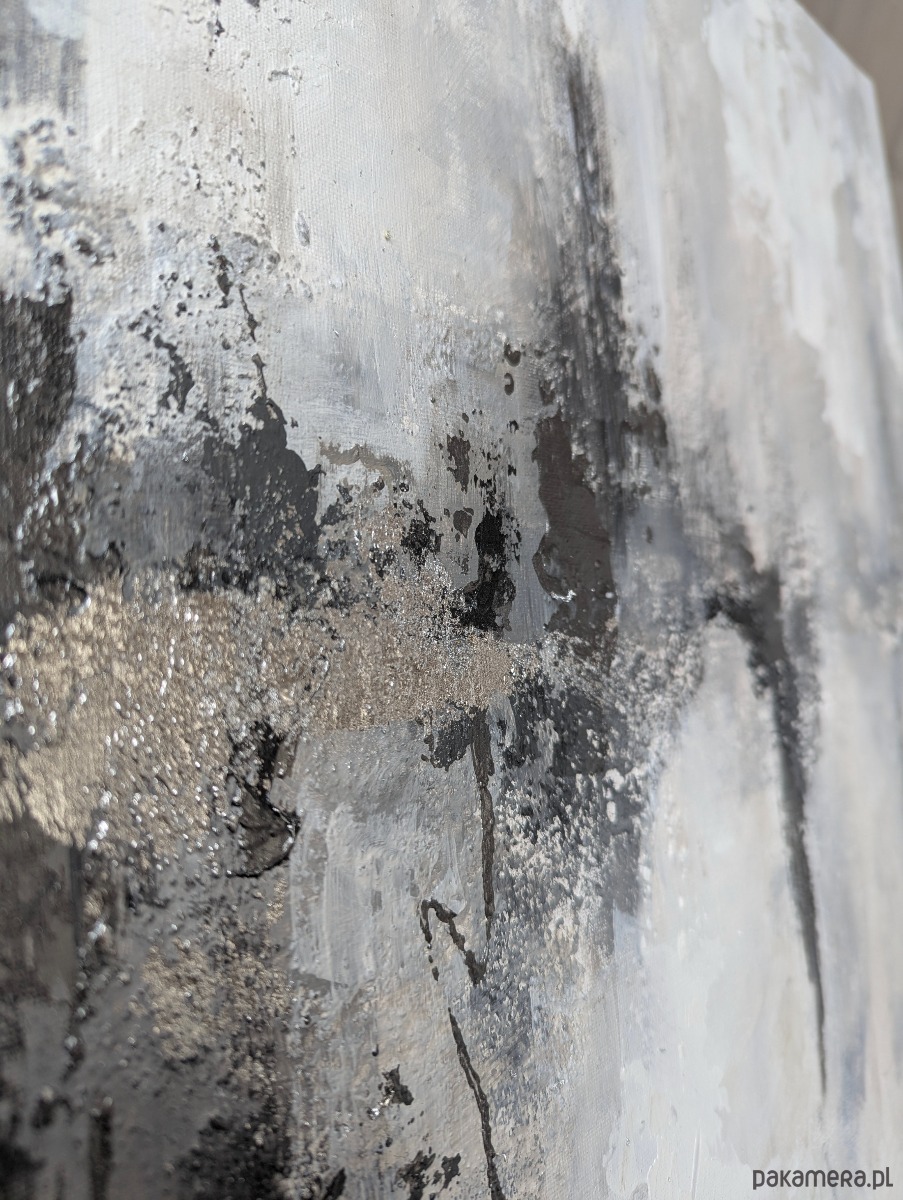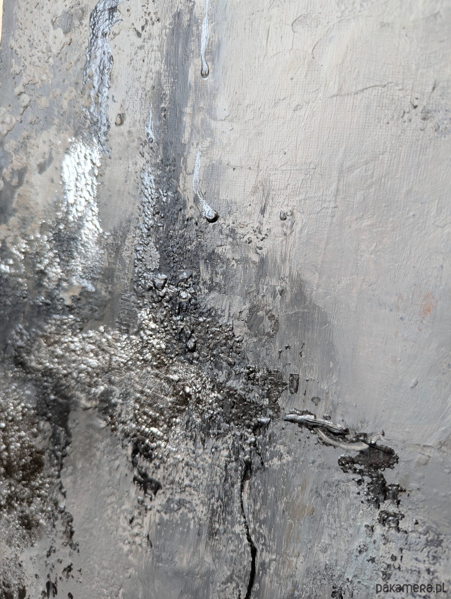 Kolorystyka: biel, szarości, delikatne beże, srebro. Fragmenty pokryte srebrem w płatkach.