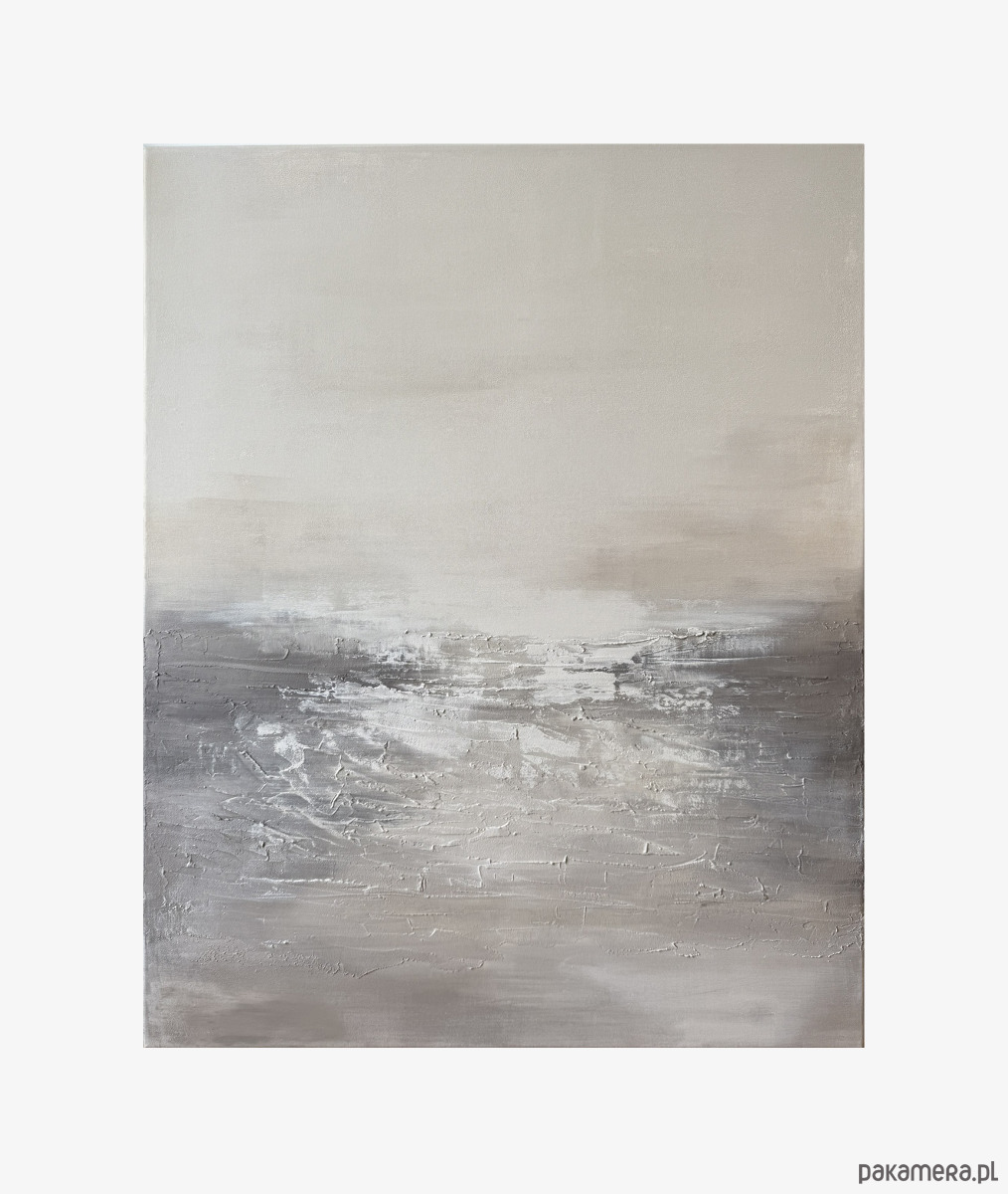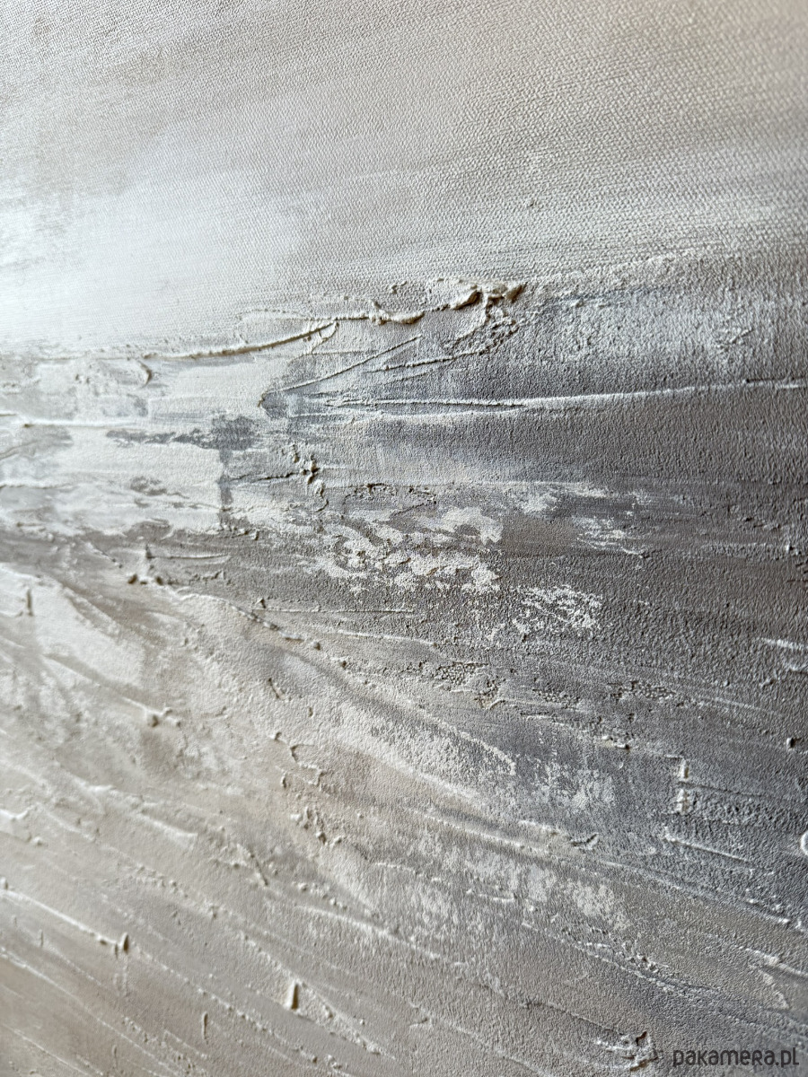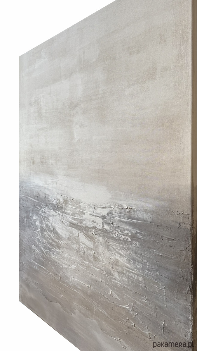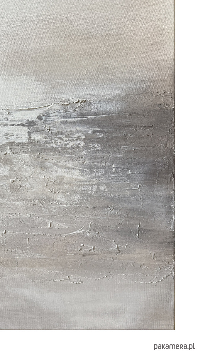 Delikatne przejścia beżu i szarości tworzą strukturę przypominającą mglisty horyzont – przestrzeń pomiędzy ciszą a ruchem.
