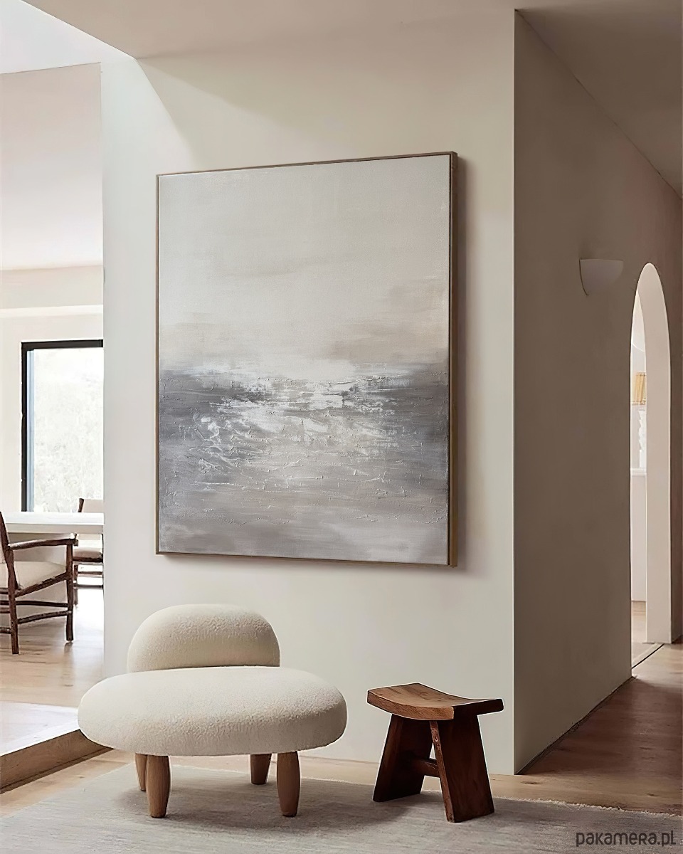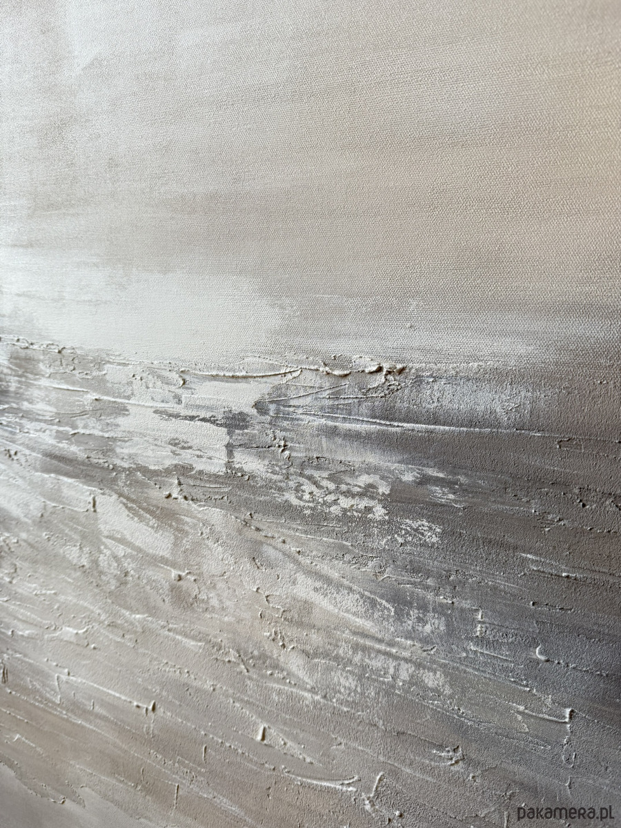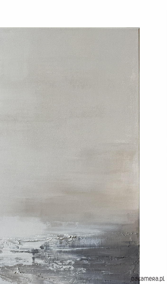 Delikatne przejścia beżu i szarości tworzą strukturę przypominającą mglisty horyzont – przestrzeń pomiędzy ciszą a ruchem.