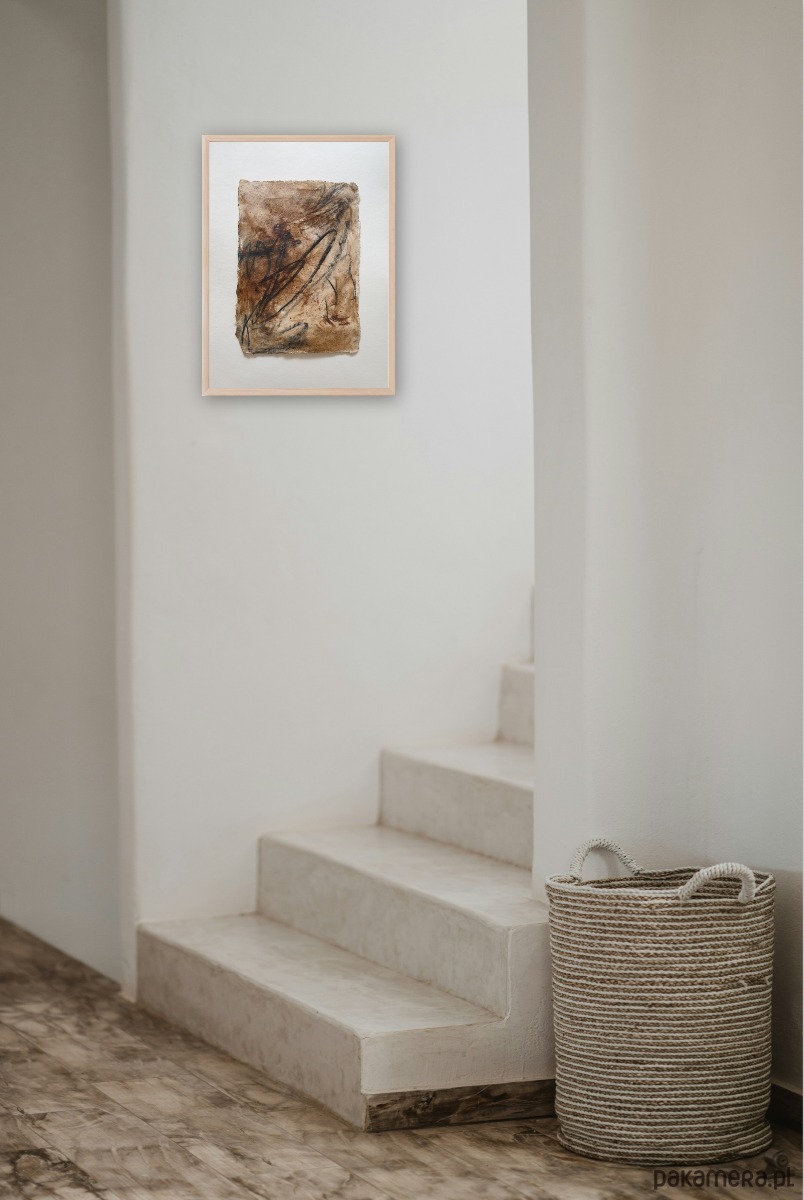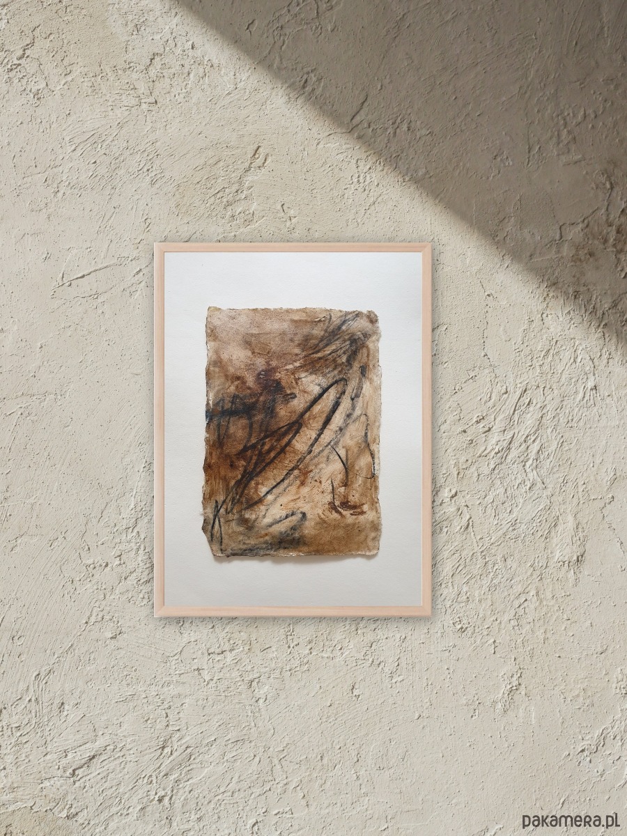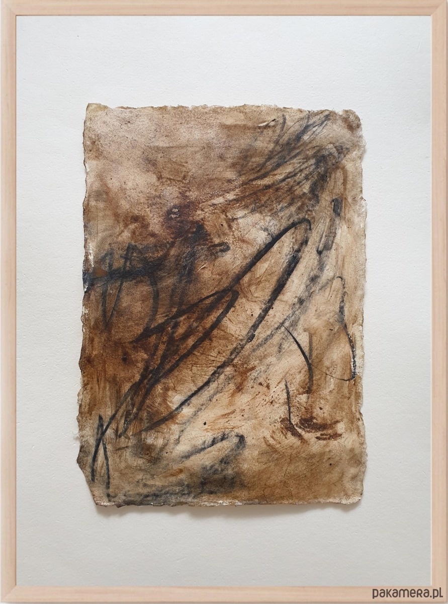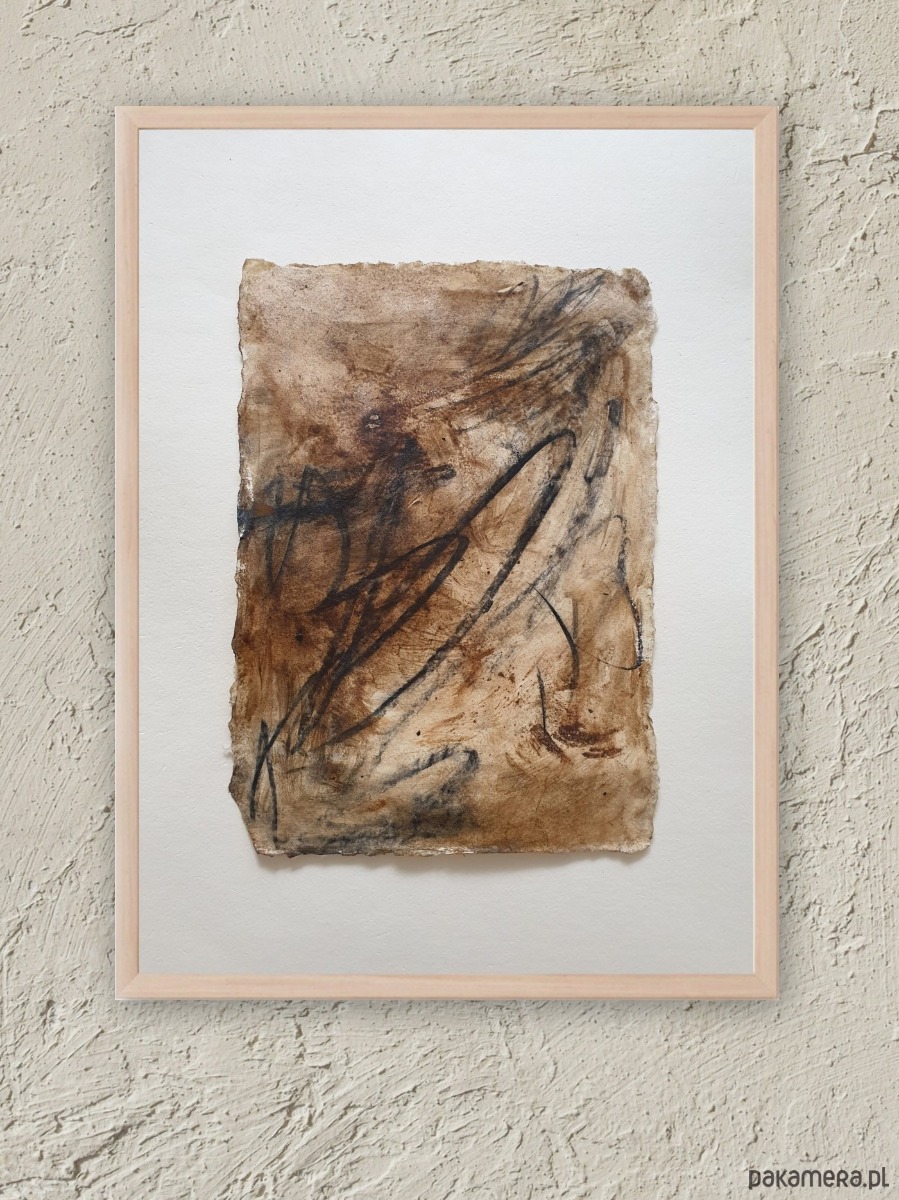 Abstrakcja, technika mieszana: pigmenty ziemne, akryl, węgiel, pastele, ołówek, na papierze ręcznie czerpanym.