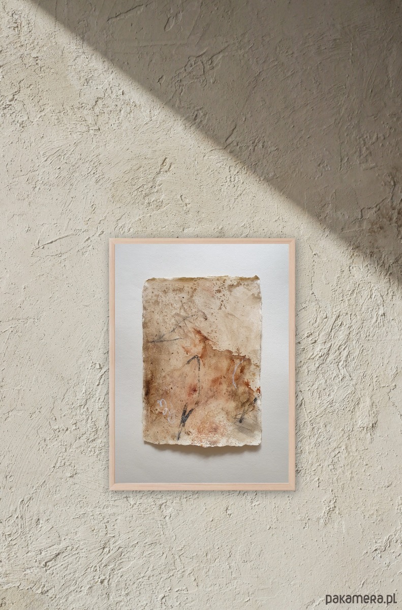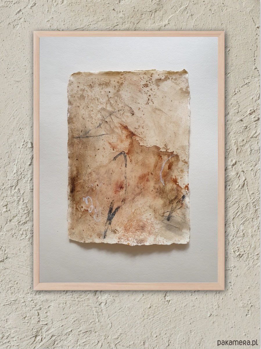 Abstrakcja, technika mieszana: pigmenty ziemne, akryl, węgiel, pastele, ołówek, na papierze ręcznie czerpanym.