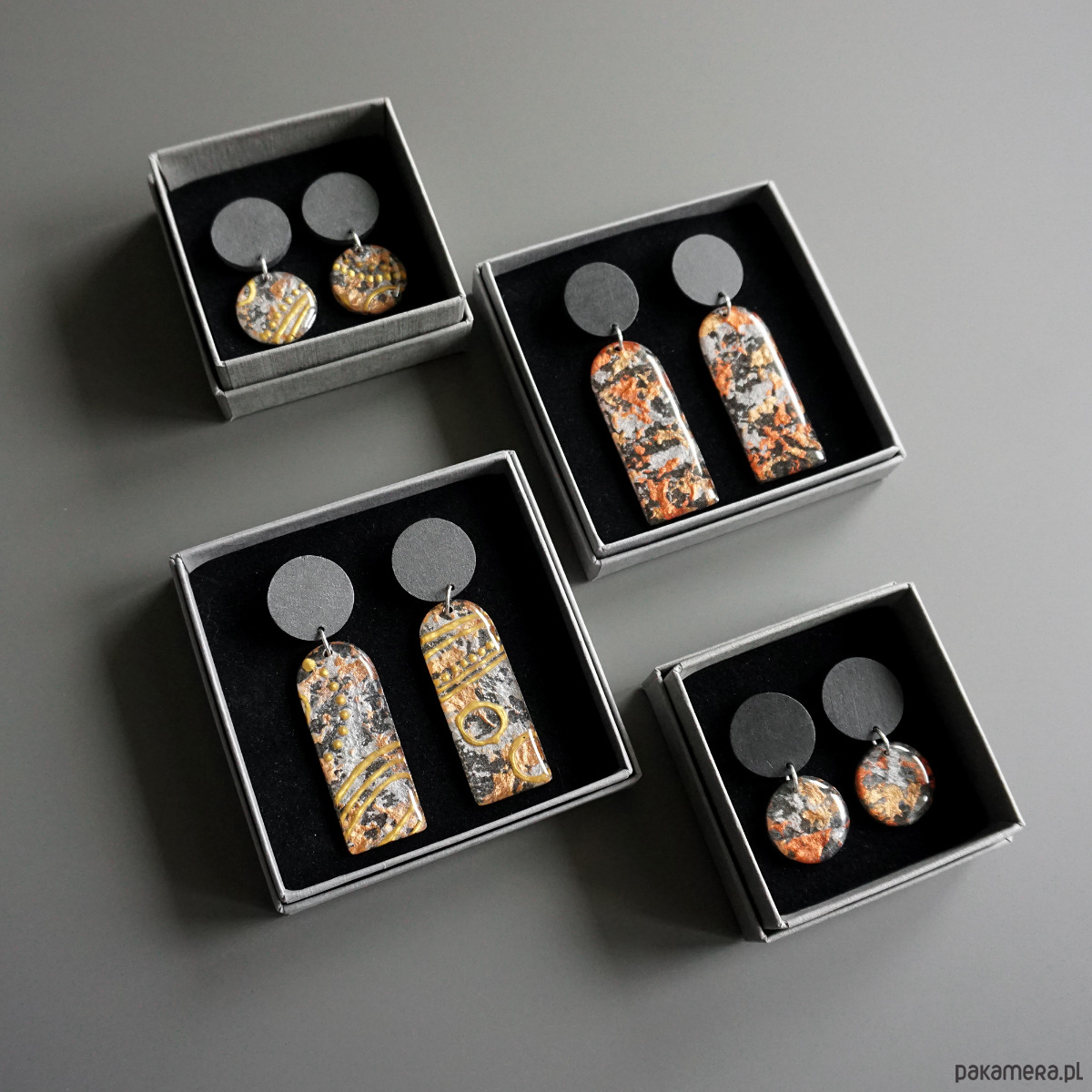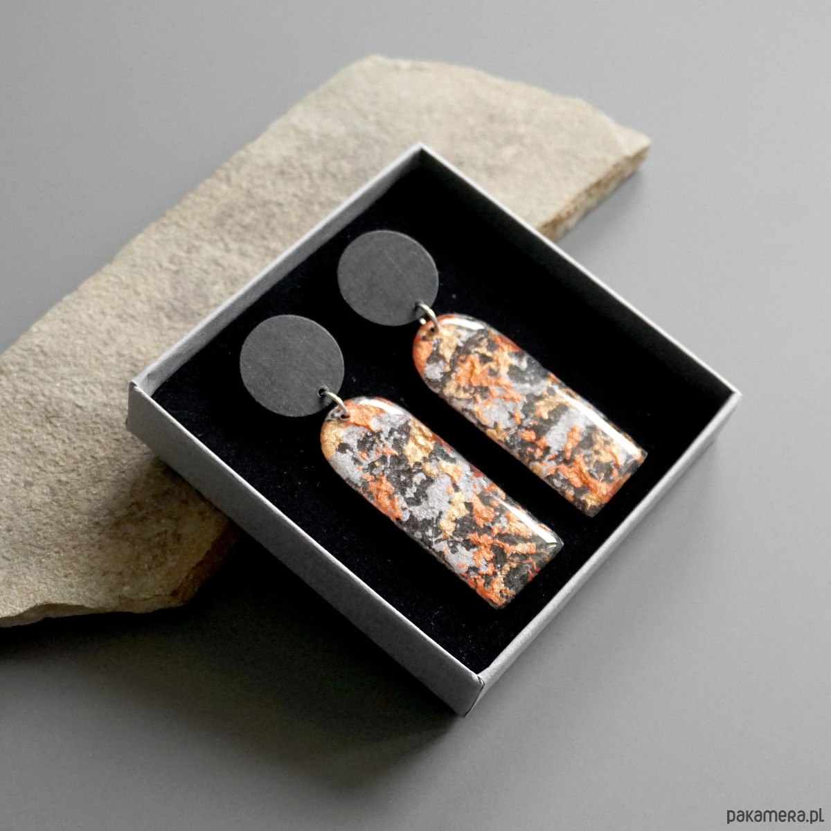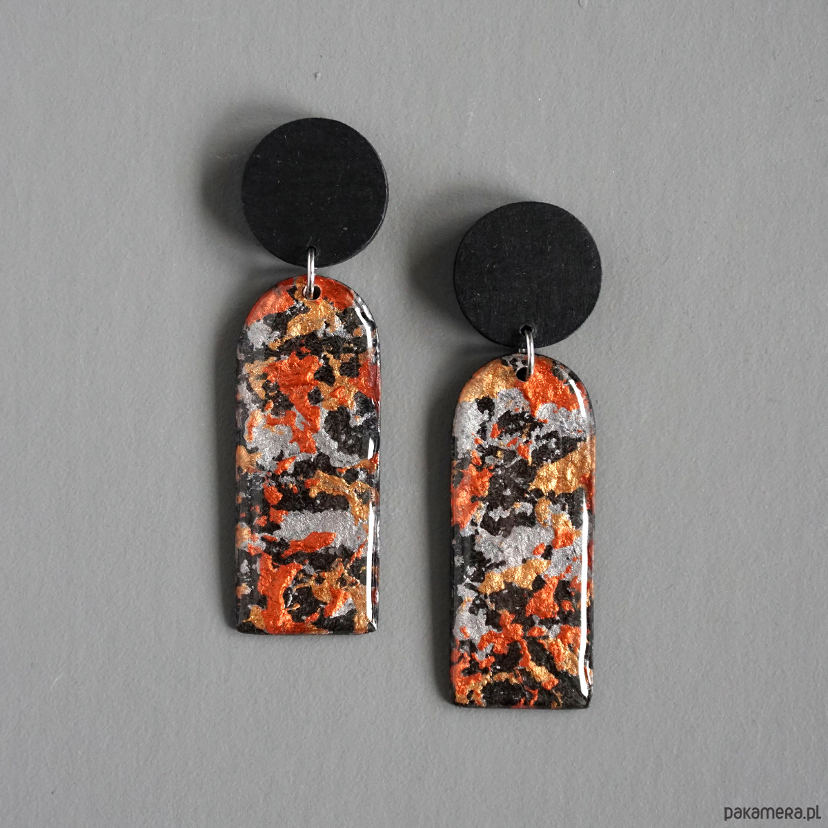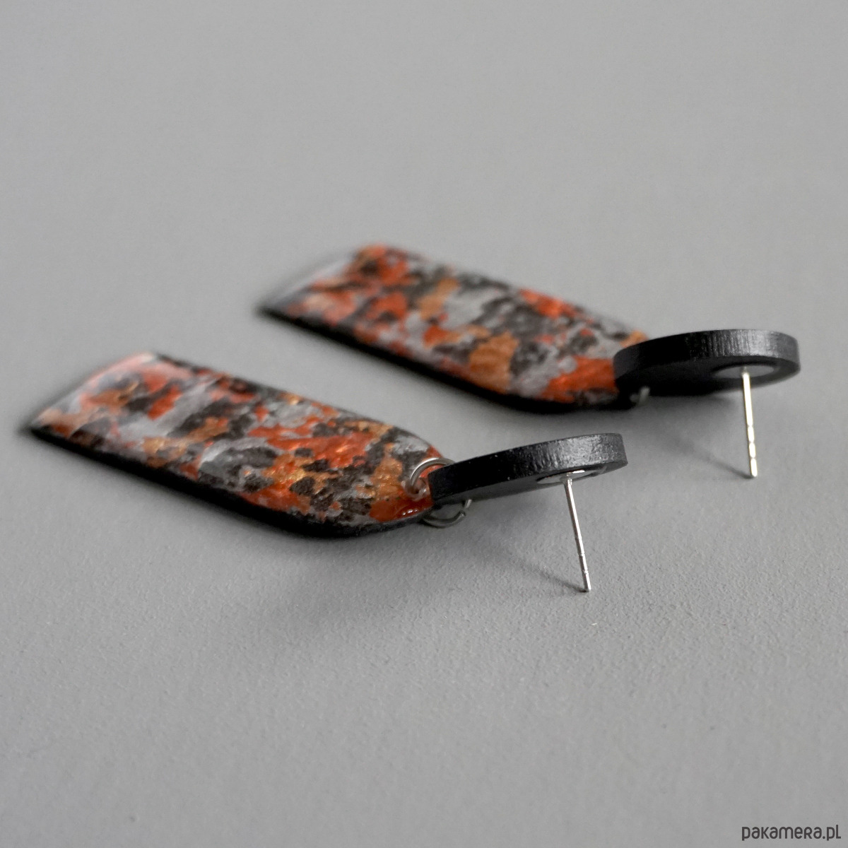 Długie, abstrakcyjne kolczyki wykonane w technice mieszanej.