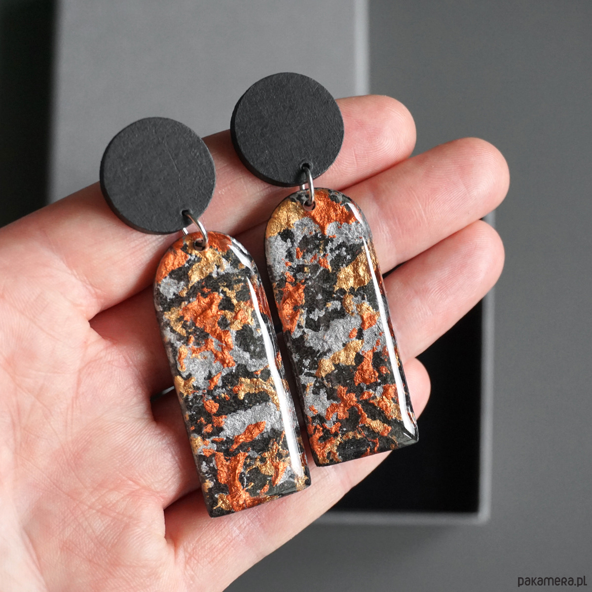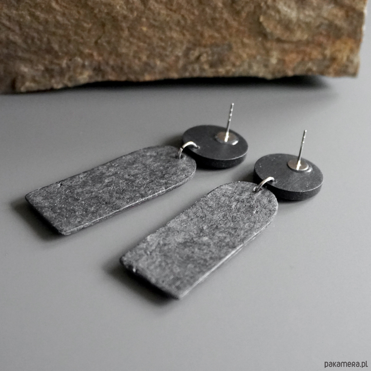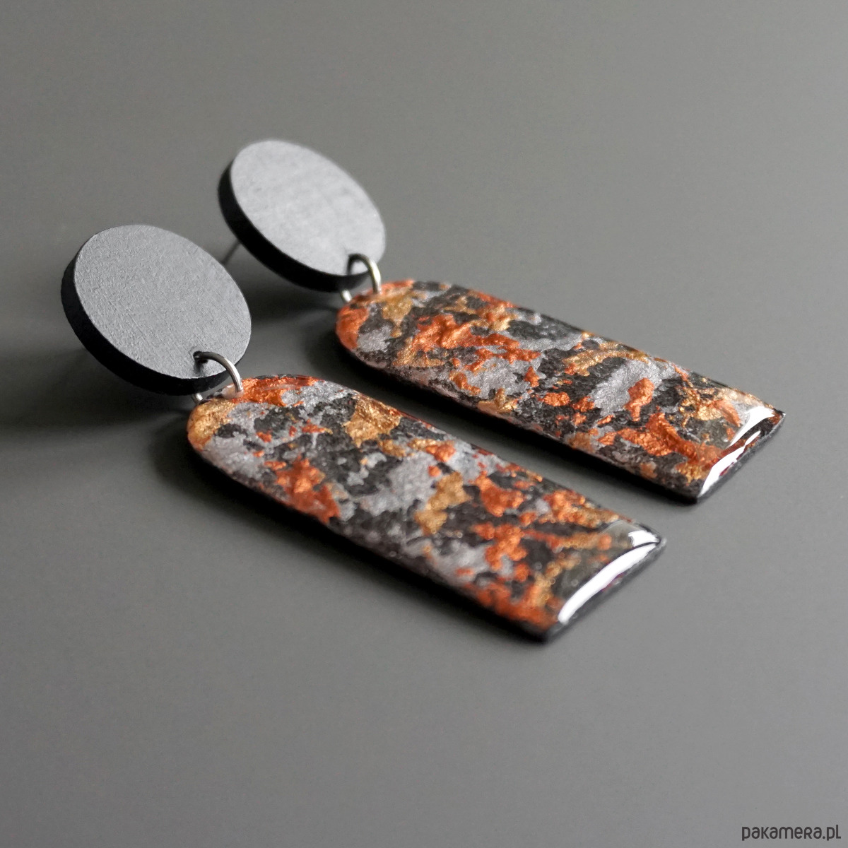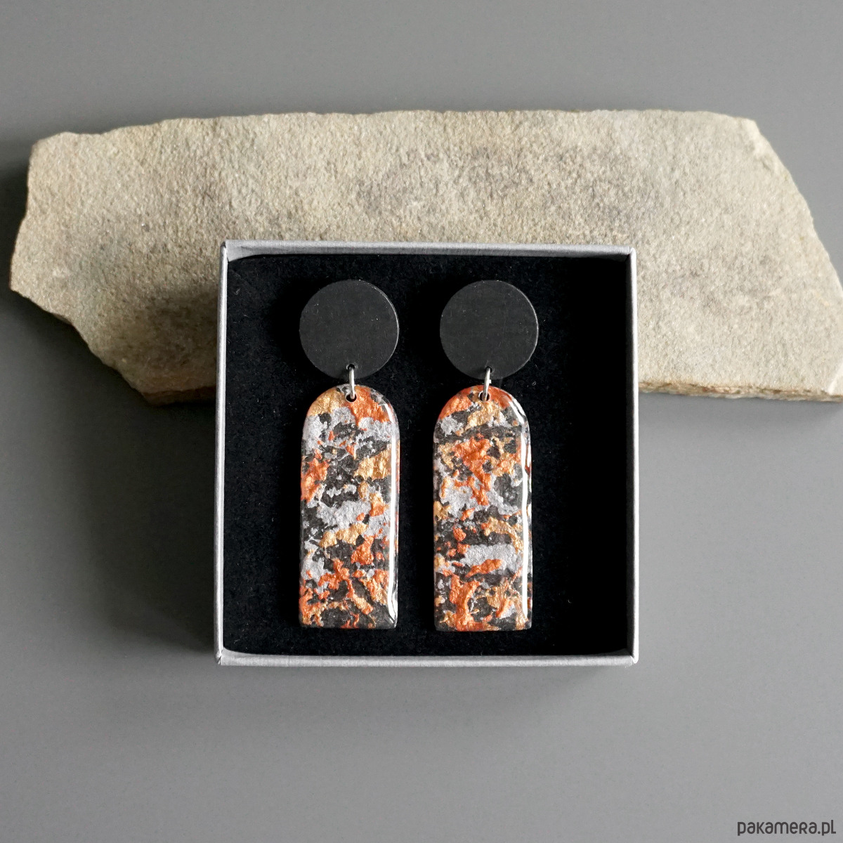 Długie, abstrakcyjne kolczyki wykonane w technice mieszanej.