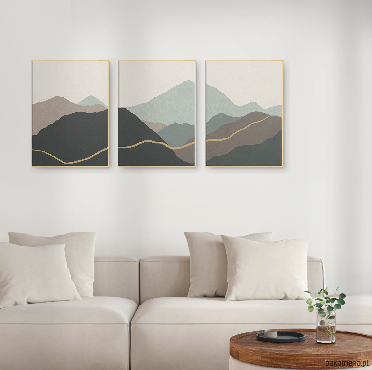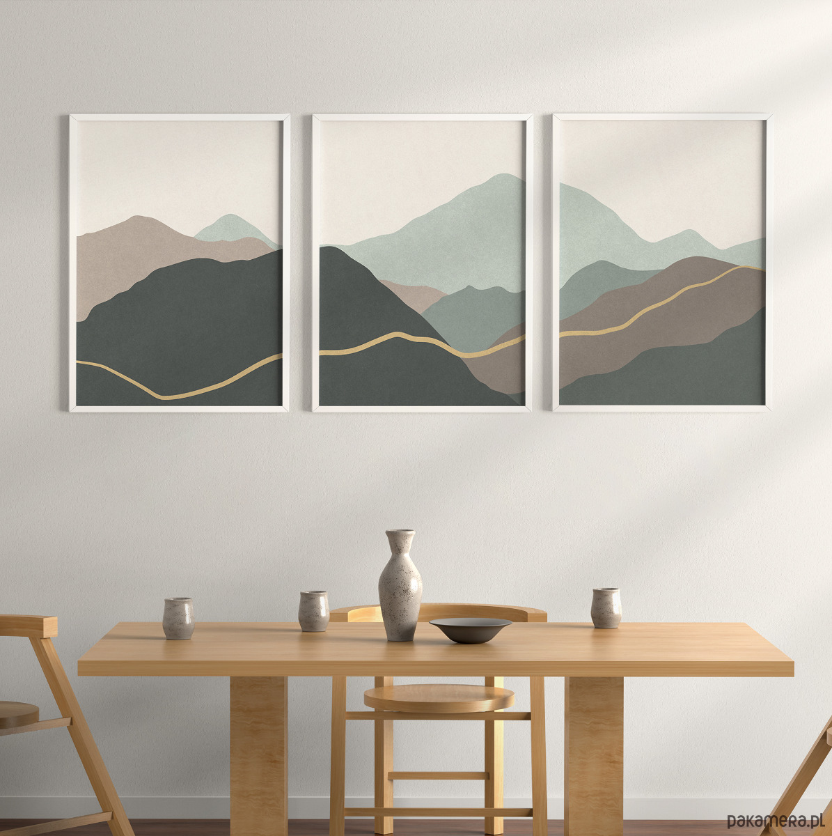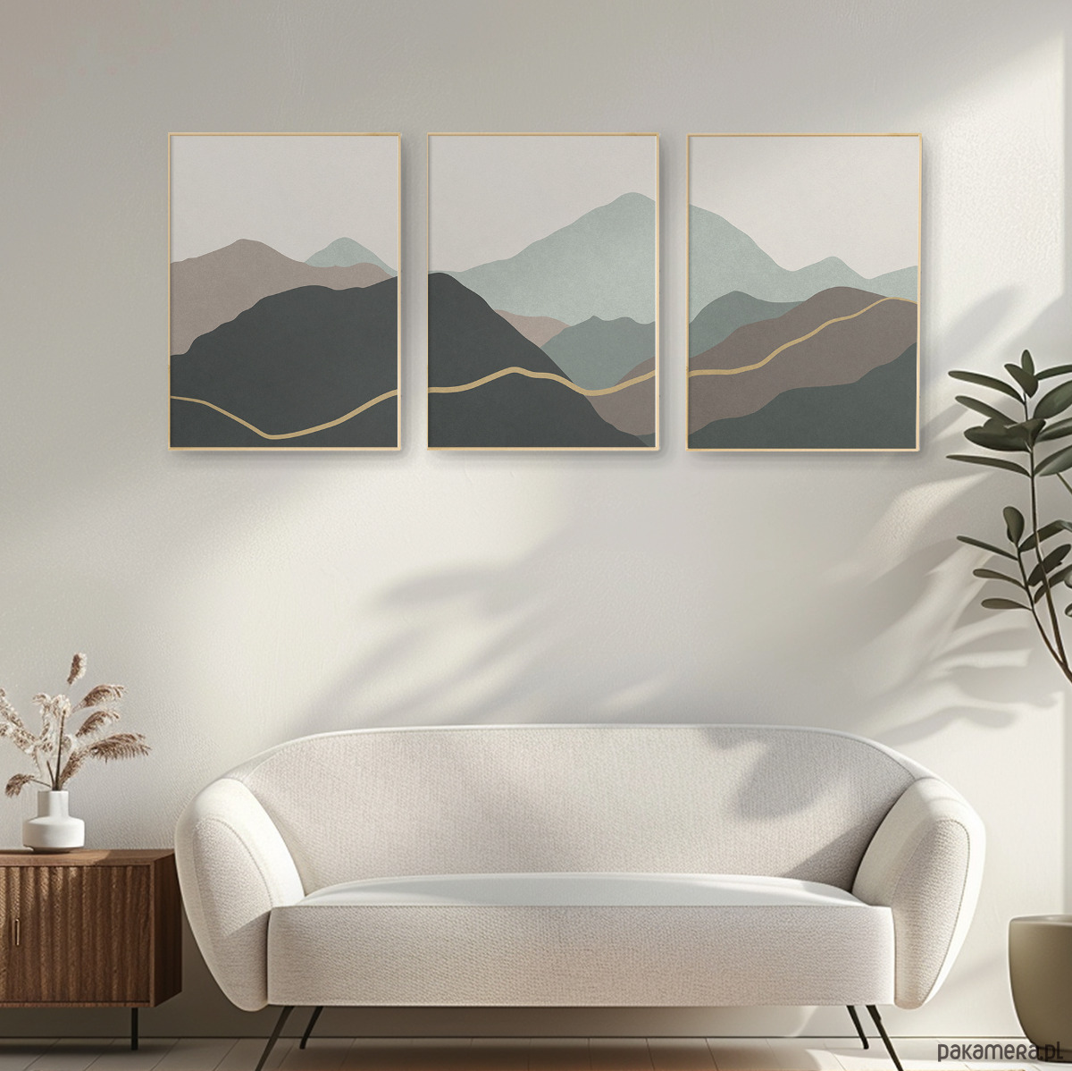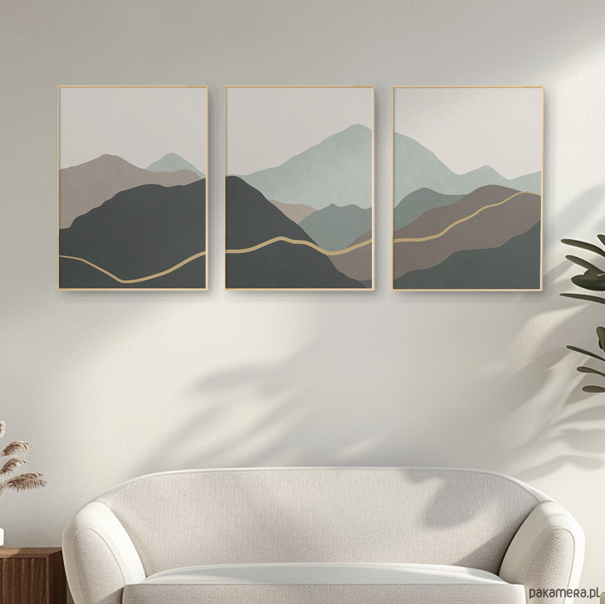 Abstrakcyjny zestaw 3 plakatów w formie tryptyku z motywem przypominającym górski krajobraz. Proste, geometryczne formy, delikatna tekstura, oraz stonowana kolorystyka tworzą spójną kompozycję, która dobrze odnajdzie się w aranżacjach w stylu skandynawskim, japandi, nowoczesnym oraz minimalistycznym.