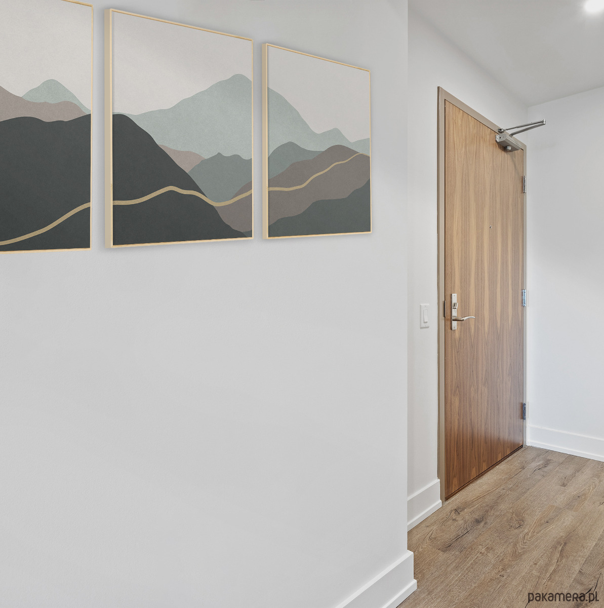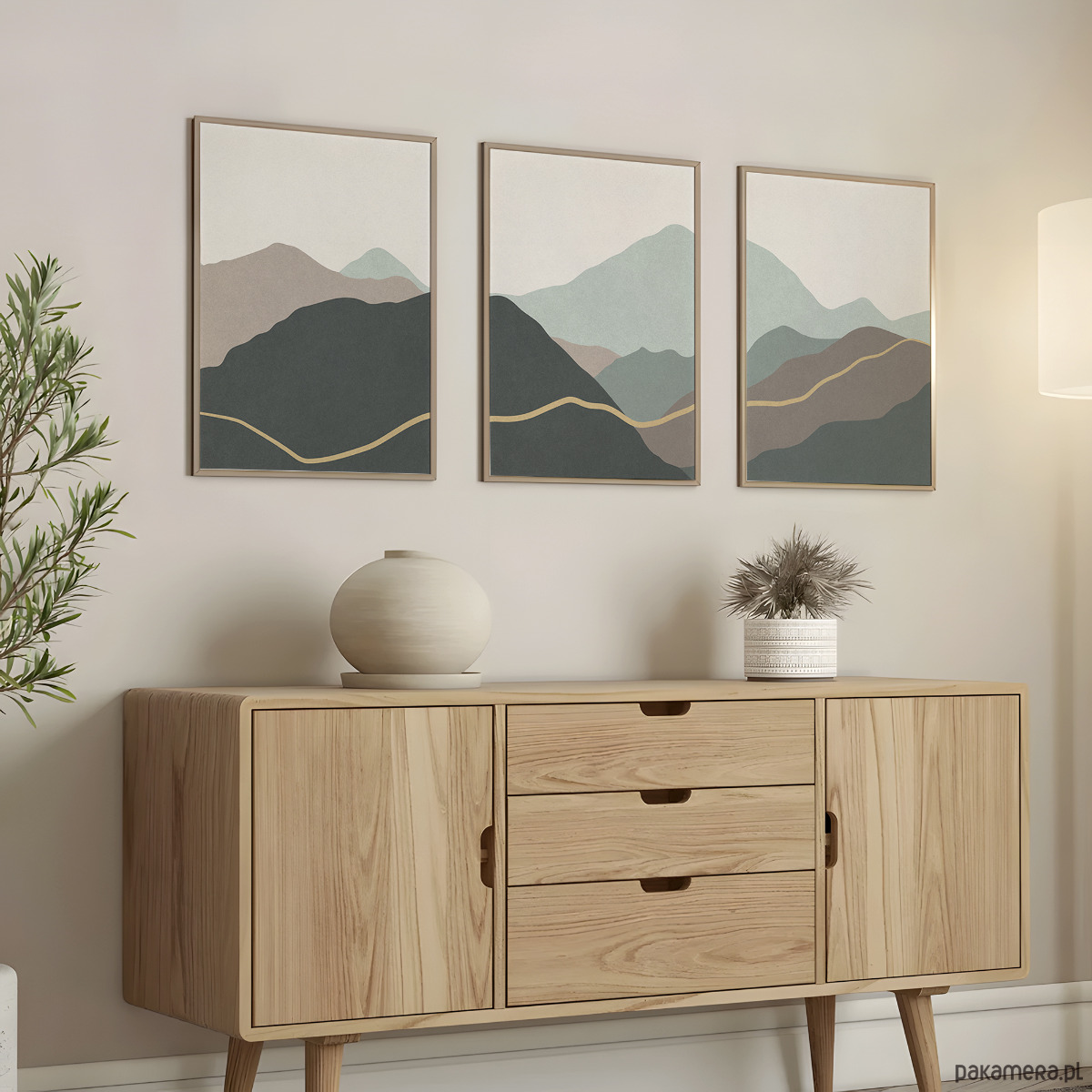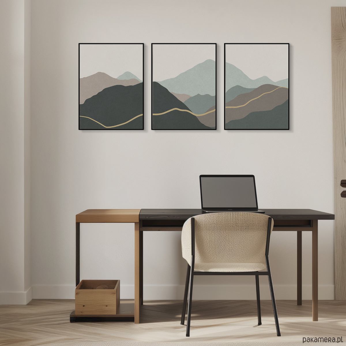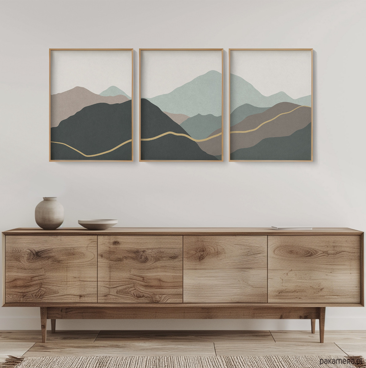 Abstrakcyjny zestaw 3 plakatów w formie tryptyku z motywem przypominającym górski krajobraz. Proste, geometryczne formy, delikatna tekstura, oraz stonowana kolorystyka tworzą spójną kompozycję, która dobrze odnajdzie się w aranżacjach w stylu skandynawskim, japandi, nowoczesnym oraz minimalistycznym.