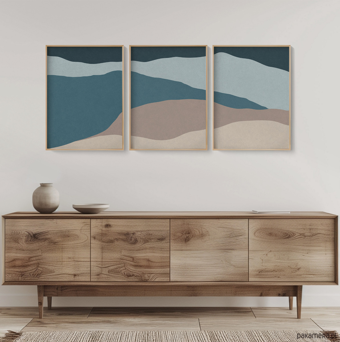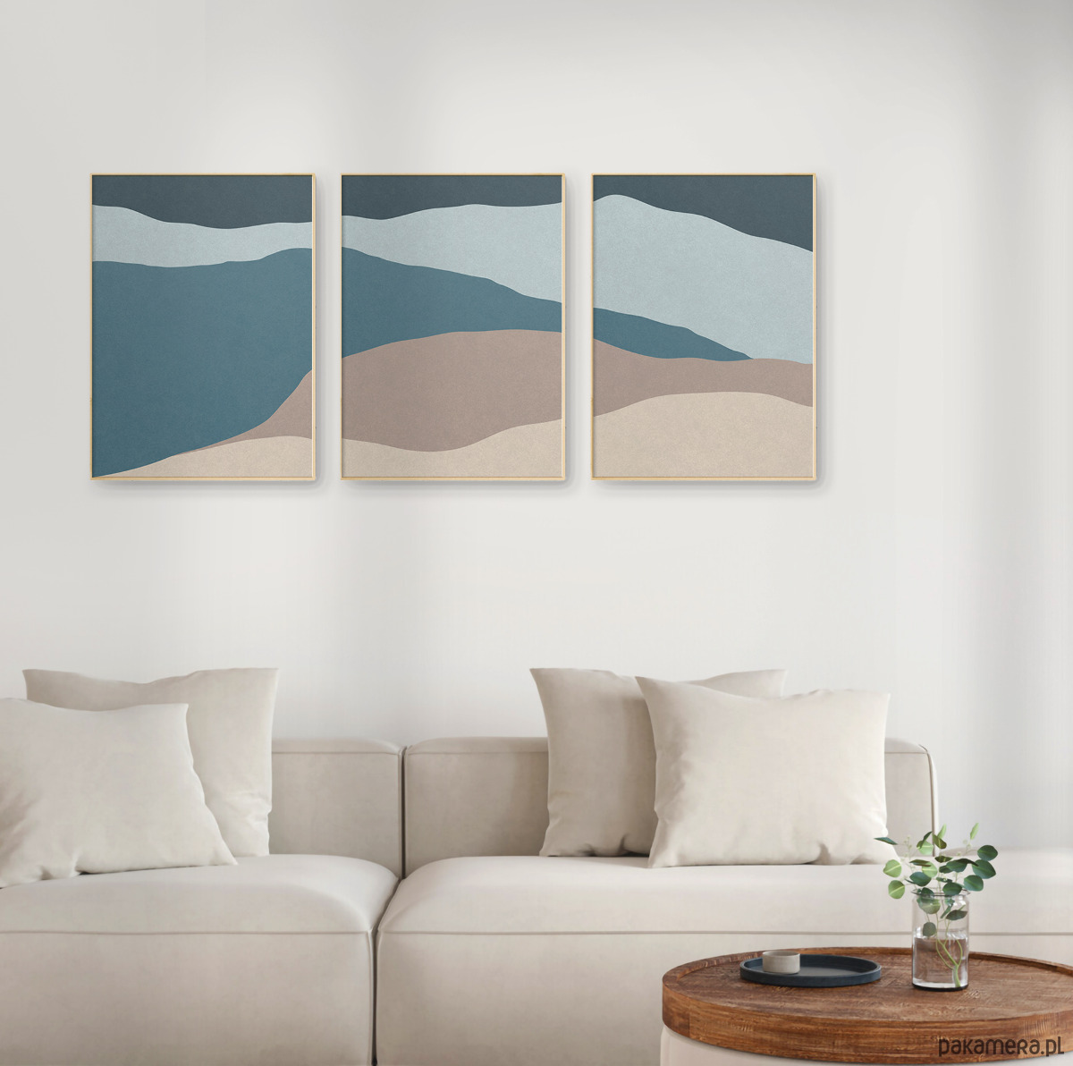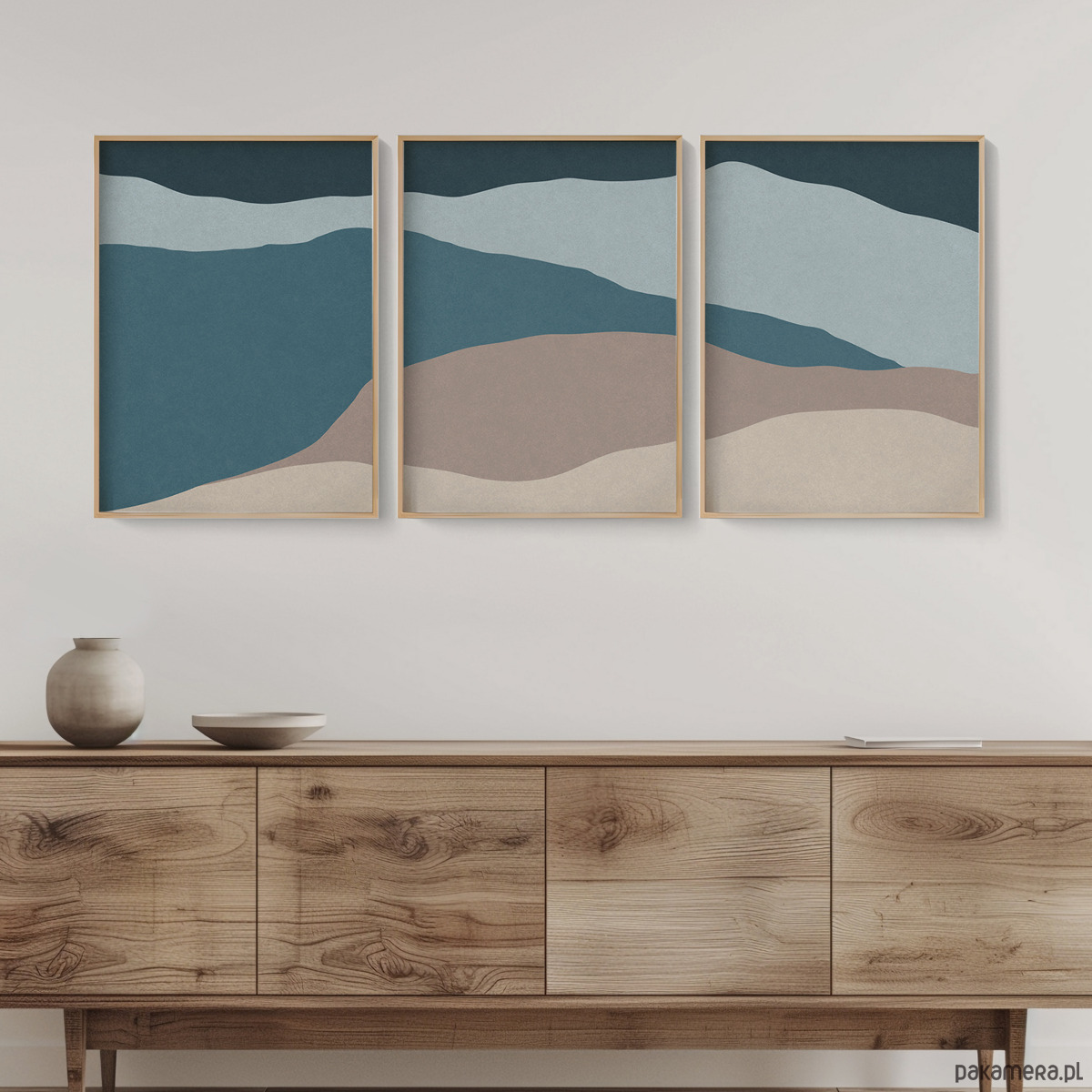 Abstrakcyjny zestaw 3 plakatów w formie tryptyku, inspirowany motywem morza. Proste, geometryczne formy, delikatna tekstura oraz stonowana kolorystyka tworzą spójną kompozycję, która doskonale odnajdzie się w nowoczesnych i minimalistycznych wnętrzach.