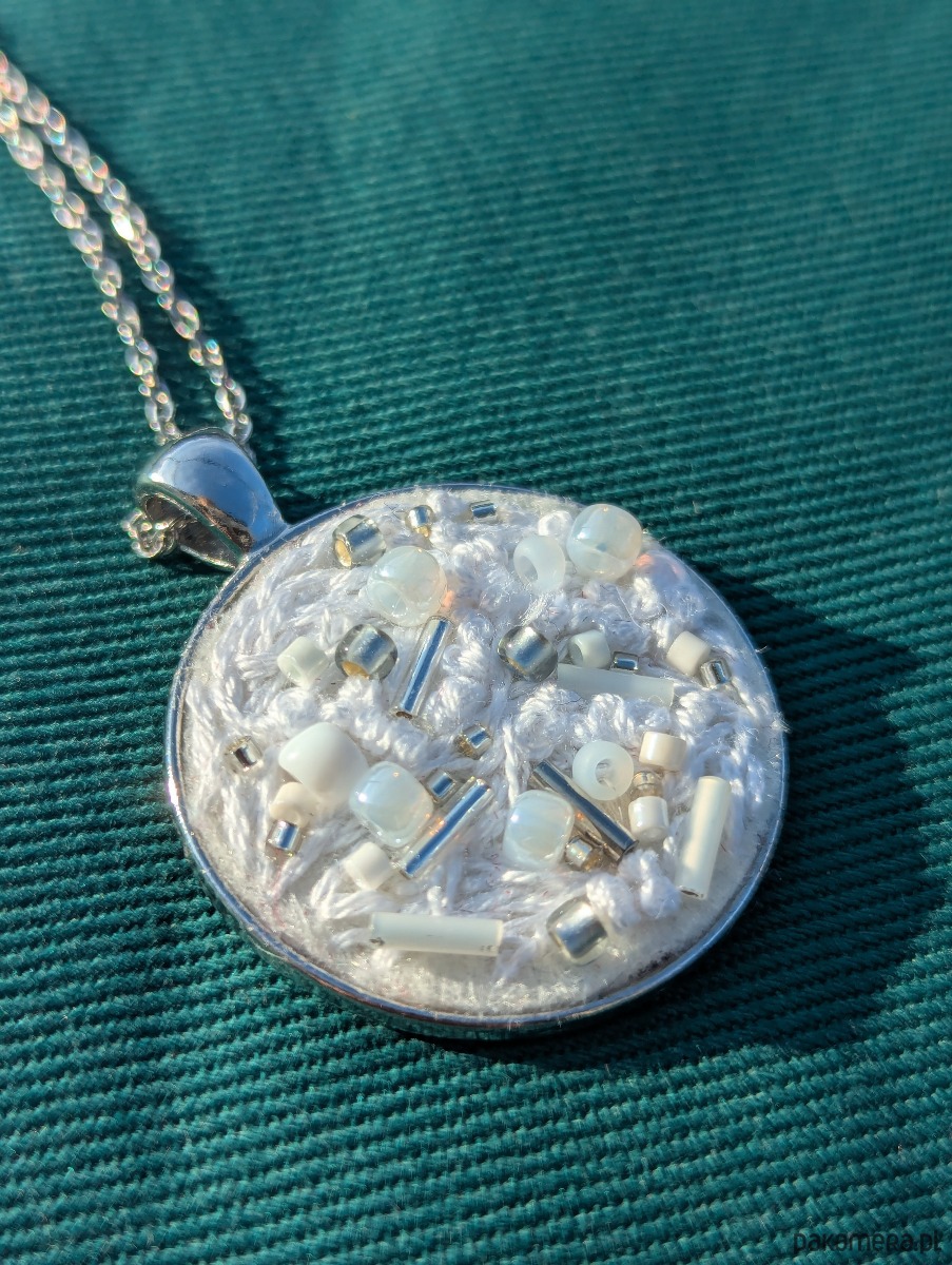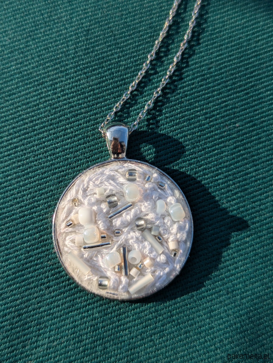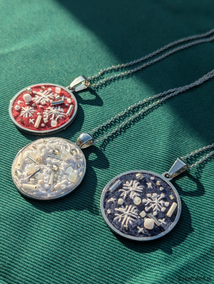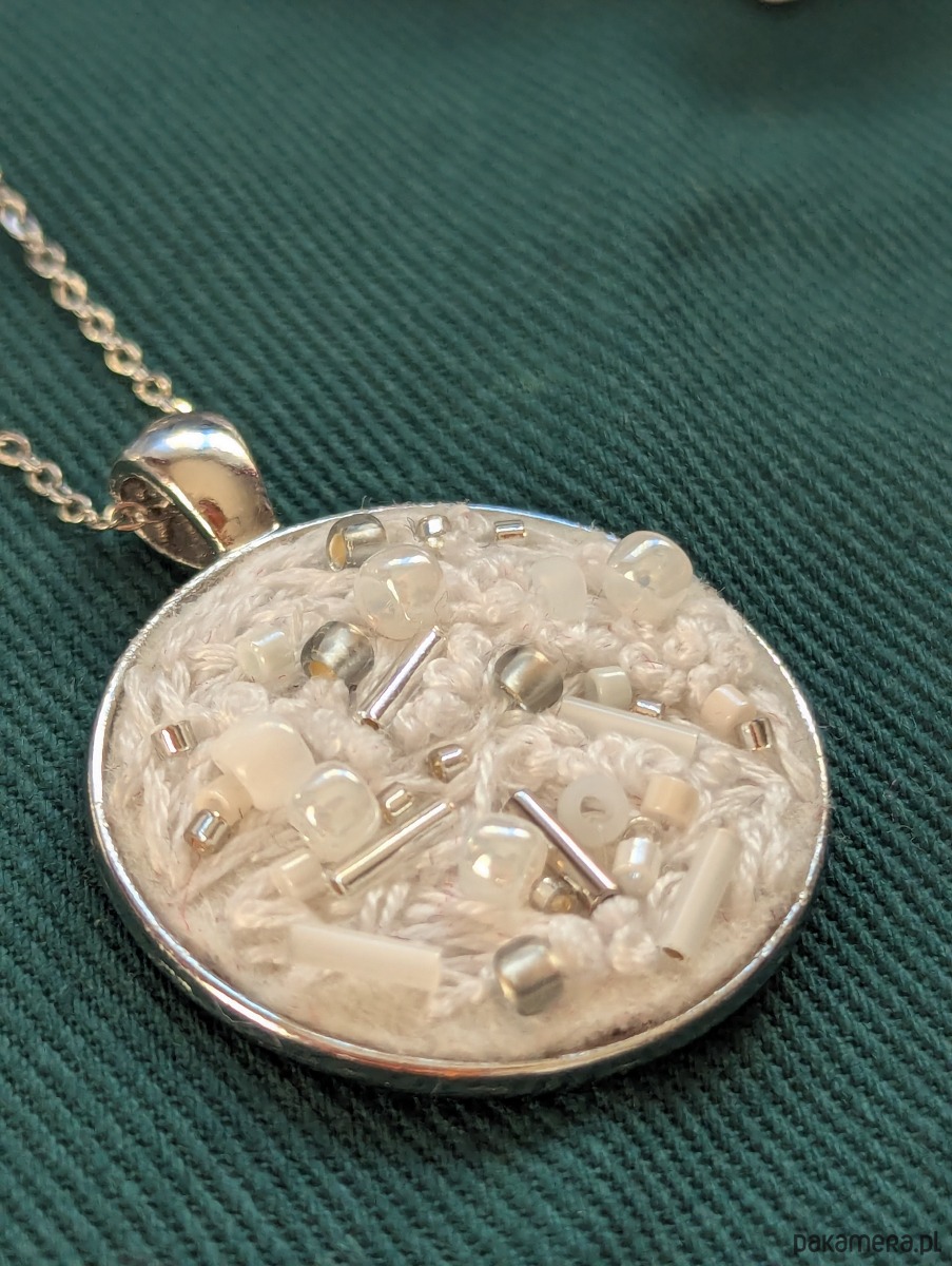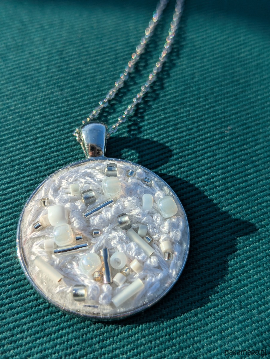 Ten ręcznie haftowany naszyjnik powstał z zimowej inspiracji – z ciszy, która zapada, gdy świat okrywa się świeżym śniegiem. Haft wykonałam w odcieniach bieli, a całość dopełniłam połyskującymi koralikami różnej wielkości w kolorze srebra i bieli. Dzięki nim naszyjnik delikatnie odbija światło, przypominając o iskrzącym śniegu w promieniach zimowego słońca.