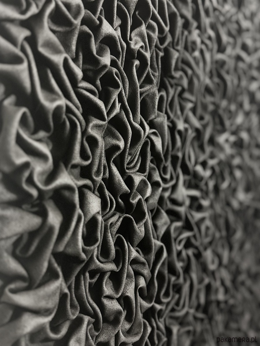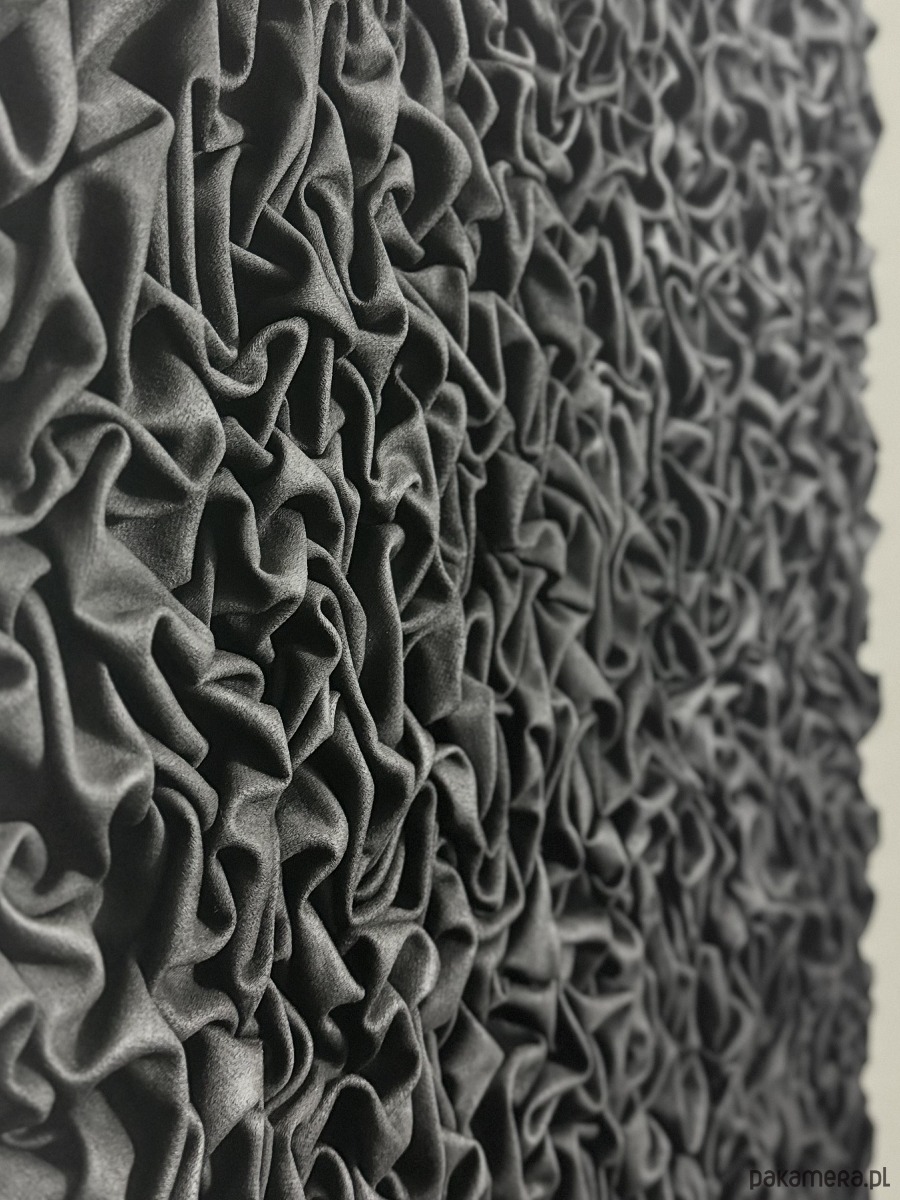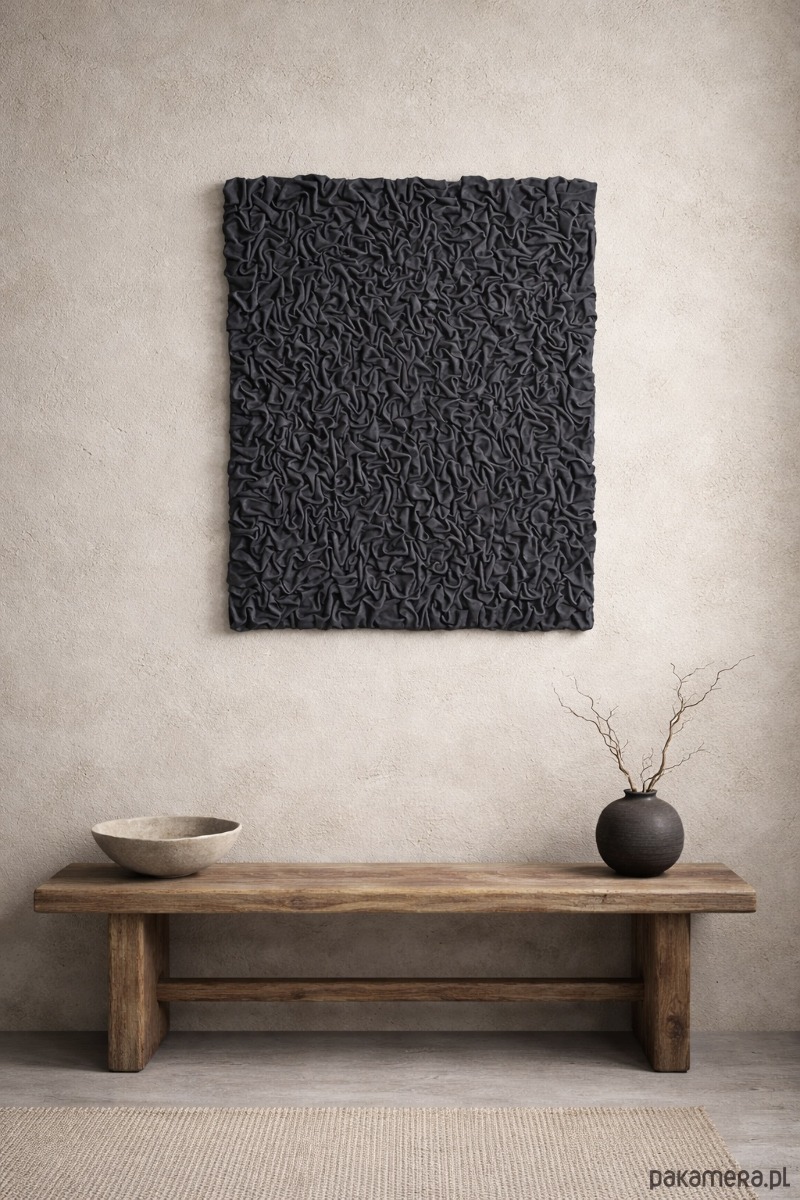 Ręcznie wykonany, strukturalny obraz ścienny stworzony z czarnej tkaniny, formowanej i usztywnionej w sposób bezpieczny oraz trwały. Powierzchnia obrazu opiera się na rytmie zagnieceń, światłocieniu i głębi faktury. Każdy fragment inaczej reaguje na światło, tworząc dynamiczną, ale spokojną całość.