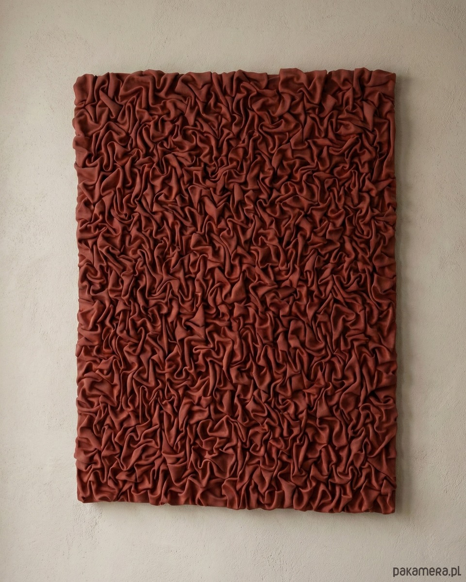 Ręcznie wykonany, strukturalny obraz ścienny stworzony z czerwonej tkaniny, formowanej i usztywnionej w sposób bezpieczny oraz trwały. Powierzchnia obrazu opiera się na rytmie zagnieceń, światłocieniu i głębi faktury. Każdy fragment inaczej reaguje na światło, tworząc dynamiczną, ale spokojną całość.