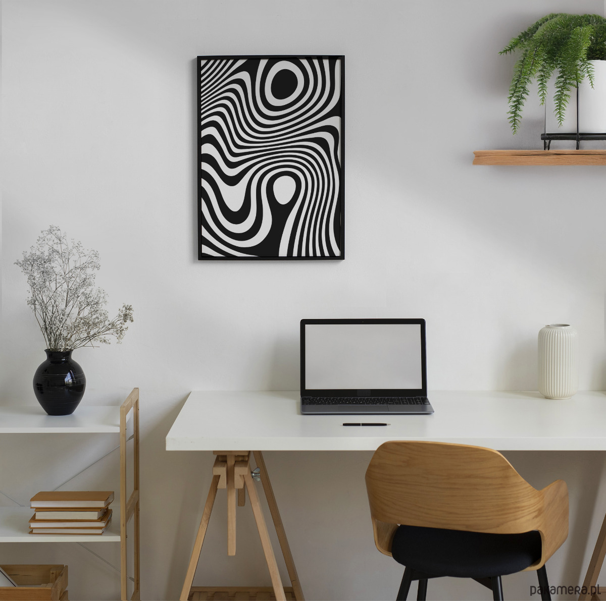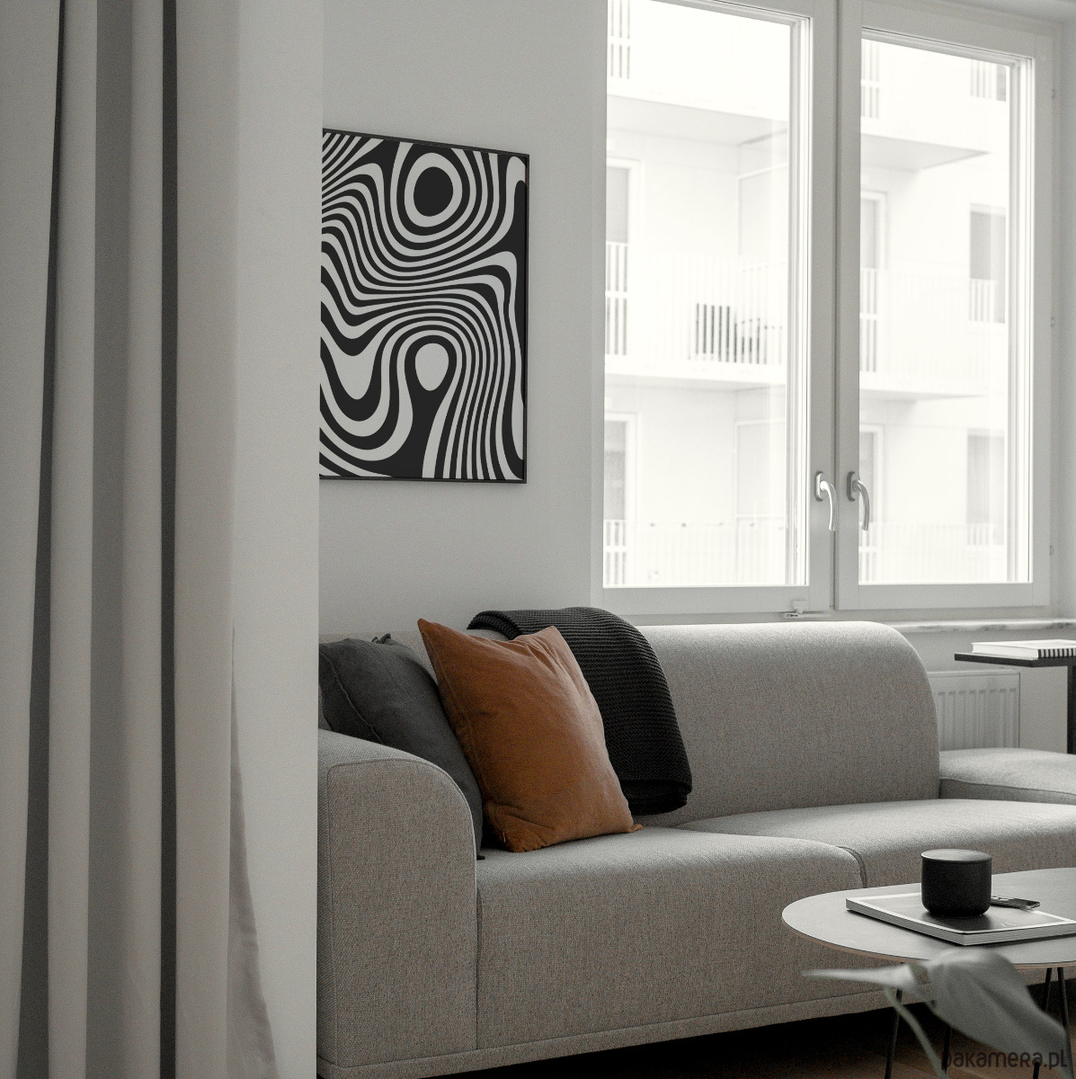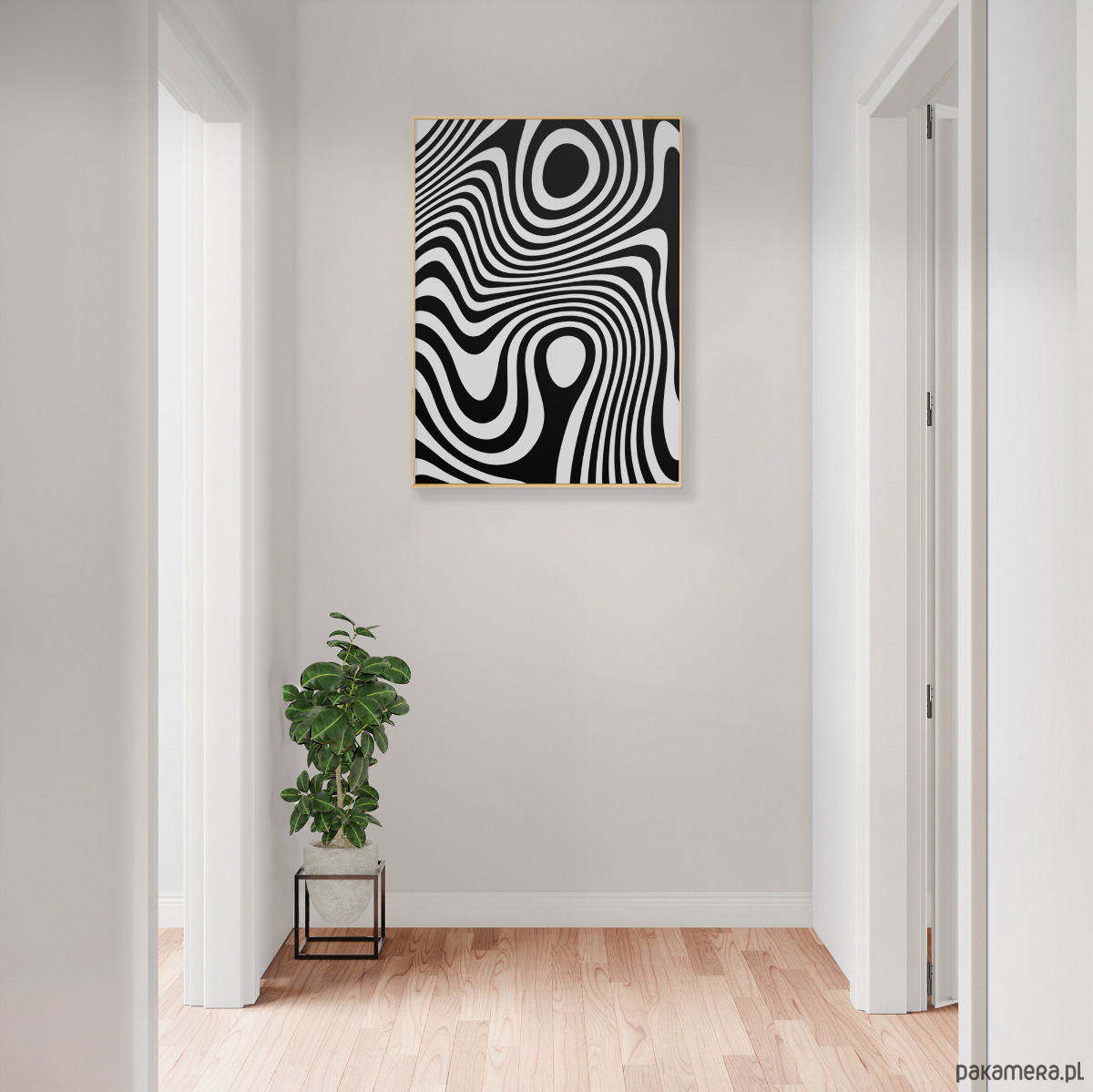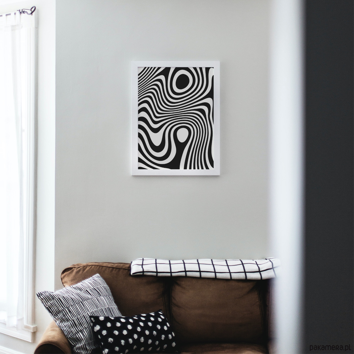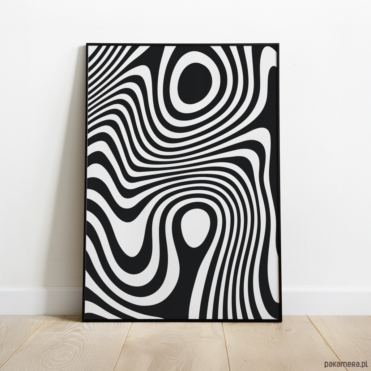 Autorska grafika w formie geometrycznego plakatu. Abtrakcyjne kształty oraz czarno-biała paleta barw nadają grafice spójny, wyważony charakter, dobrze komponując się z nowoczesnymi wnętrzami.