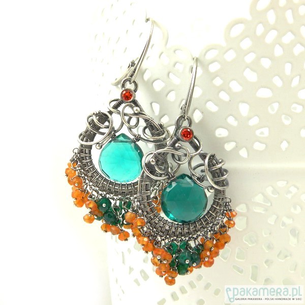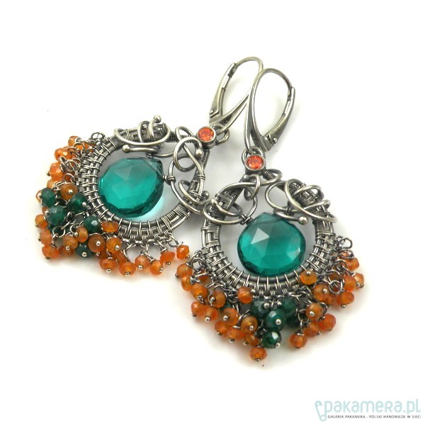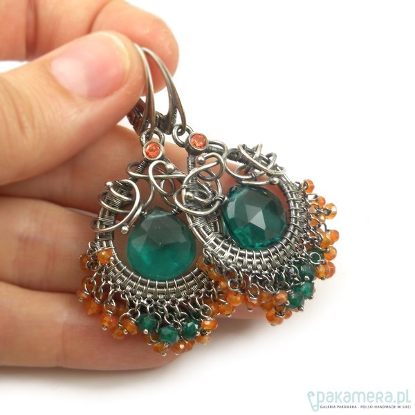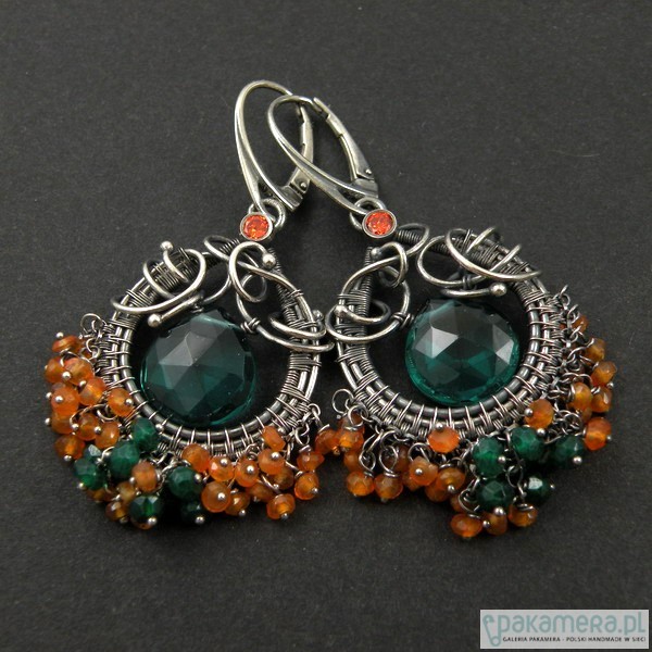 Dwukolorowe kolczyki wykonane w pracochłonnej technice wire-wrapping ze srebra, kwarcu zielonego, karneolu i cyrkonii. Całość została zoksydowana (przyciemniona) i wypolerowana. Długość bez zawieszki 4,2 cm. Biżuteria zostanie ozdobnie zapakowana.