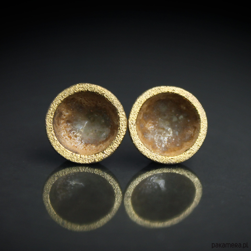 Efektowne nieregularne kolczyki w formie sztyftów, ręcznie wykonane z delikatnej kamionki, wykonane z wykorzystaniem tradycyjnych technik wypalania z użyciem szkliw popiołowych pozyskanych z nasion afrykańskiego ziela snów, na antyalergicznych sztyftach w kolorze srebrnym. średnica elementu ceramicznego ok. 10mm, grubość około 4mm.