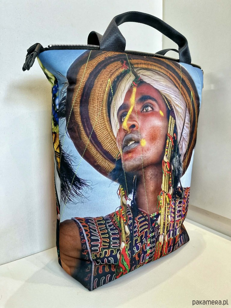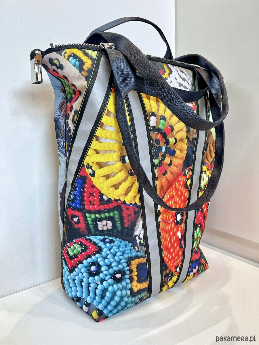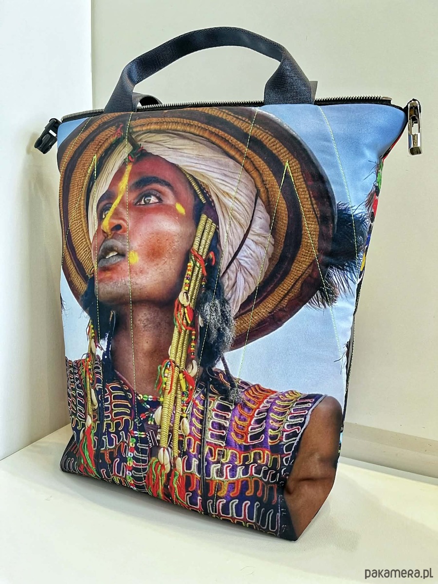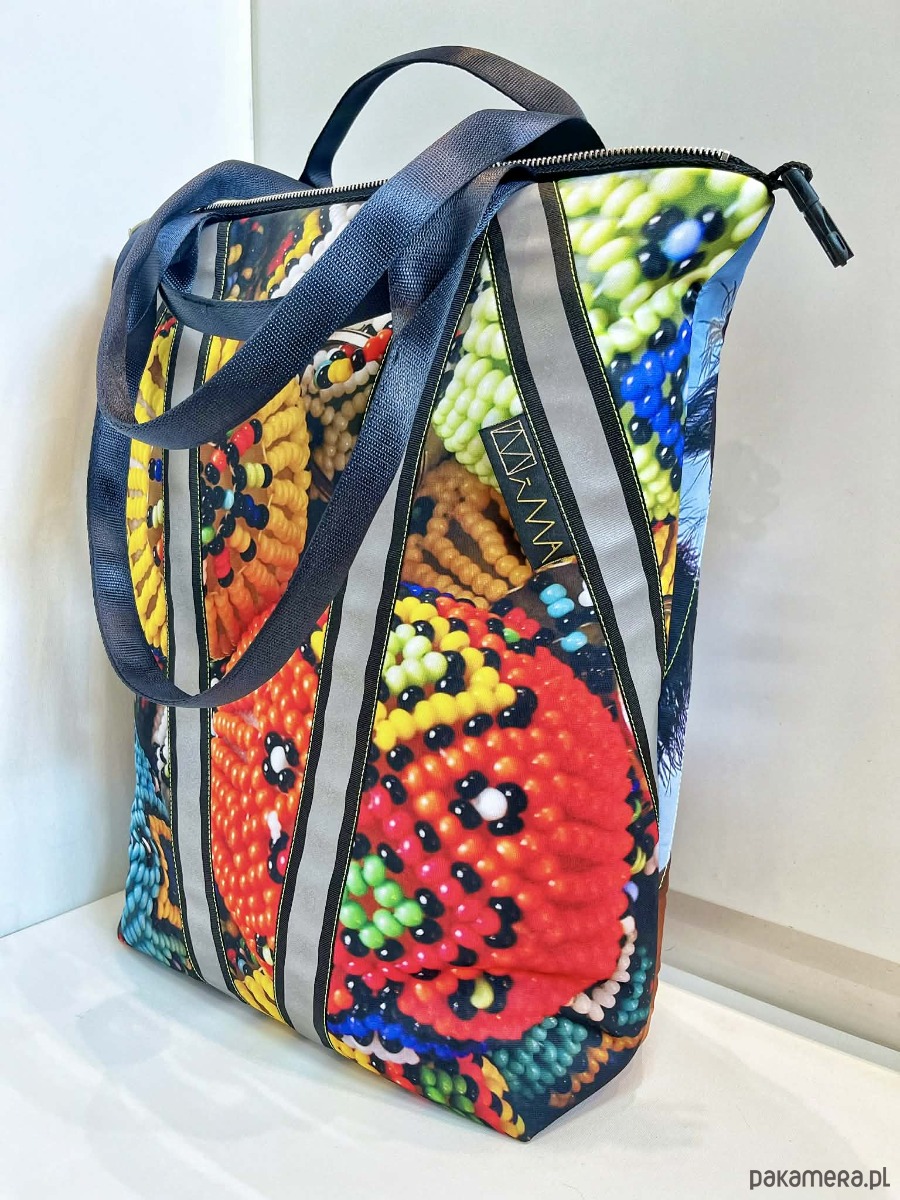 torba MIMA ze zdjęciami wykonanymi w Afryce, można ja prać w 30*C, można prasować, wykonana w jednym niepowtarzalnym zestawieniu zamków i taśm fluo, dwie możliwości zapinania, zamek / zatrzask, trzy kieszenie wewnątrz, wymiar 46x54 cm, uszy wykonane z pasów samochodowych. Mala seria, tylko kilka produktów z linii Afryka. Sample