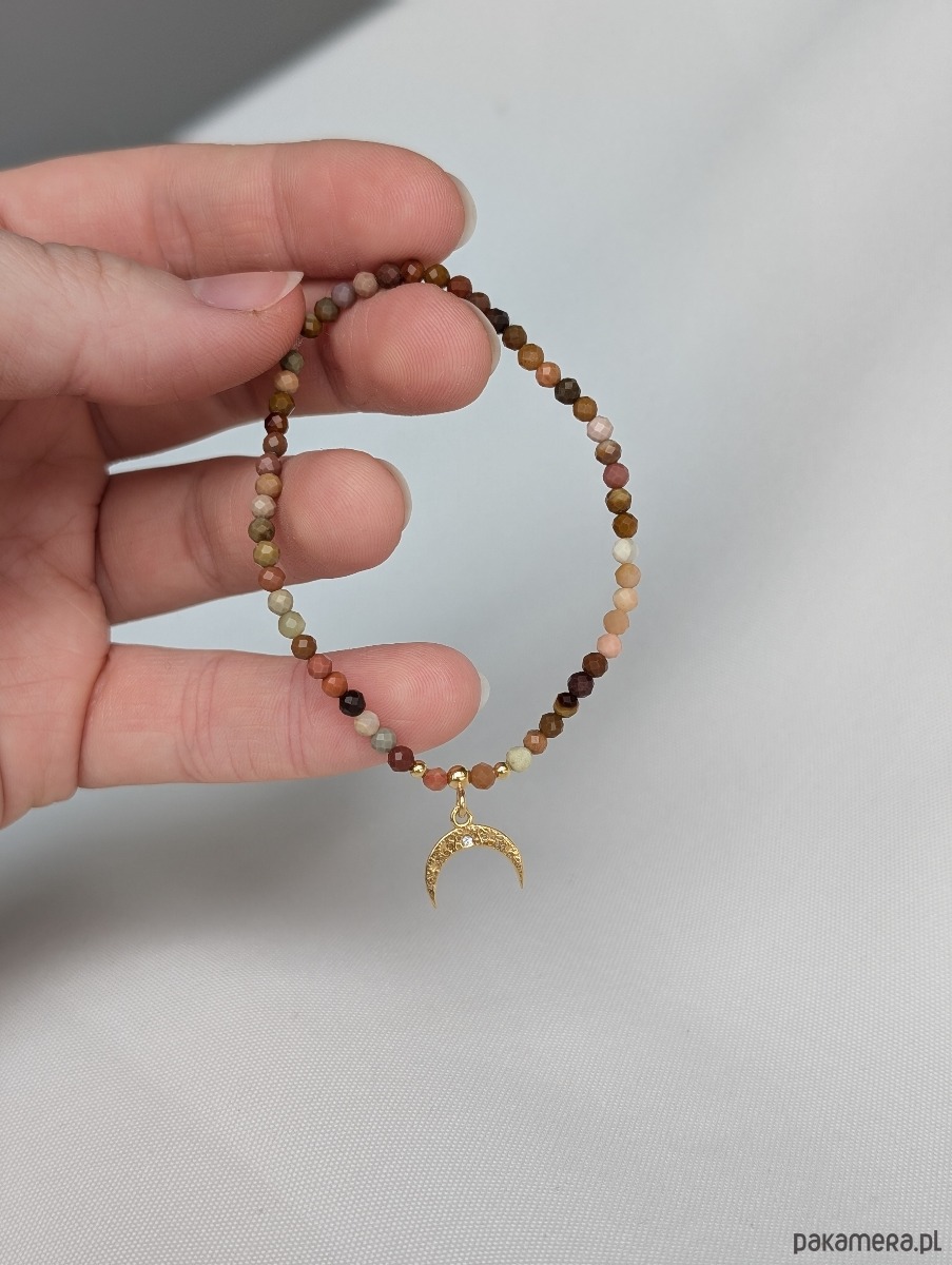 Piękna kompozycja agatów w kolorach ziemi i ognia, zwieńczona pozłacaną zawieszką z księżycem.
