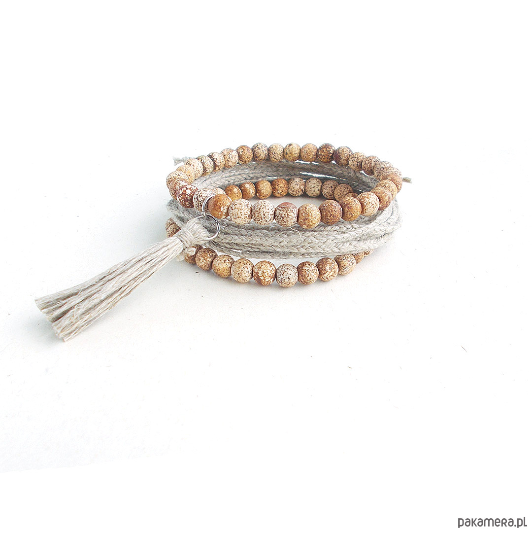 Zestaw 3 naturalnych bransoletek wykonanych z matowych kul agatu i naturalnego lnu