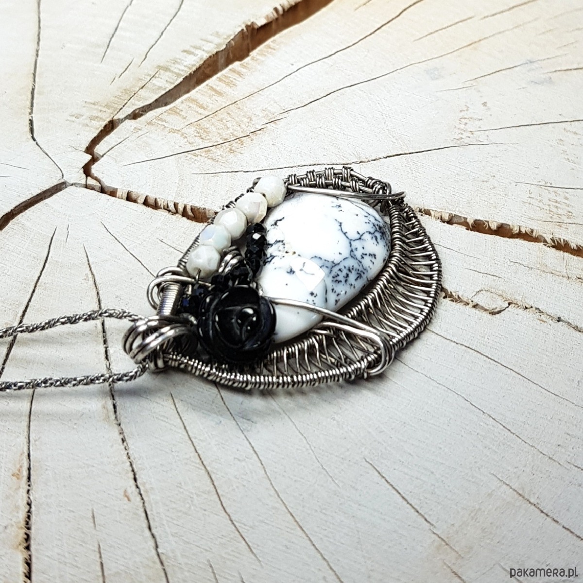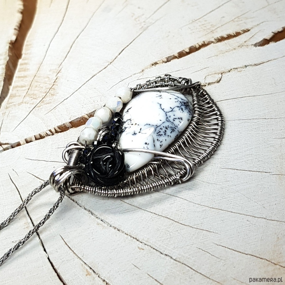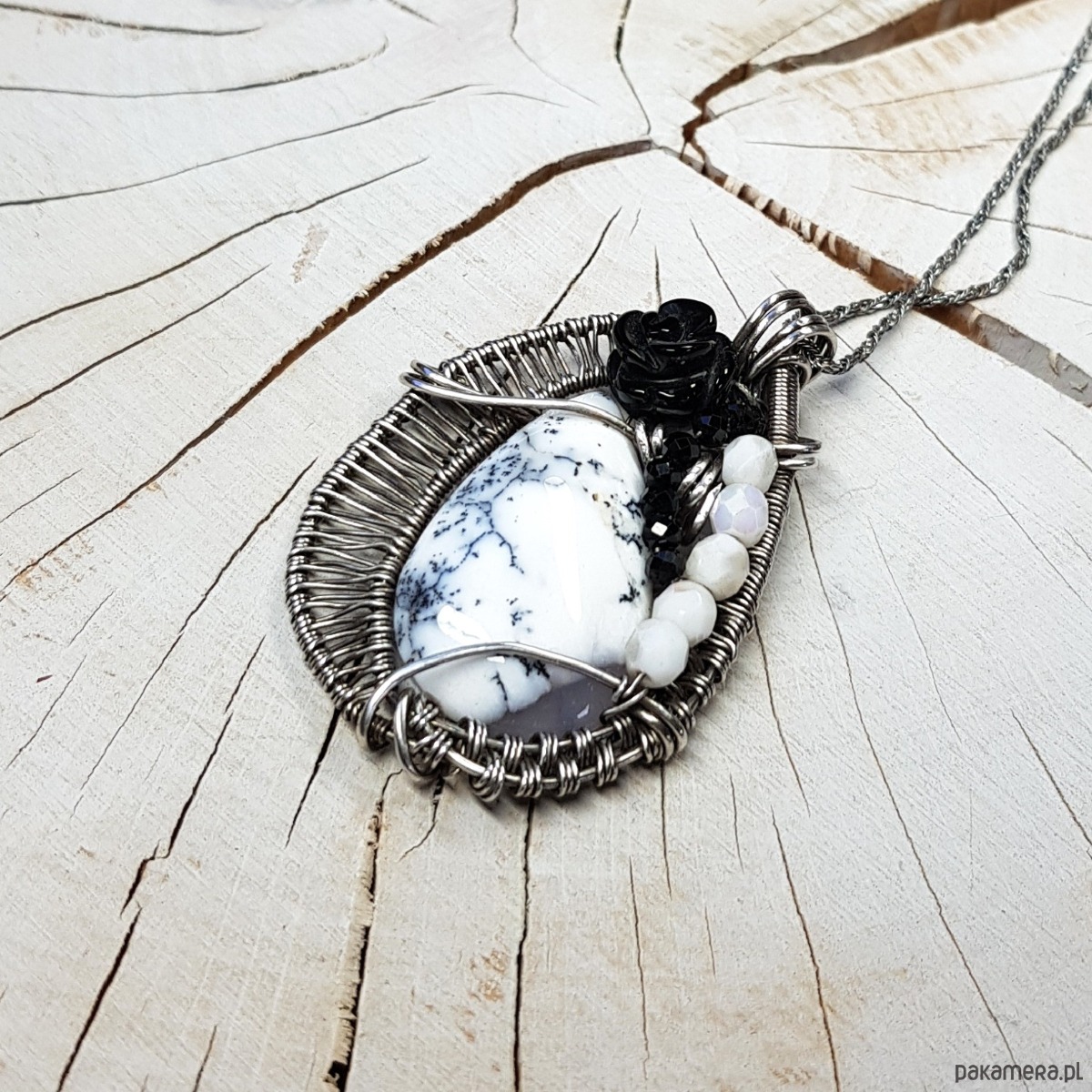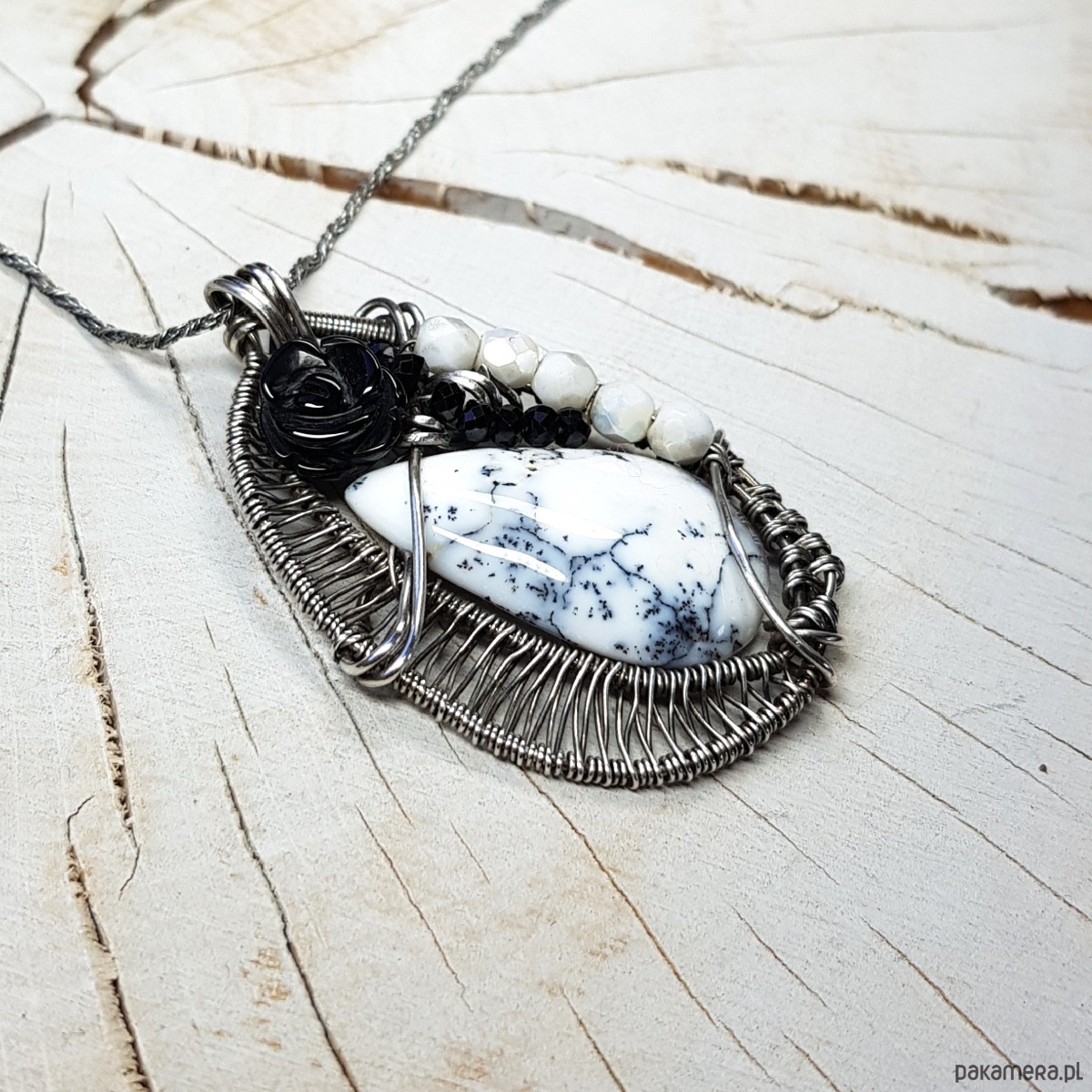 Zawieszka na łańcuszku wykonana z agatu dendrytowego, czarnej onyksowej róży i połyskujących spineli. Naszyjnik zrobiony ręcznie w srebrze próby 999 pracochłonną metodą wire-wrappingu, następnie oksydowany i wypolerowany. Wymiary naszyjnika 48x30 mm, zawieszony na łańcuszku długości około 46-50cm. Naszyjnik bardzo niepowtarzalny, elegancki, jednocześnie radosny.