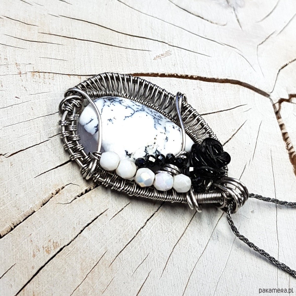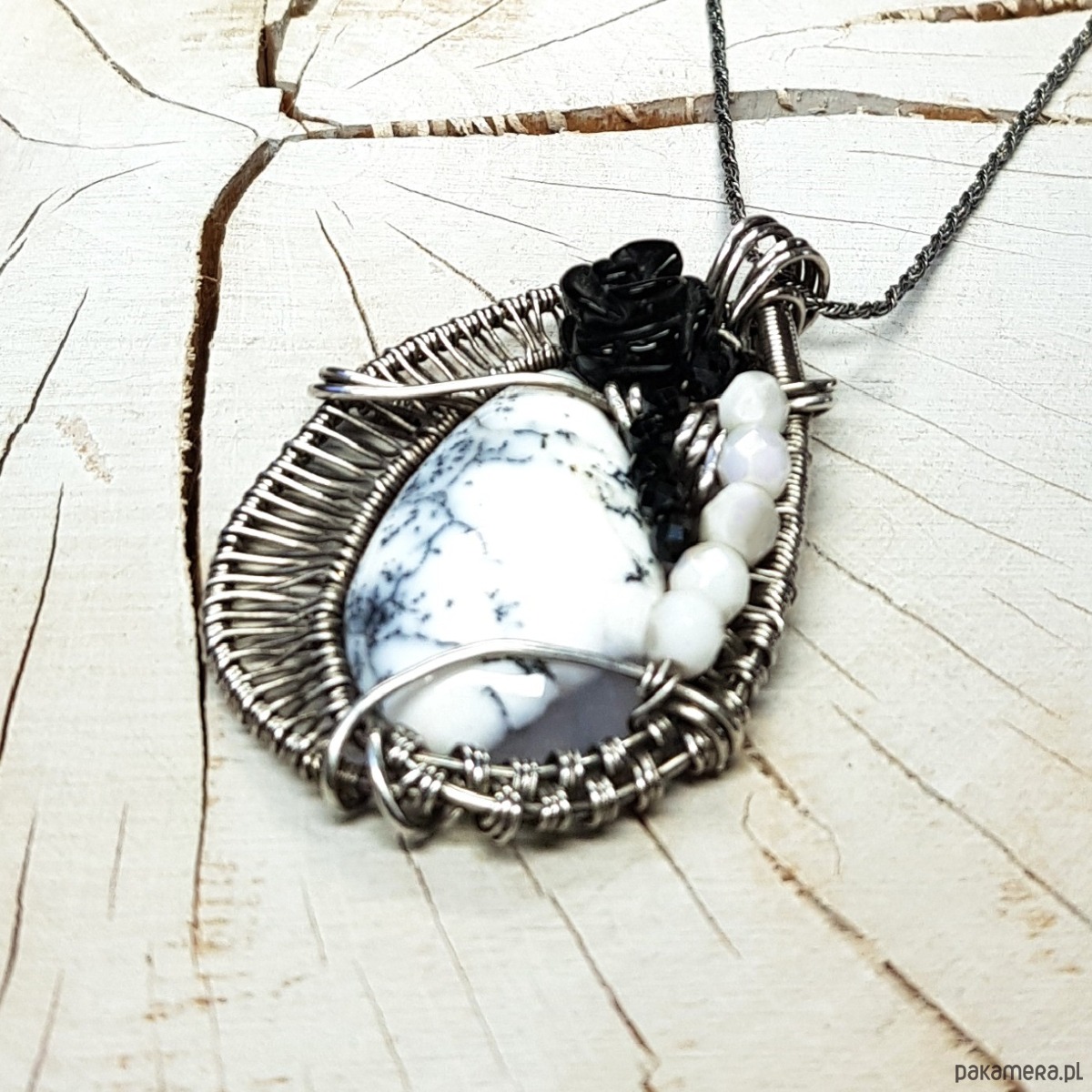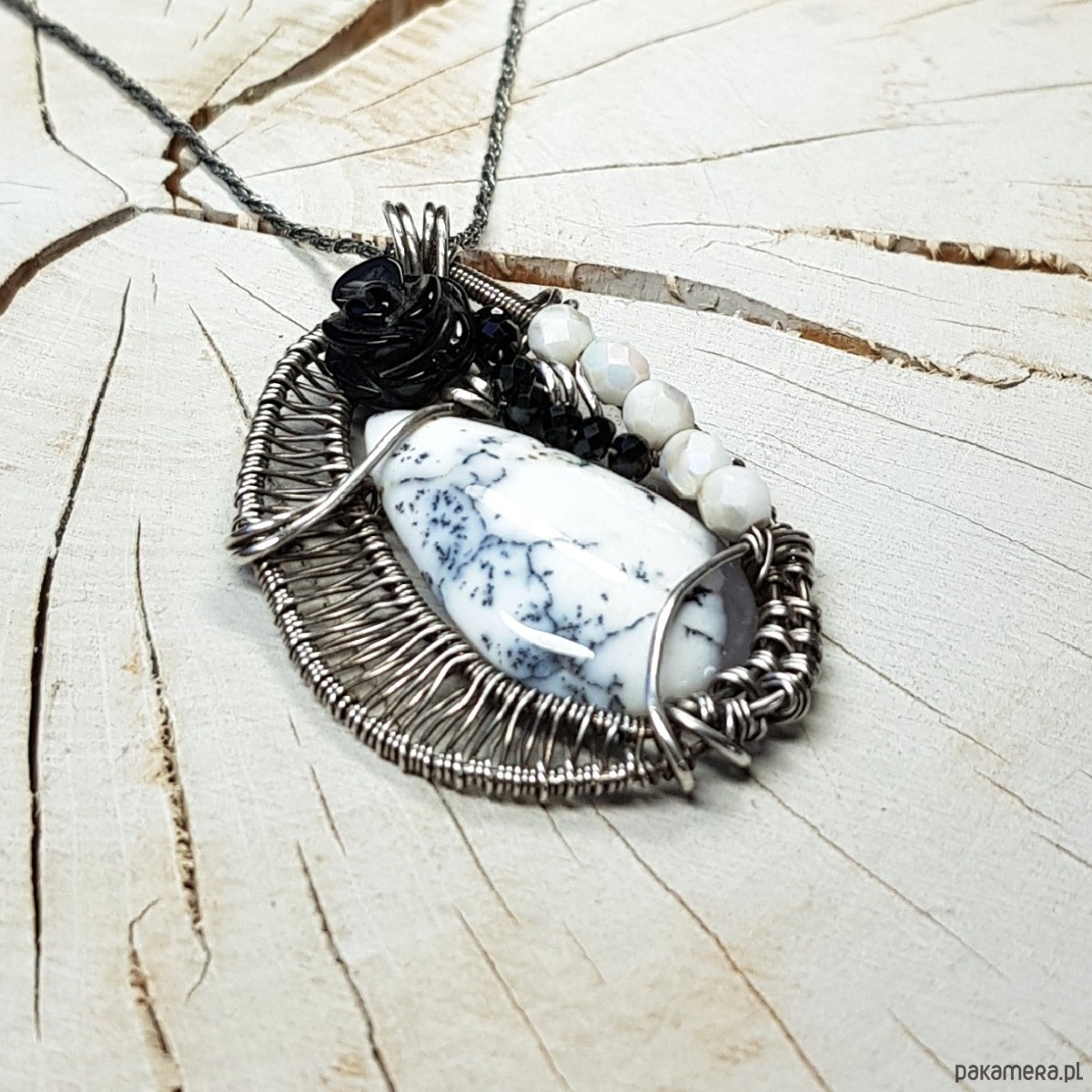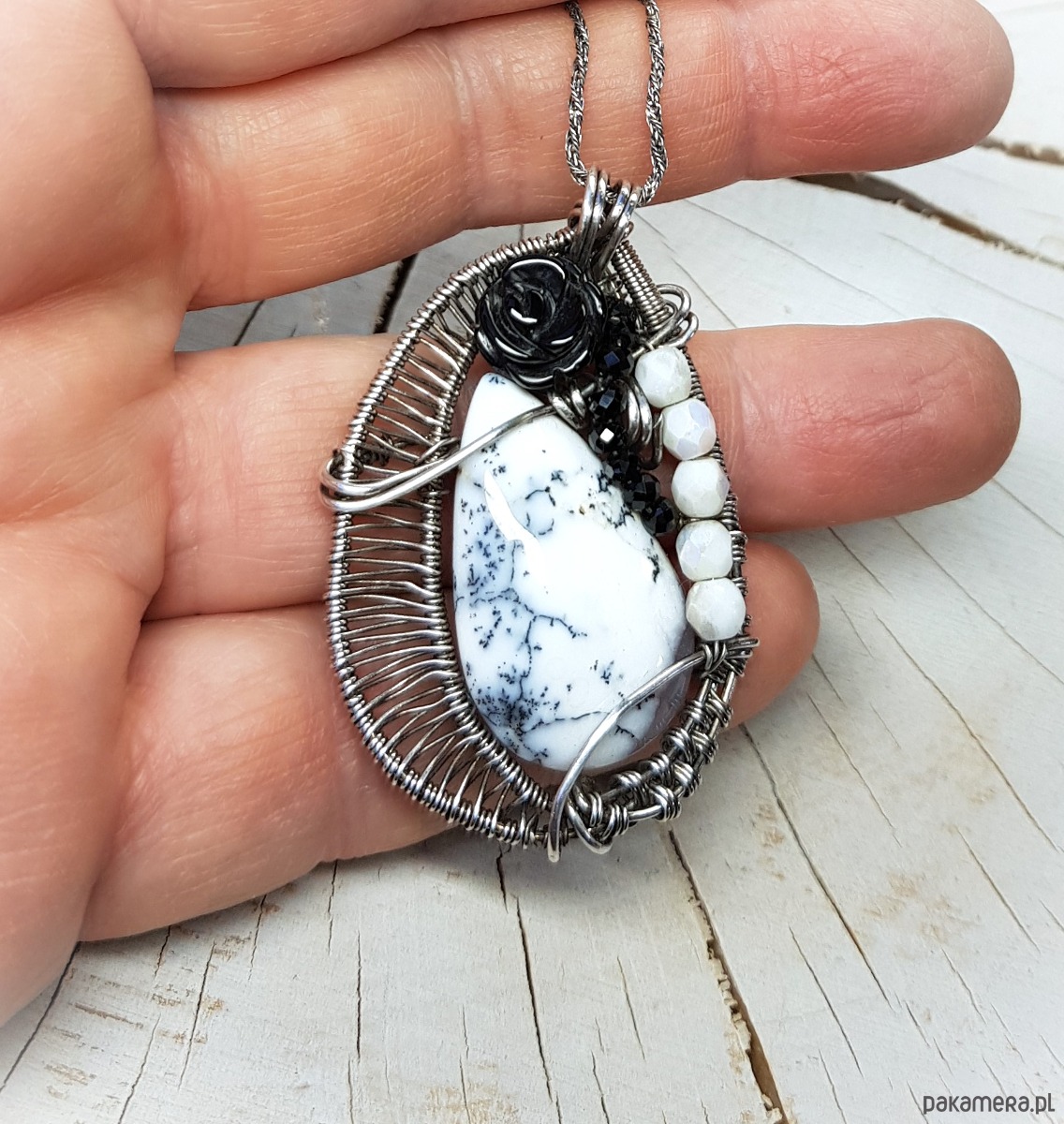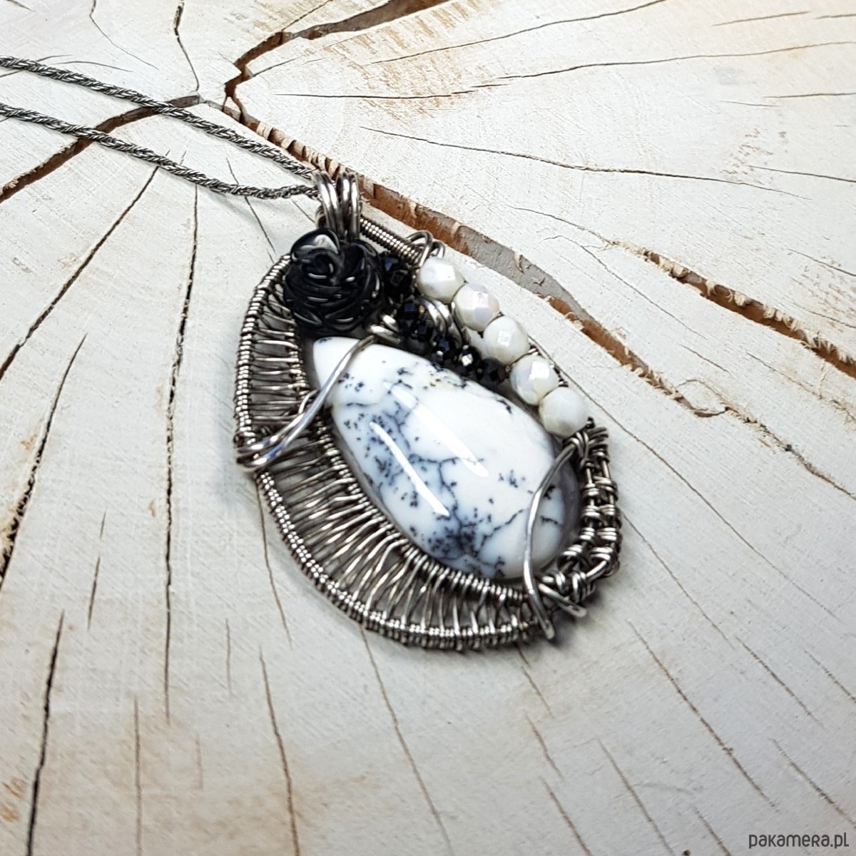 Zawieszka na łańcuszku wykonana z agatu dendrytowego, czarnej onyksowej róży i połyskujących spineli. Naszyjnik zrobiony ręcznie w srebrze próby 999 pracochłonną metodą wire-wrappingu, następnie oksydowany i wypolerowany. Wymiary naszyjnika 48x30 mm, zawieszony na łańcuszku długości około 46-50cm. Naszyjnik bardzo niepowtarzalny, elegancki, jednocześnie radosny.