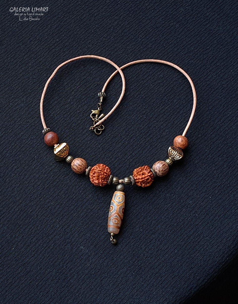 Agat DZI i rudraksha w niezwykłym etnicznym naszyjniku unikat handmade UNISEX