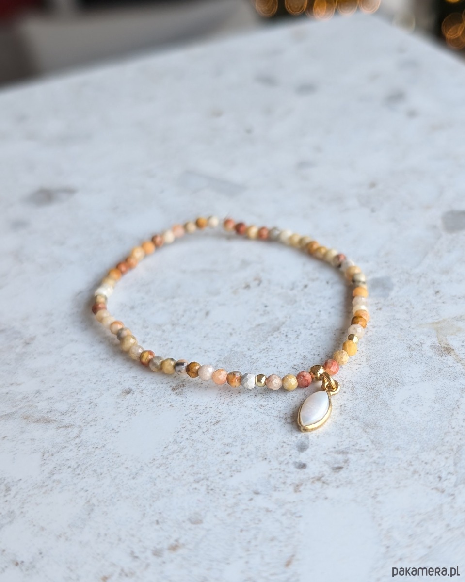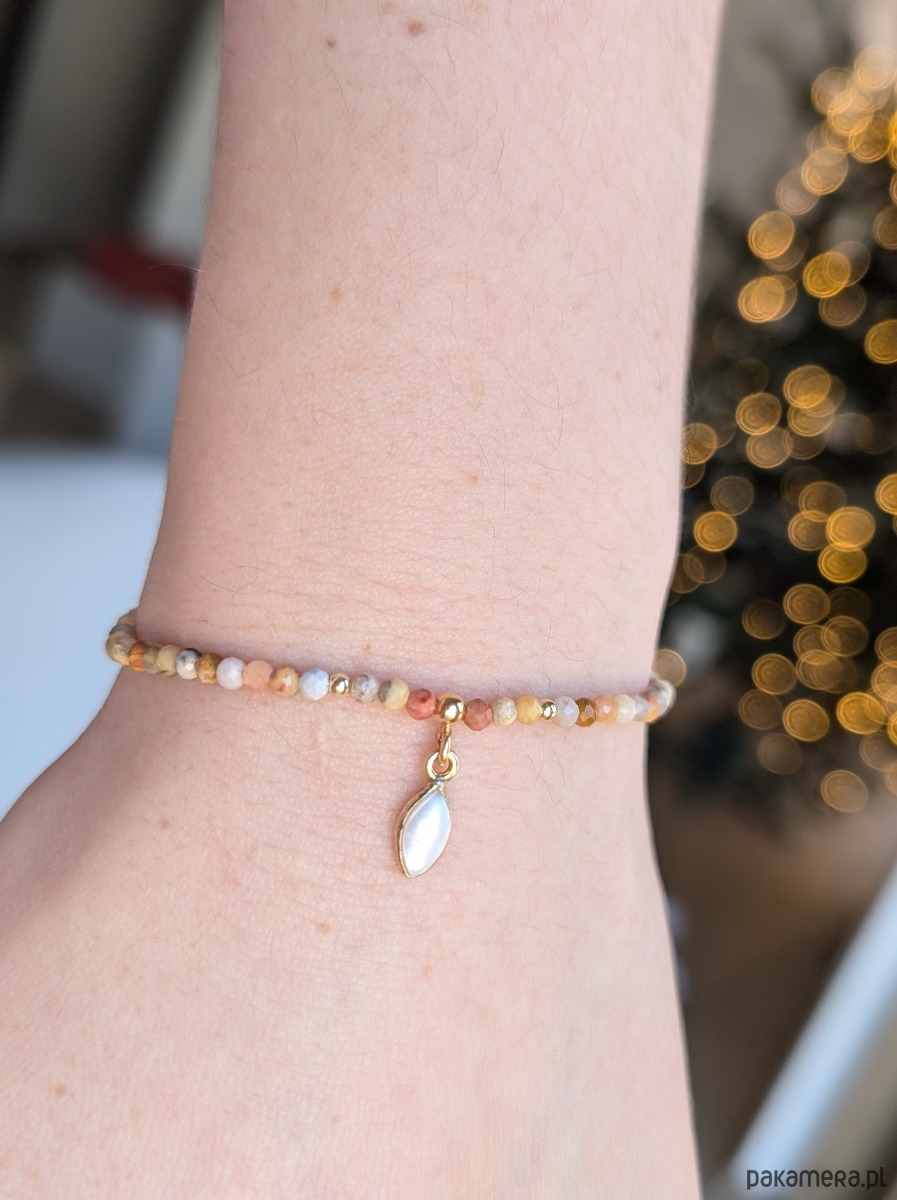 - Niepowtarzalne kamienie naturalne - unikalne, zmienne w zależności od światła, wyselekcjonowane i skomponowane tak, aby mimo różnic w odcieniu i kolorze zachować estetykę bransoletki.