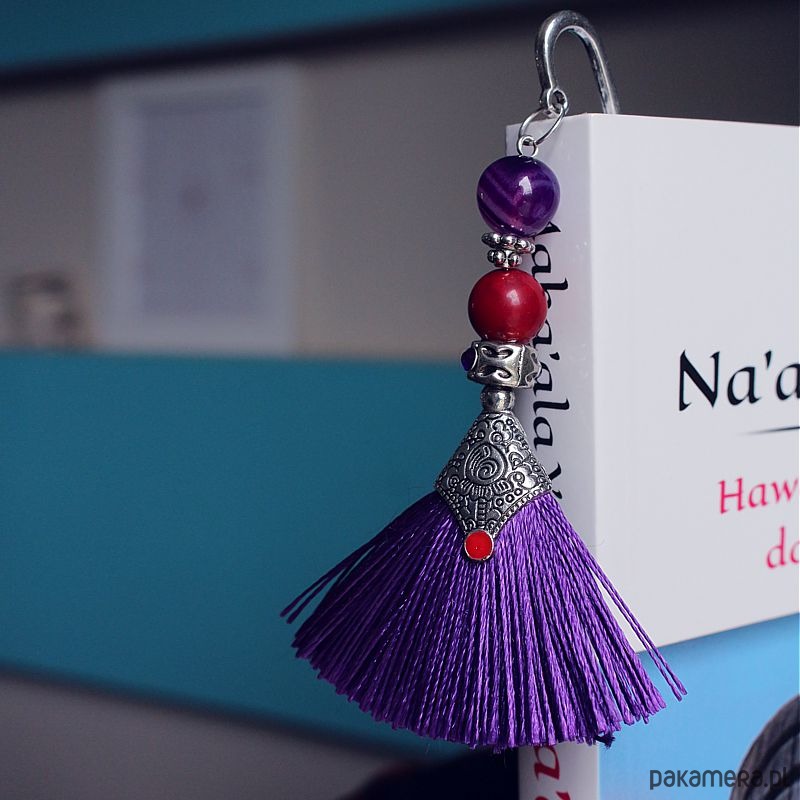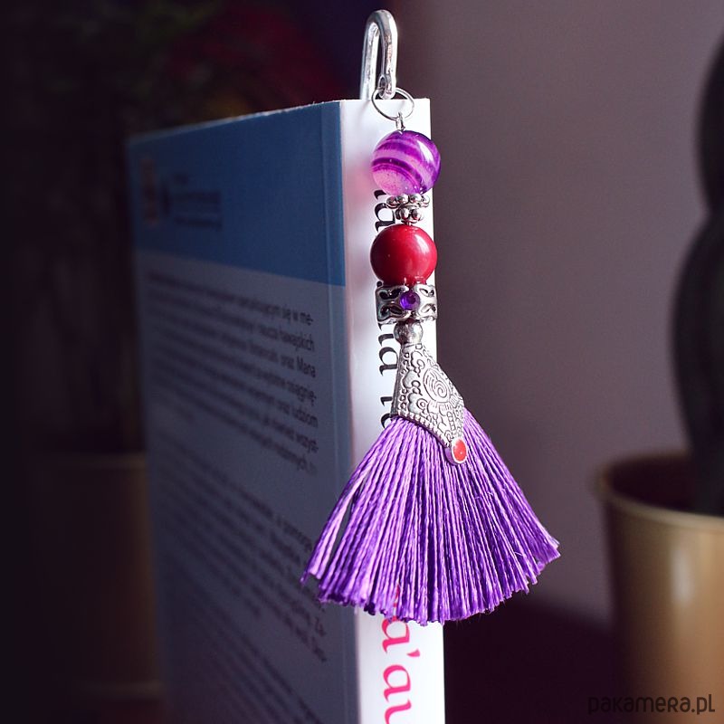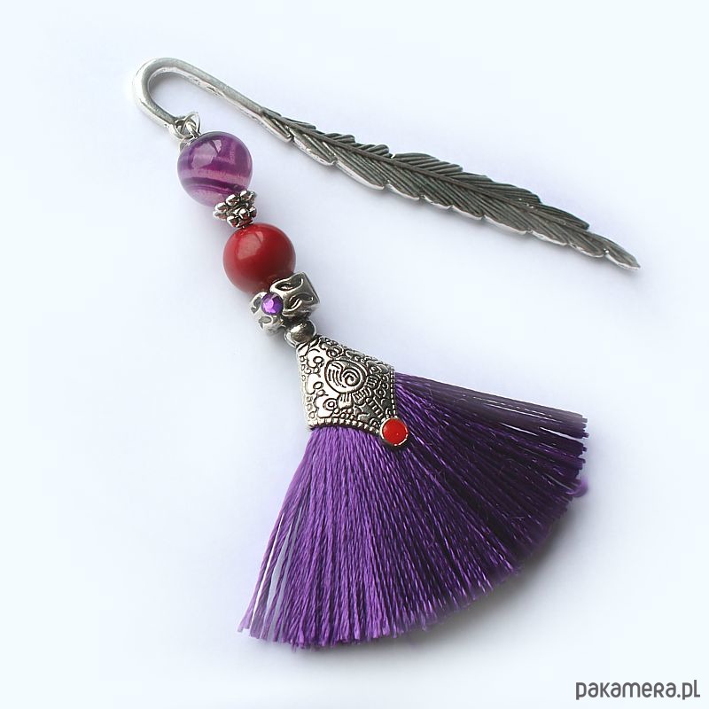 Elegancka etno zakładka do książki z agatem fioletowym i czerwonym koralem. Ozdobiona cyrkoniami.