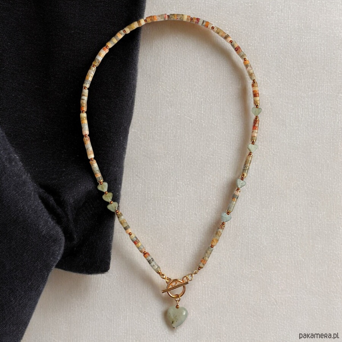 Piękny naszyjnik wykonany z połączenia agatu crazy lace 4,5mm (w odcieniach beż-miód-szarość), serca z labradorytu (ok. 13x15mm) i przekładek ze złotego hematytu.
