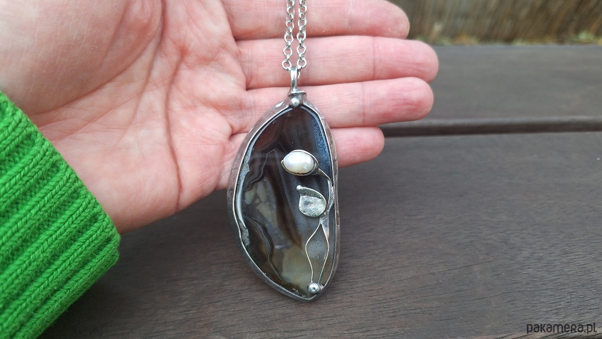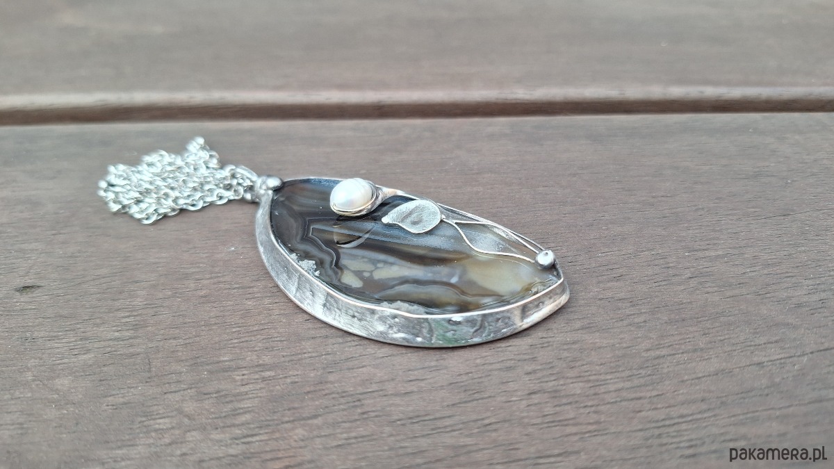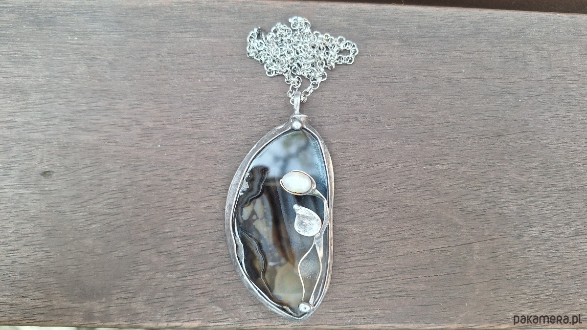 Wisiorek wykonany z miedzi, cyny, perły i agatu. Wymiary ok. 7 na 3.5 cm. Zawieszony na łańcuszku o długości ok. 50 cm.