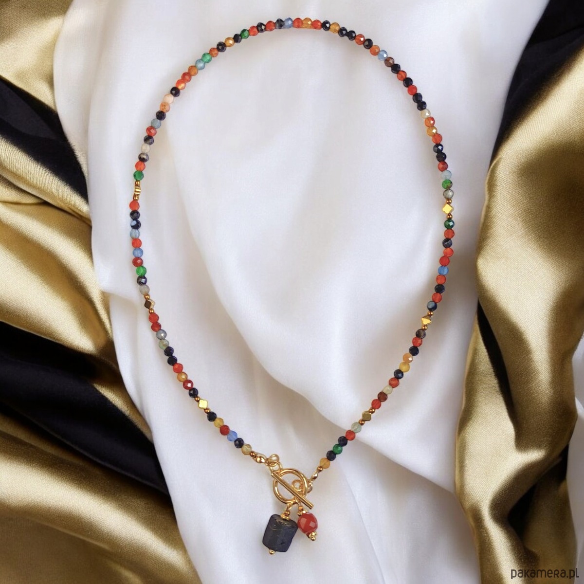 Przy zapięciu : 2 zawieszki: karneol (fasetowana kostka 7mm), surowy turmalin (bryłka ok. 12-13mm)