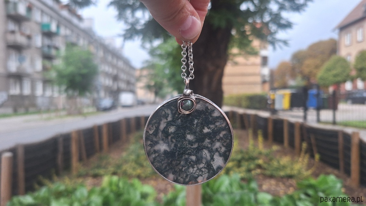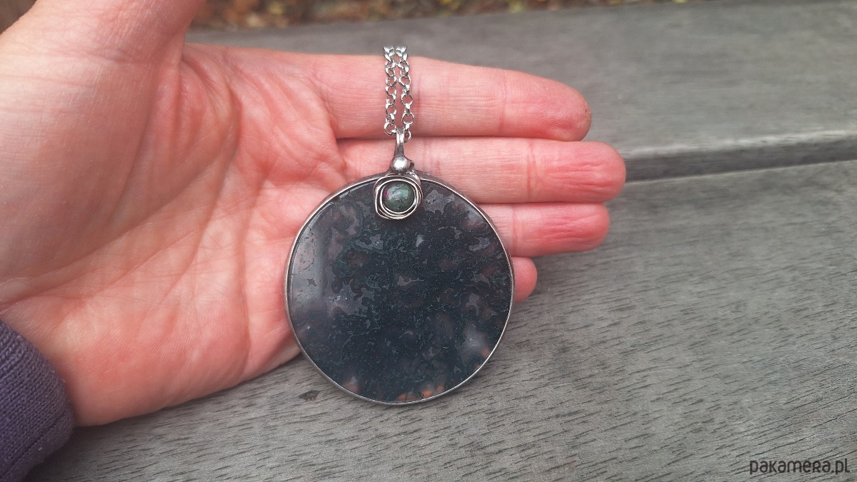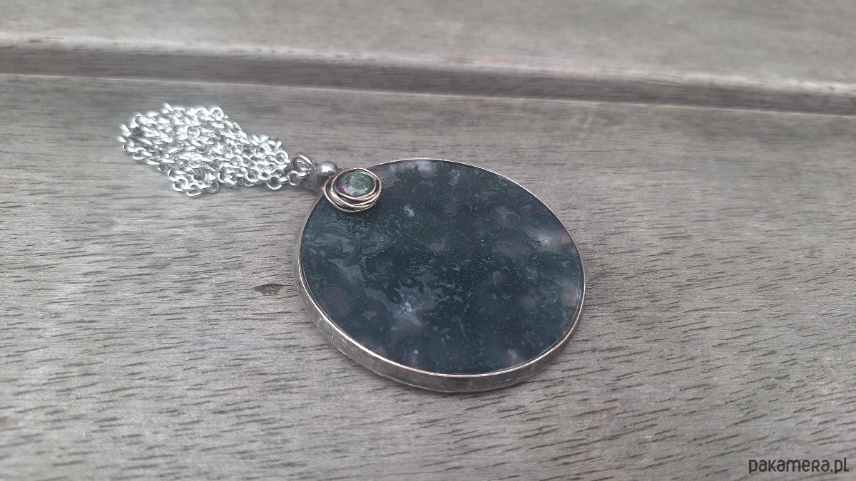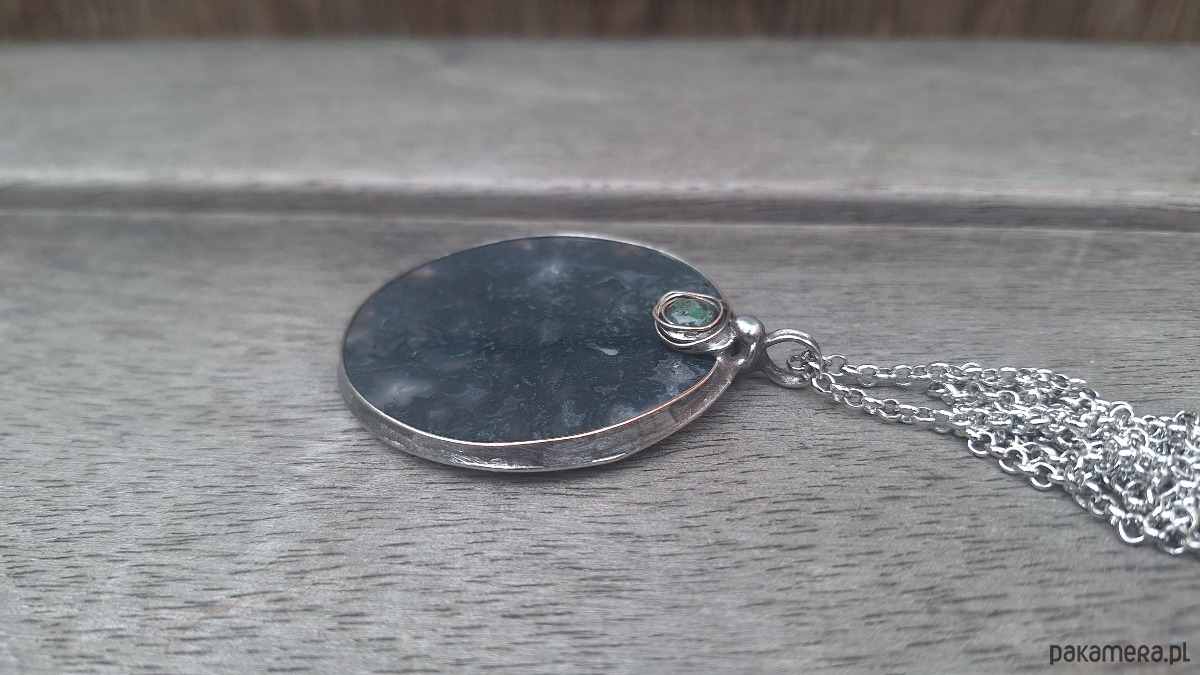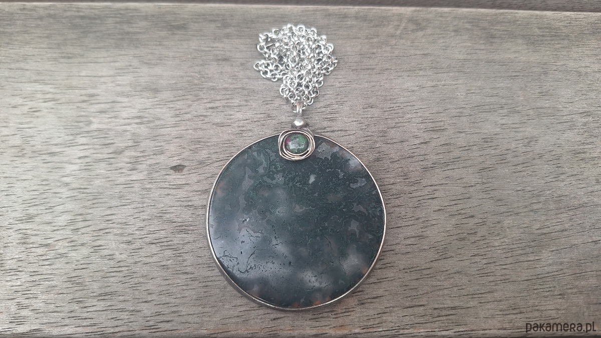 Wisiorek wykonany z miedzi, cyny, zoisytu i agatu mszystego. Wymiary ok. 5.5 na 5.5 cm. Zawieszony na łańcuszku o długości ok. 50 cm.