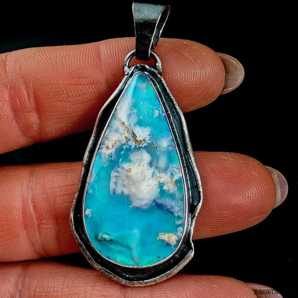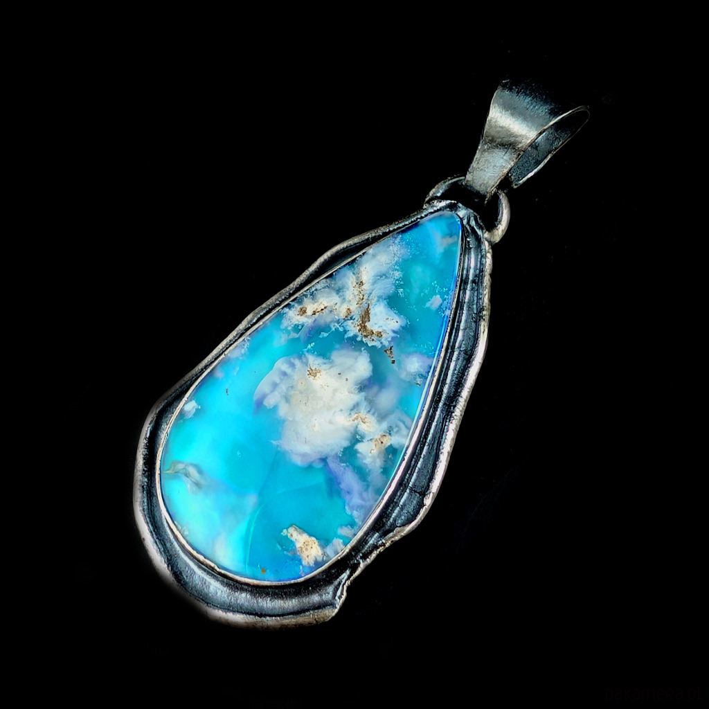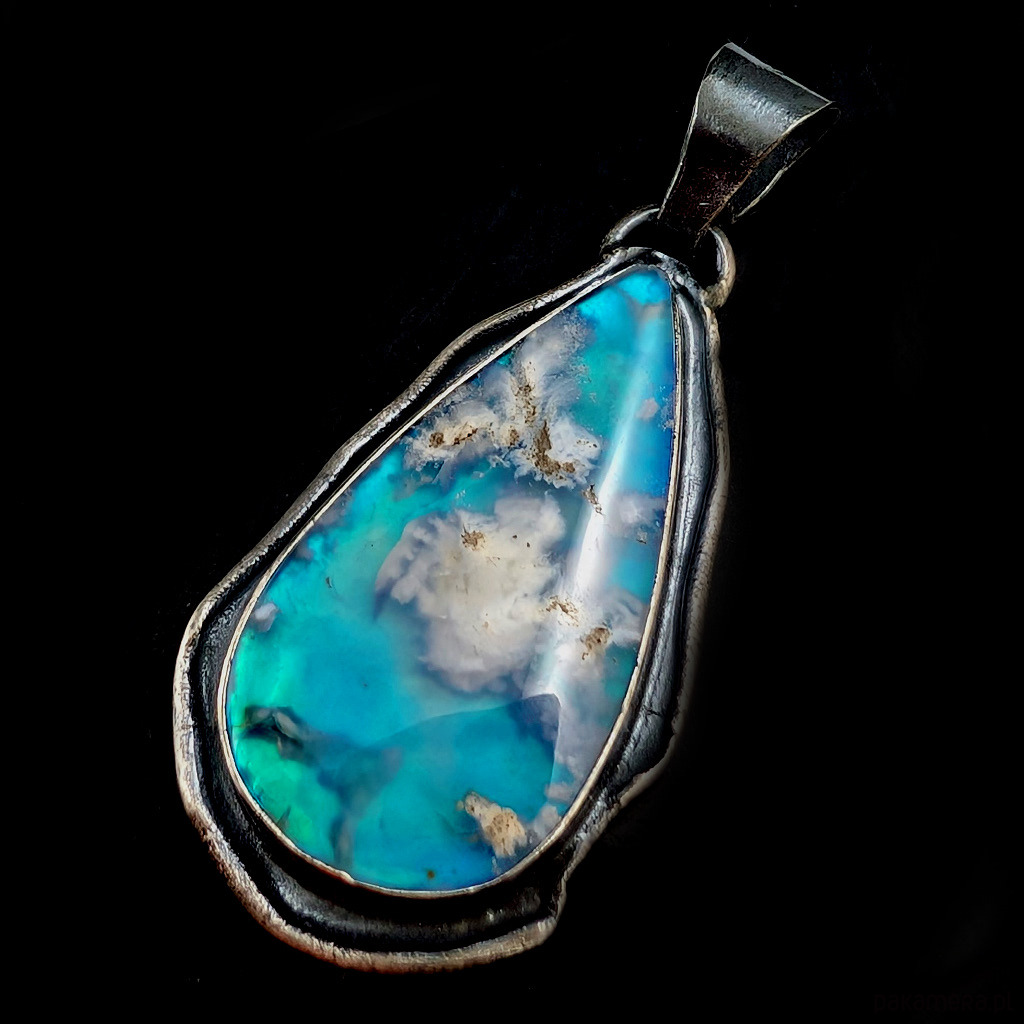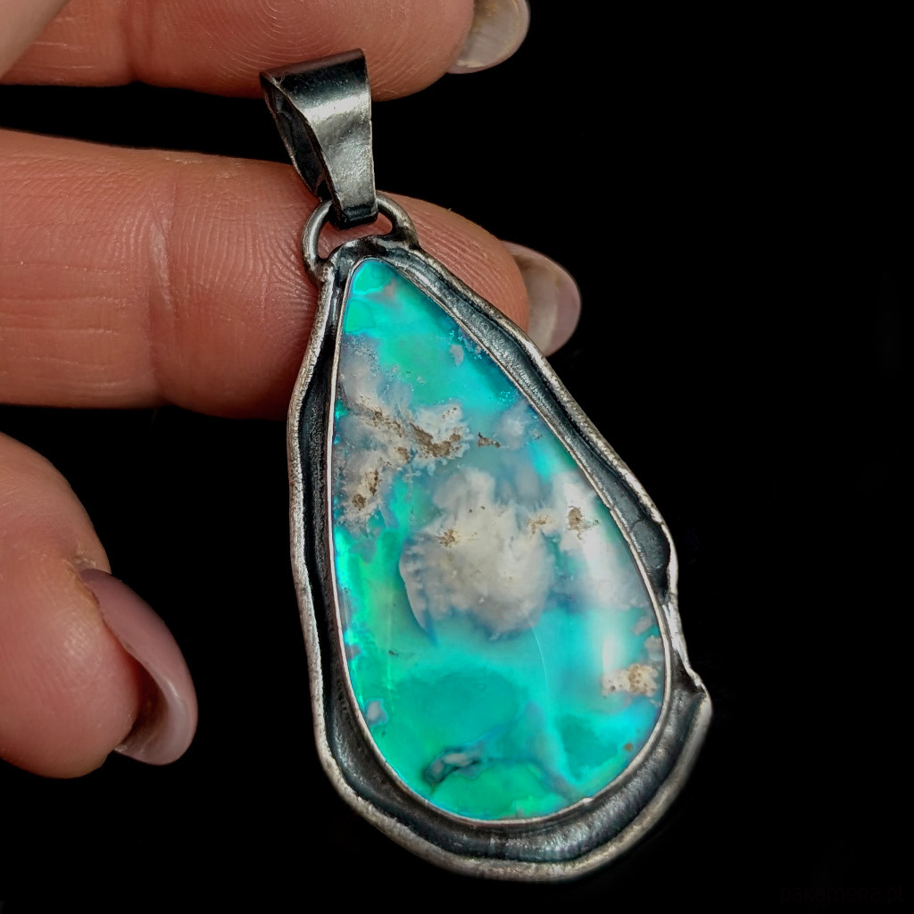 Eteryczny wisior z oprawionym w oksydowane srebro pr.925 przepięknym dubletem agatu mszystego i żywicy. Transparentna tafla w kolorze neonowego turkusu pod odpowiednim kątem staje się zielona. Przepiękny! Wymiary oprawy 40 x 23 mm. Długość z krawatką 52 mm. Waga wisiora 9,5 g. Bardzo polecam Wisior zostanie zapakowany w ozdobne pudełeczko.