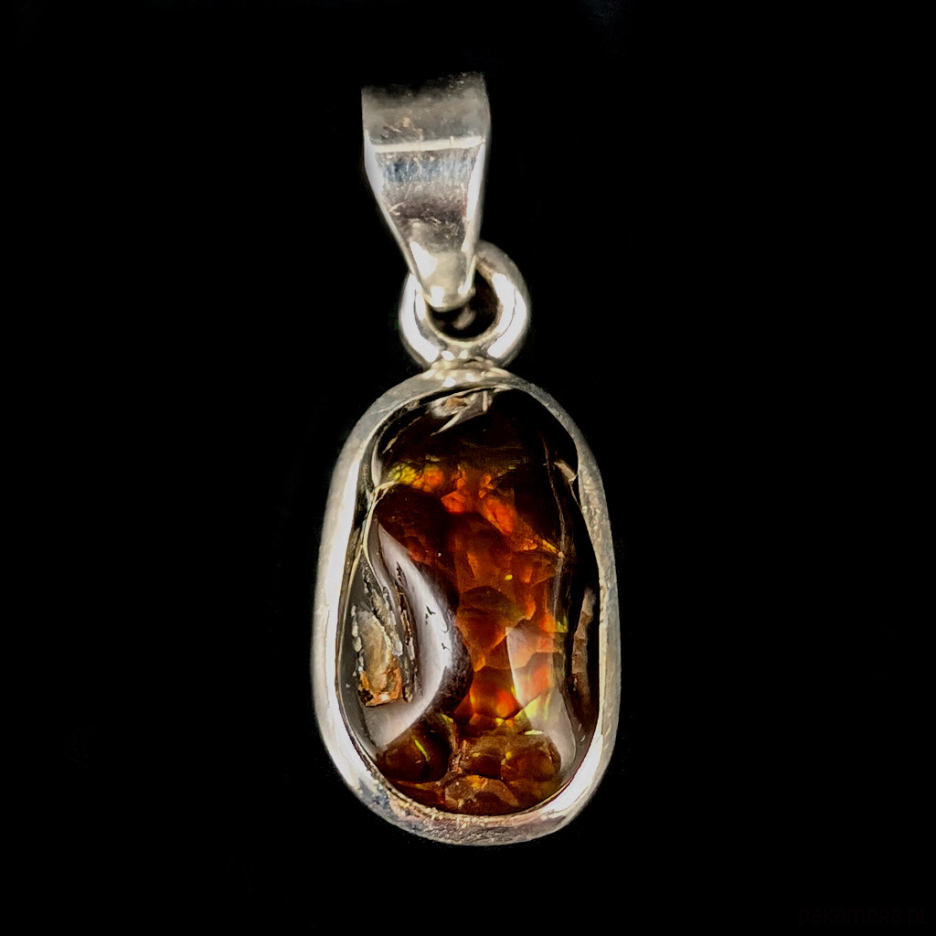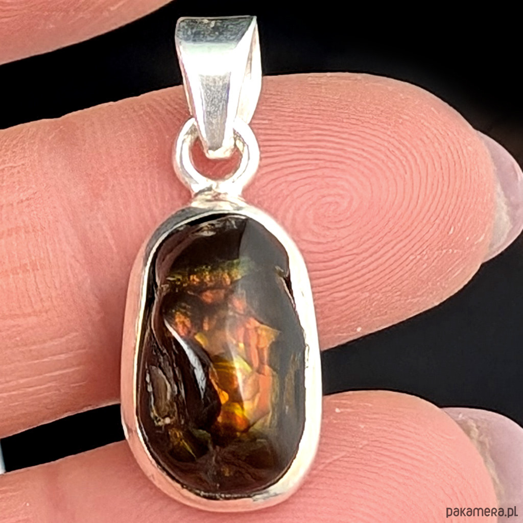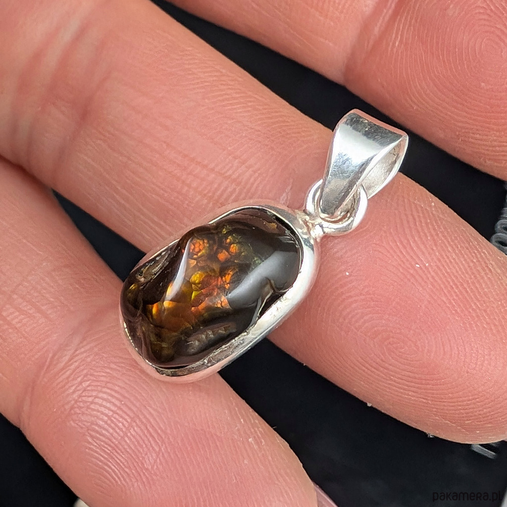 Rzadka, drogocenna odmiana agatu, tzw. agat ognisty. Niesamowite zjawisko iryzacji o podobnej do opalu czy ammolitu grze barw, która powstaje wskutek ugięcia i załamania światła na wrostkach żelaza. Tafla wyglądająca nieco jak smocza skóra. Kamień jest oprawiony w srebro próby 925. Wymiary oprawy 16 x 10 mm, długość z krawatką 26 mm. Waga 3,3 grama. Polecam unikatowy kamień. Wyrób wykonany przez dostawcę kamieni. Wisiorek zostanie zapakowany w eleganckie pudełeczko.