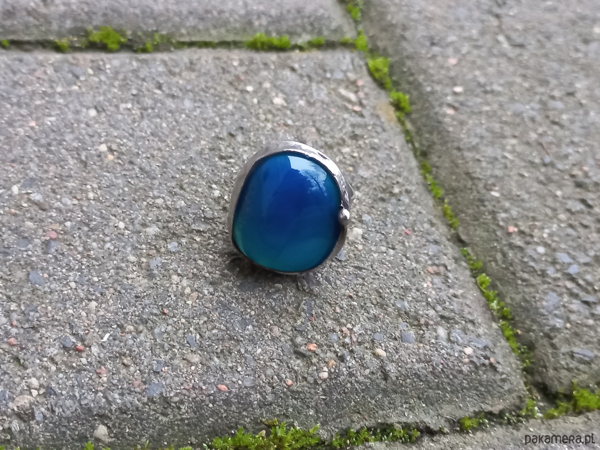 Pierścionek wykonany z miedzi, cyny i agatu. Wymiary ok. 2 na 2 cm. Regulowany. Nie jest ciężki.
