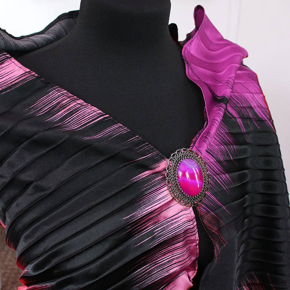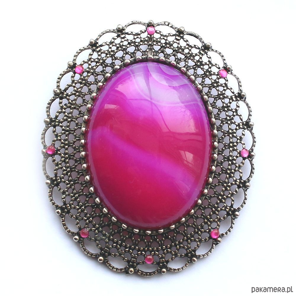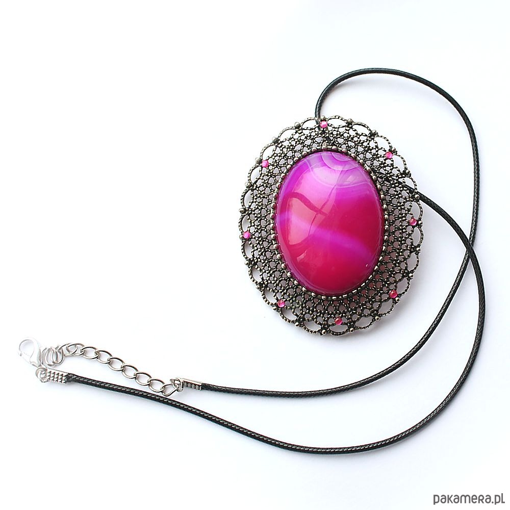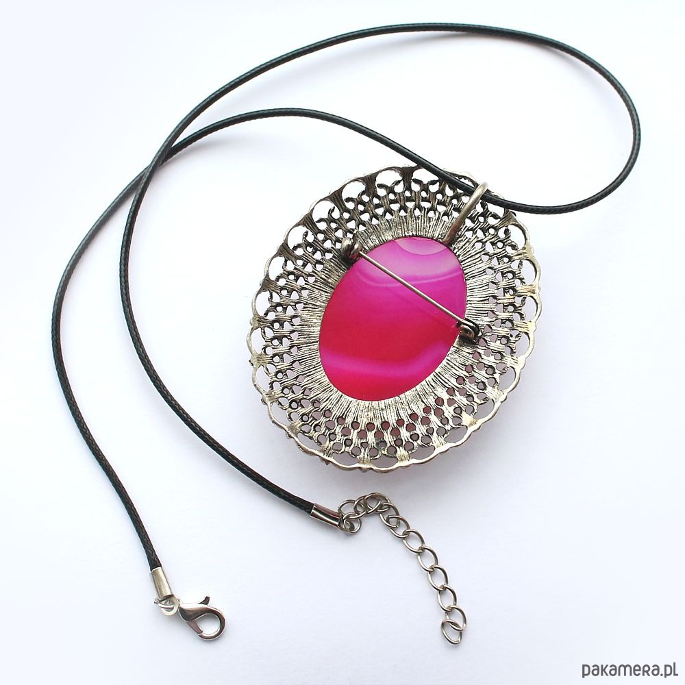 Duży efektowny broszko-wisior kameliowy z pięknym agatem różowym na stylowej ażurowej bazie w odcieniu antycznego srebra, stop cynku i miedzi bez ołowiu i kadmu, ozdobionej fuksjowymi cyrkonikami. W komplecie rzemyk z eko skórki z przedłużką zapinany na karabińczyk.