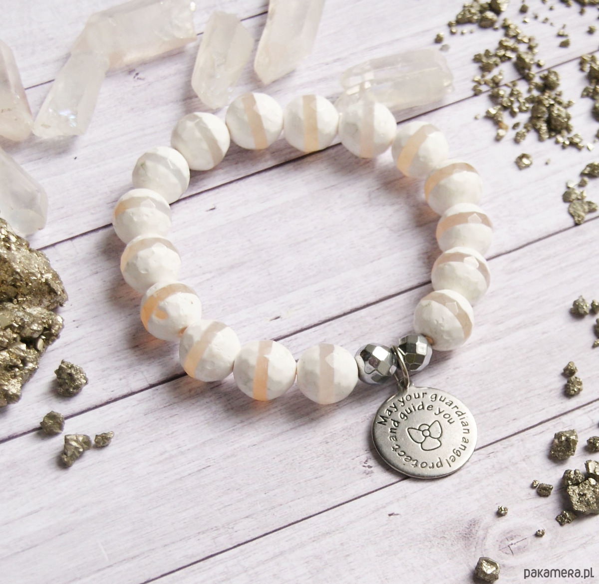 TUTAJ: urocza, anielska bransoletka. wykonana z kul fasetowanego agatu tybetańskiego (12mm), kul fasetowanego hematytu i zawieszki ze STALI SZLACHETNEJ (nie uczula, kolor nie ściera się) - napis: may your guardian angel protect and guide you.... kamienie na solidnej lince elastycznej....