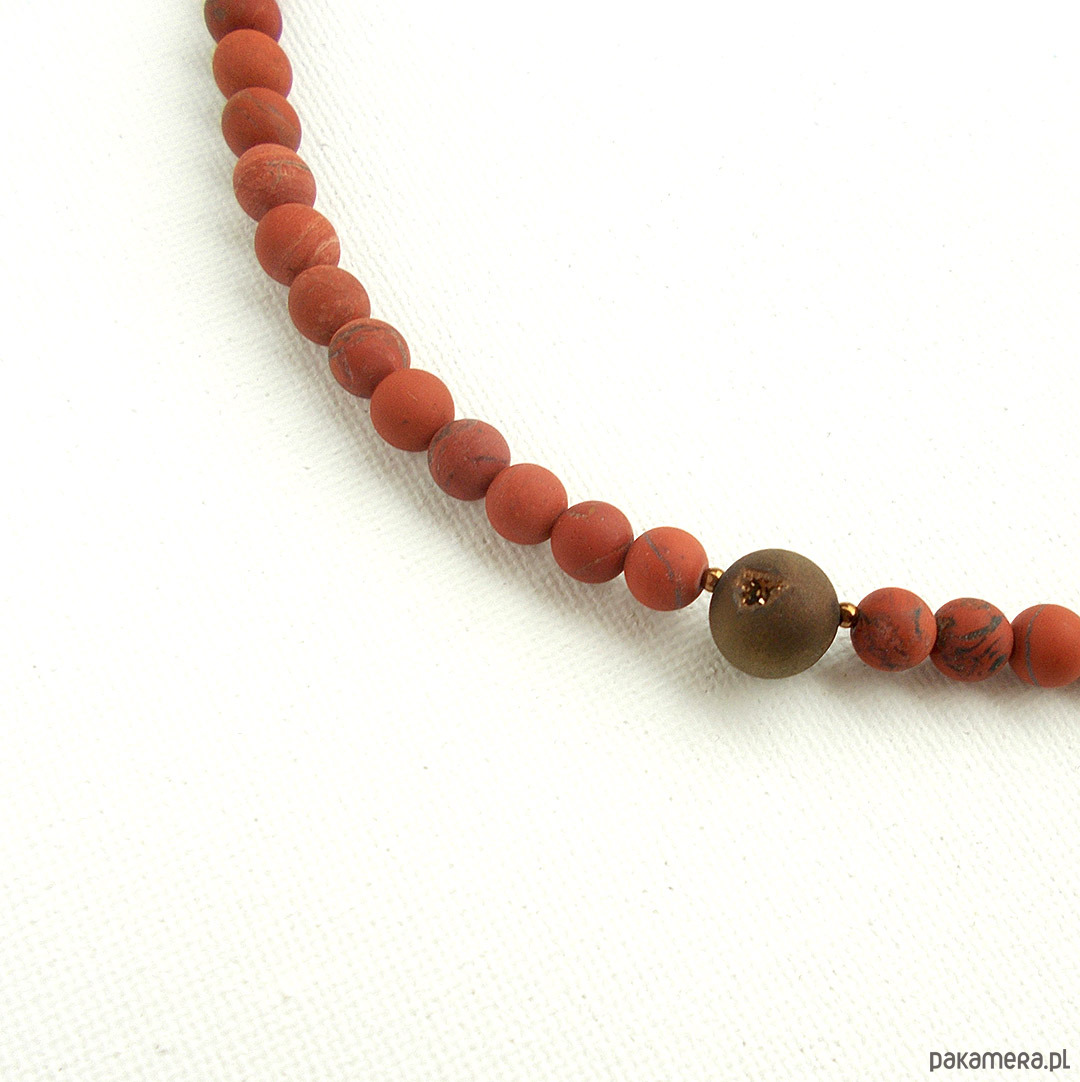 Naszyjnik z kamieniami królewskiego jaspisu i asymetrycznie umieszczonym kamieniem agatu z widoczną druzą
