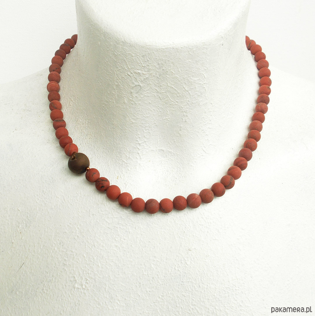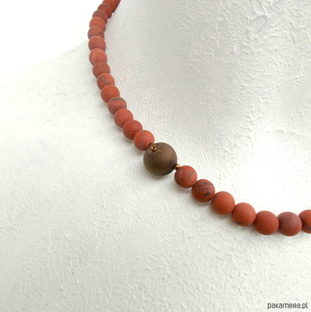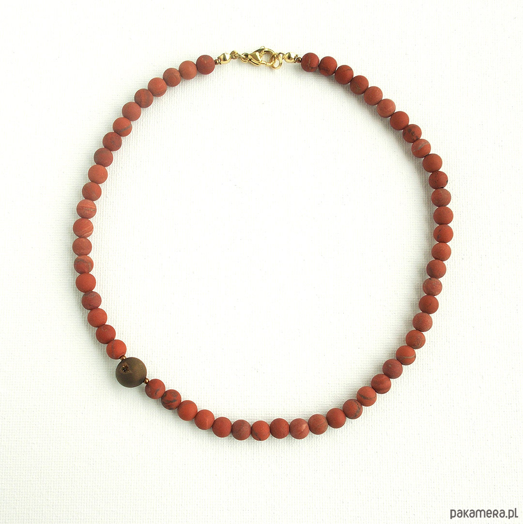 Naszyjnik z kamieniami królewskiego jaspisu i asymetrycznie umieszczonym kamieniem agatu z widoczną druzą