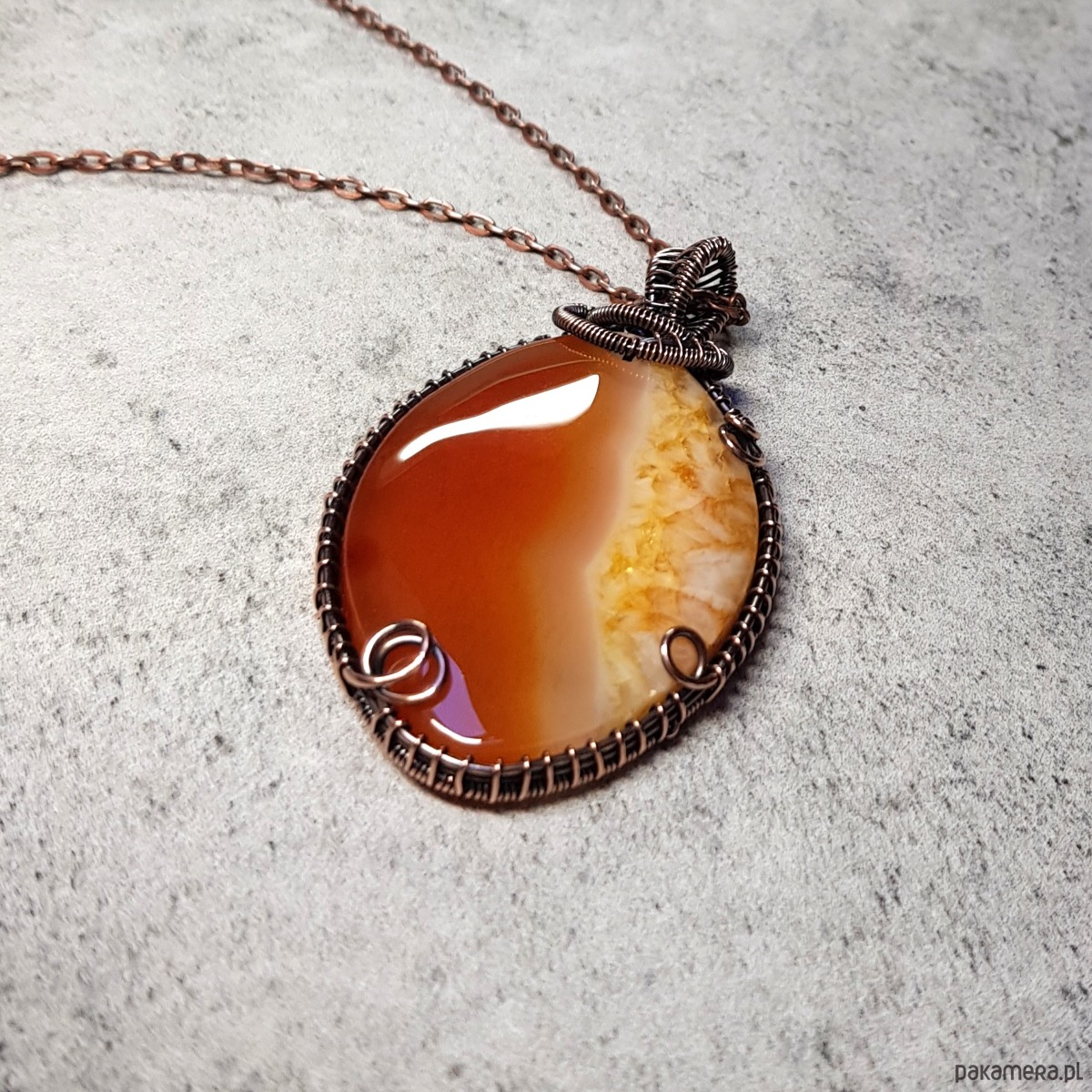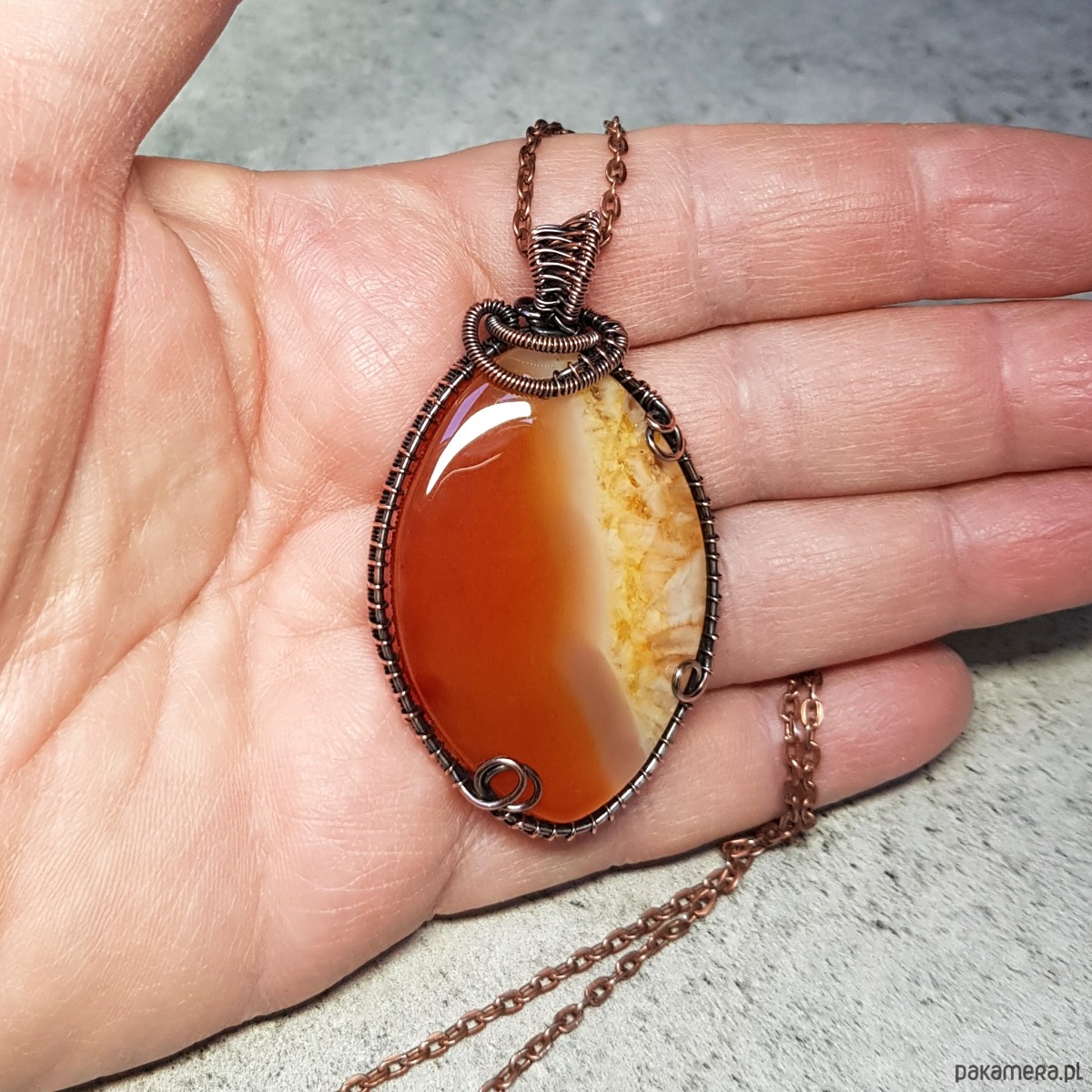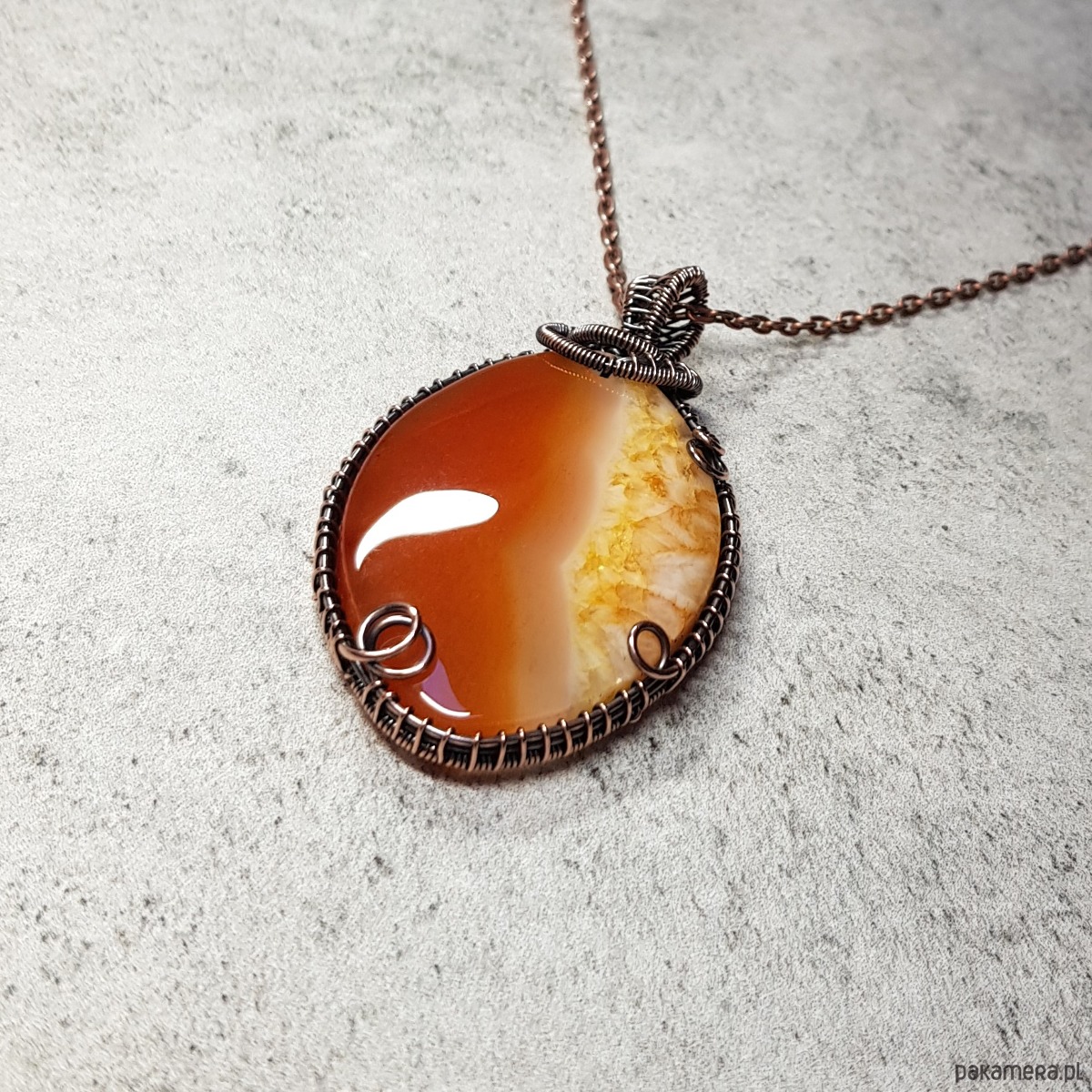 Naszyjnik zrobiony ręcznie w miedzi pracochłonną techniką wire-wrappingu którego głównym elementem jest ciekawy, trójkolorowy agat z kryształem. Pomarańcz w kamieniu jest spokojna, ceglasta, żółty również spokojny w miodowej tonacji, biel mleczna. Wymiary zawieszki 58x34 mm, do zawieszki na życzenie dodaję bezpłatnie łańcuszek długości 45-50cm. Wisiorek jest oksydowany i następnie wypolerowany w celu uzyskania szlachetnego efektu postarzenia.