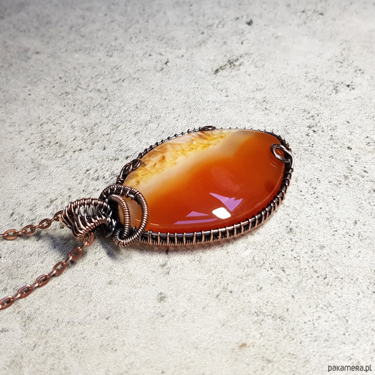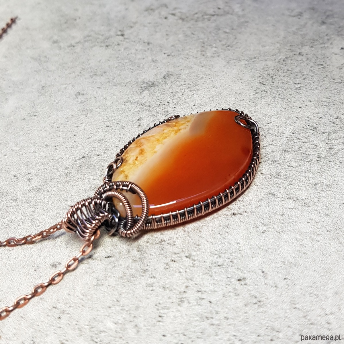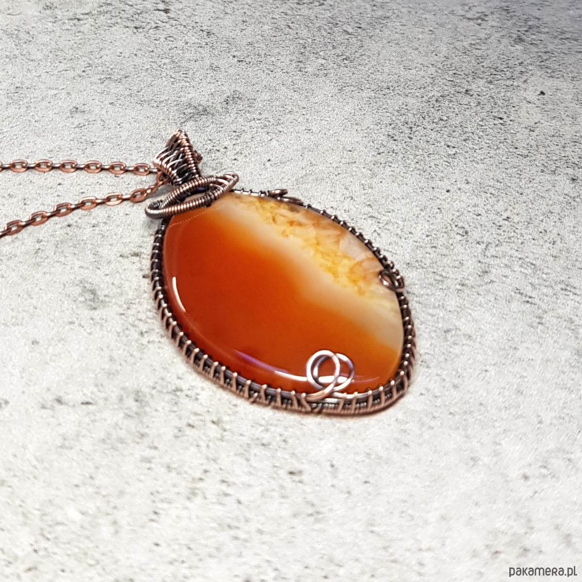 Naszyjnik zrobiony ręcznie w miedzi pracochłonną techniką wire-wrappingu którego głównym elementem jest ciekawy, trójkolorowy agat z kryształem. Pomarańcz w kamieniu jest spokojna, ceglasta, żółty również spokojny w miodowej tonacji, biel mleczna. Wymiary zawieszki 58x34 mm, do zawieszki na życzenie dodaję bezpłatnie łańcuszek długości 45-50cm. Wisiorek jest oksydowany i następnie wypolerowany w celu uzyskania szlachetnego efektu postarzenia.