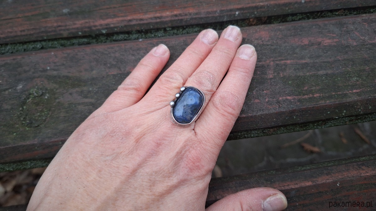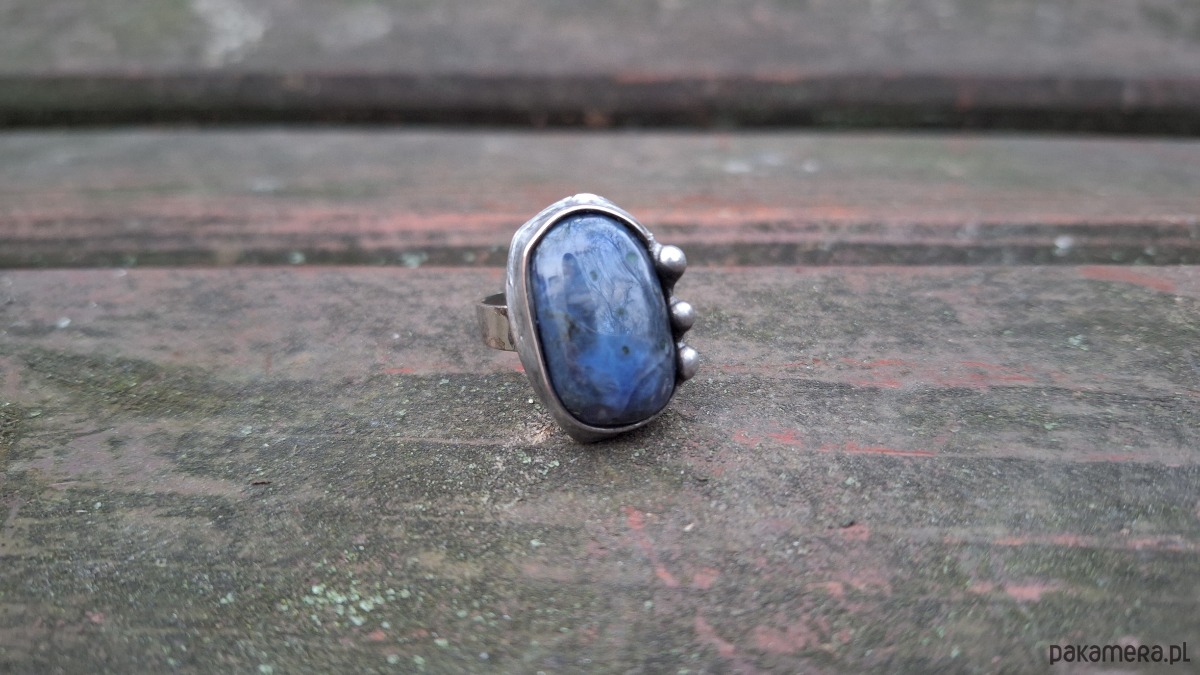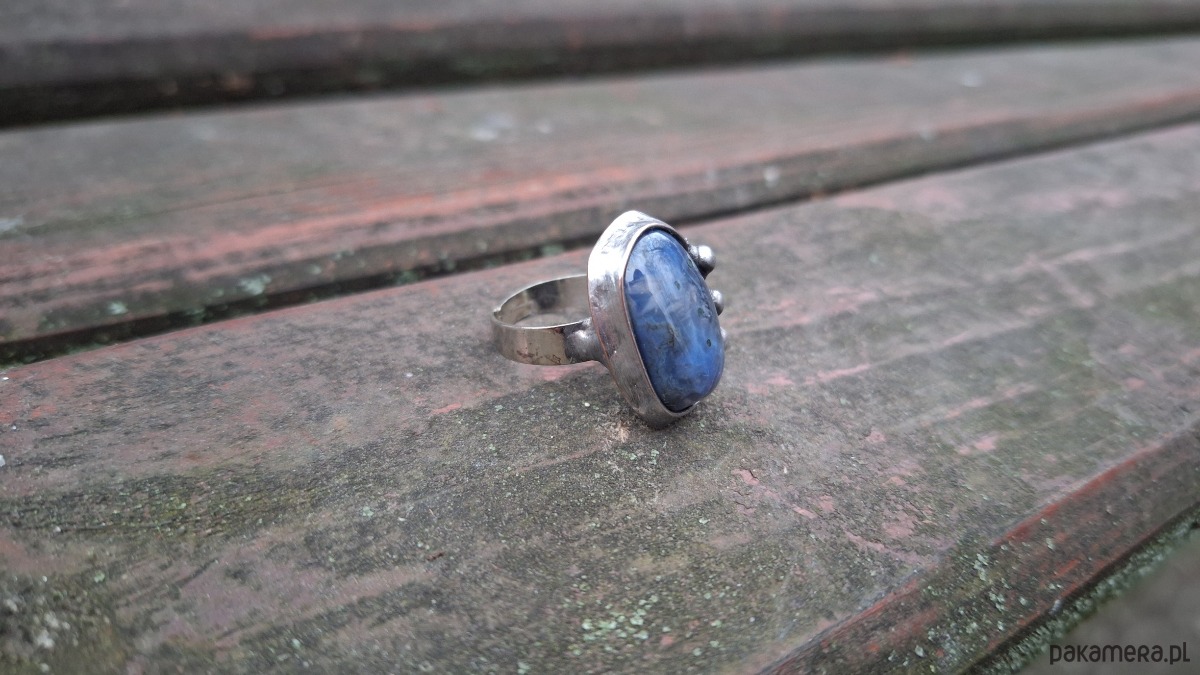 Pierścionek wykonany z miedzi, cyny i agatu. Wymiary ok. 2 na 1.5 cm. Regulowany. Nie jest ciężki.